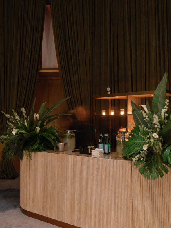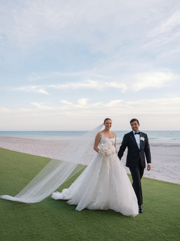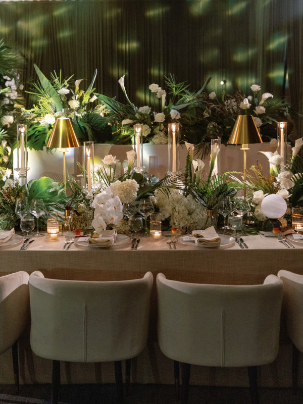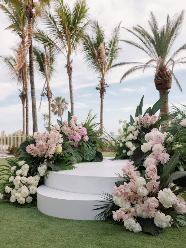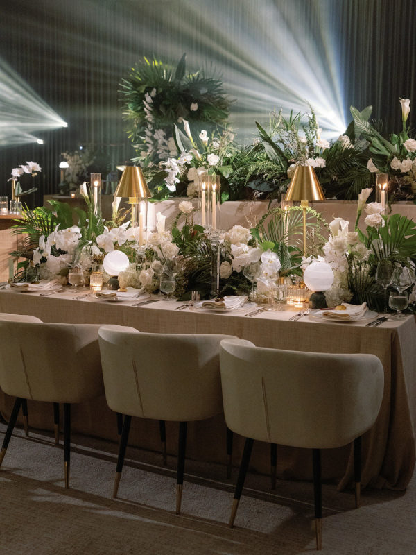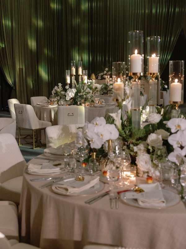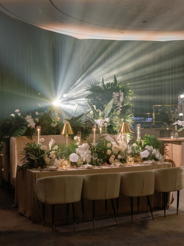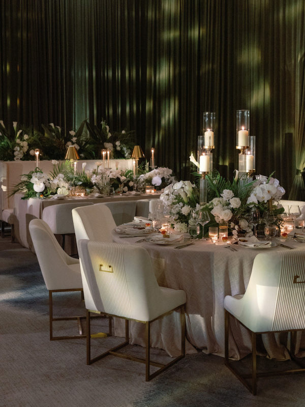 The design seamlessly transitioned from airy coastal romance to modern, moody sophistication. The ceremony featured a lush blend of white and soft pink blooms paired with palm fronds and Monstera leaves, framed by the dreamy blue waters of the Gulf. As guests entered the reception, the atmosphere shifted into a rich and intimate setting. Floor-to-ceiling draping in deep forest green created a dramatic backdrop, while the warm, ambient lighting by Fyerfly Productions added a sense of depth and glow. The custom-wrapped dance floor served as the visual centerpiece of the evening. The floral story continued through the reception with tropical white orchids and roses surrounded by sculptural greenery.