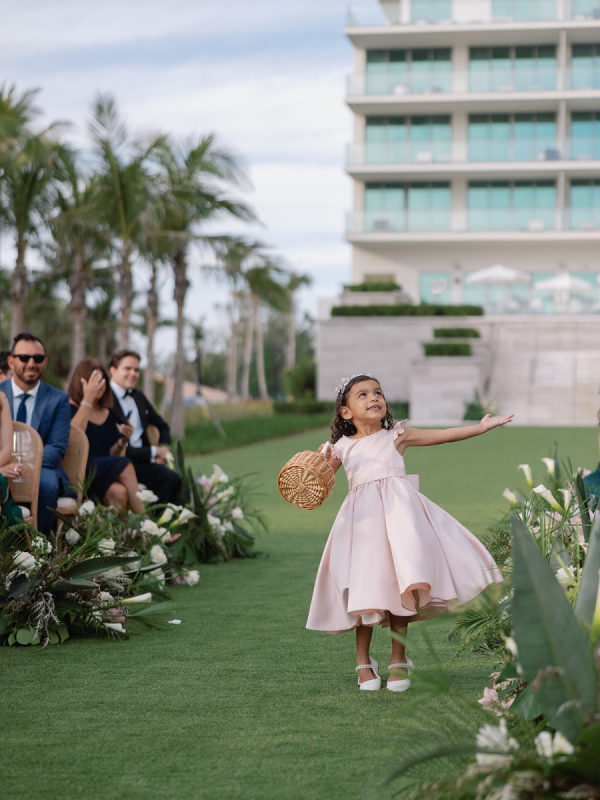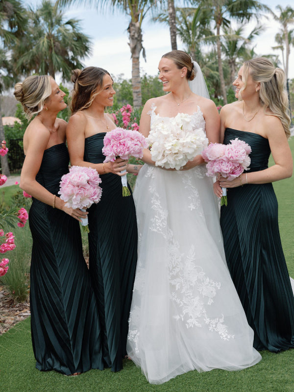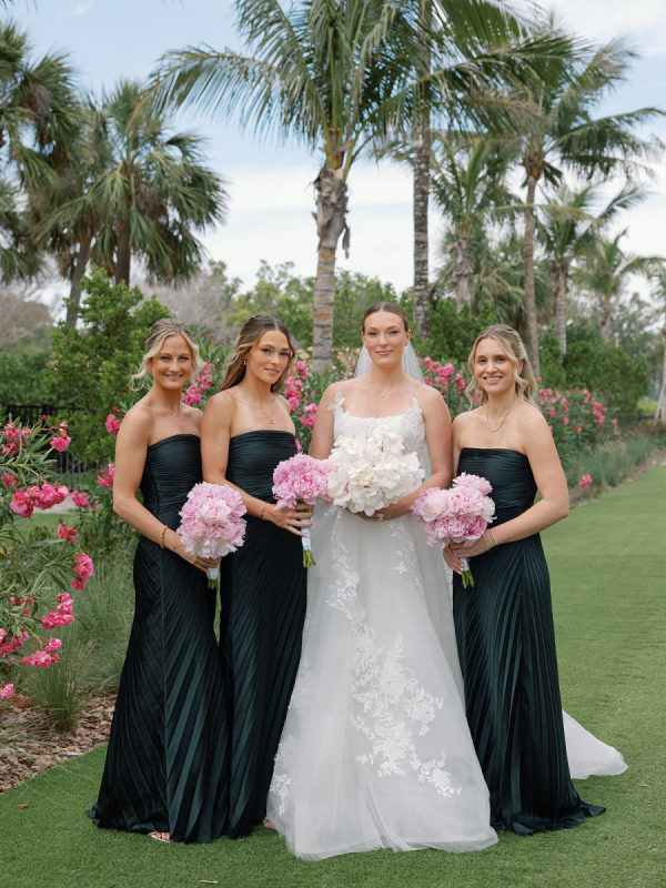 To further the narrative of tropical meets classic, the bridesmaids wore black dresses that allowed the elements around them to truly pop!