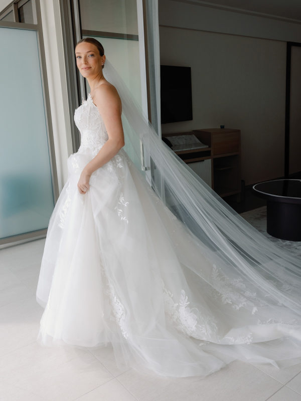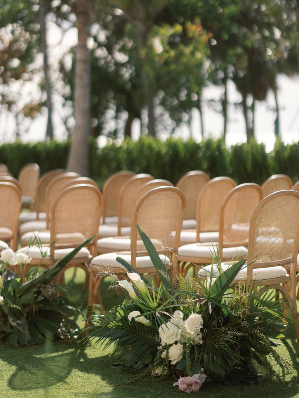 [field title=”Wedding Gown”]Ashley’s Mark Ingram gown beautifully reflected the tropical and floral energy displayed throughout the wedding weekend. It held a nice balance of classic charm and modern sophistication that the overall design carried throughout. [/field]