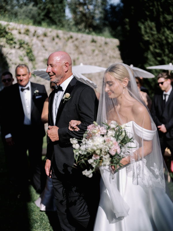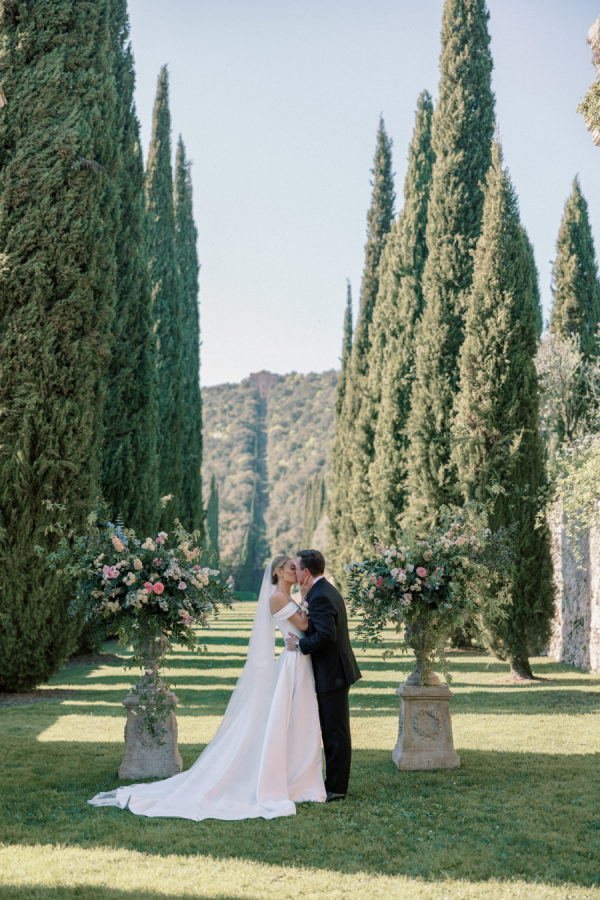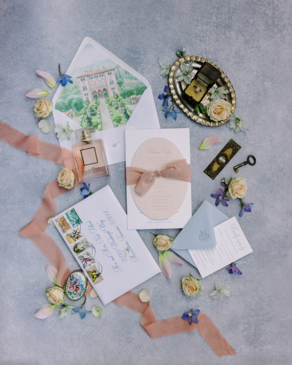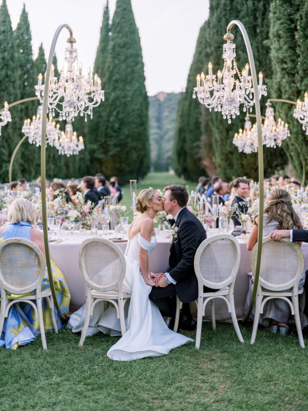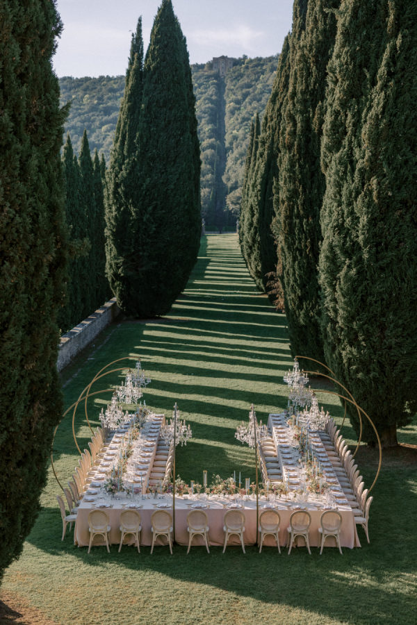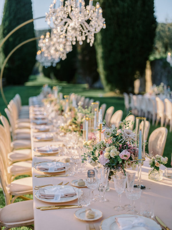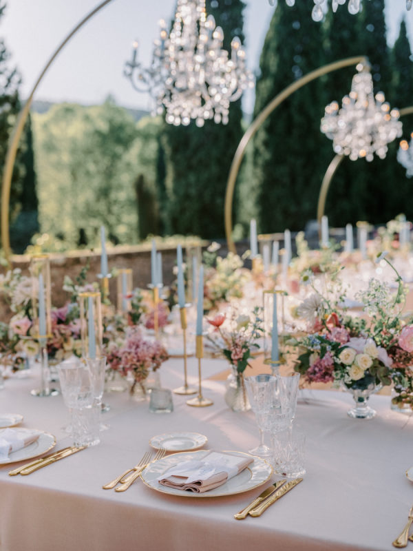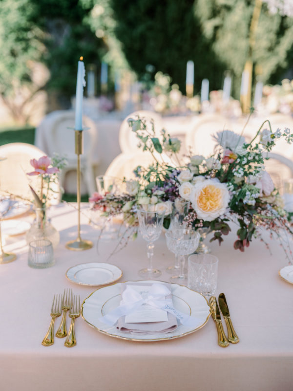 Floral arrangements were thoughtfully curated to echo the soft, romantic tones, with seasonal blooms, creating an atmosphere of refined elegance. “In my mind, the main objective was to not detract from the natural beauty and balance of the villa. I jokingly told my mom I didn’t want any florals because Cetinale is so beautiful, we didn’t need them. That being said, we chose florals that complemented and blended with Cetinale’s charm. “Timeless elegance” was a phrase often repeated throughout our conversations about dreams for our big day. Maintaining the authenticity of the region and the Villa was extremely important to us. Because this was our focus, I think the decor was our twist on that golden era. I wanted to maintain the old world charm and elegance that could have been missed with an outdoor reception, so we opted for a lot of crystal and gold for an elegant but airy feel. Finally, the florals we chose were in varying shades of pinks with pops of blue and greenery with wide variation in size and texture of the surrounding area.” – Shelby, the bride.