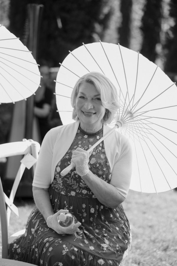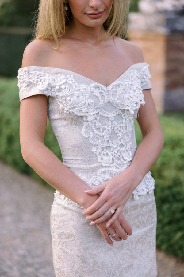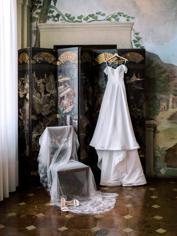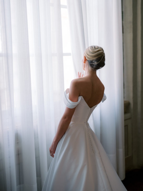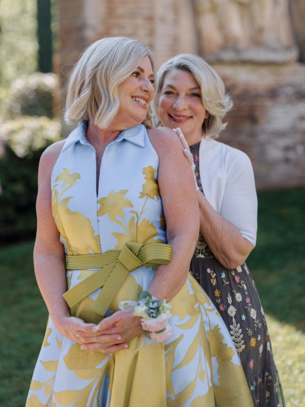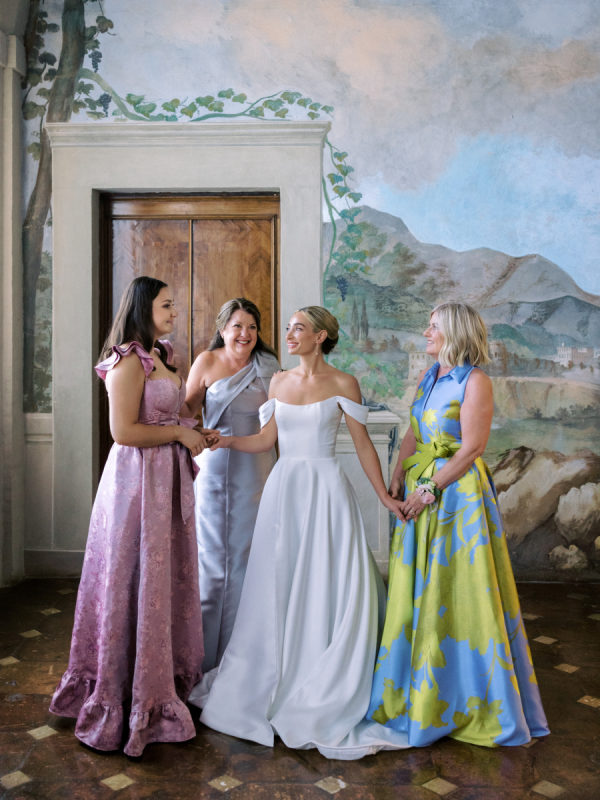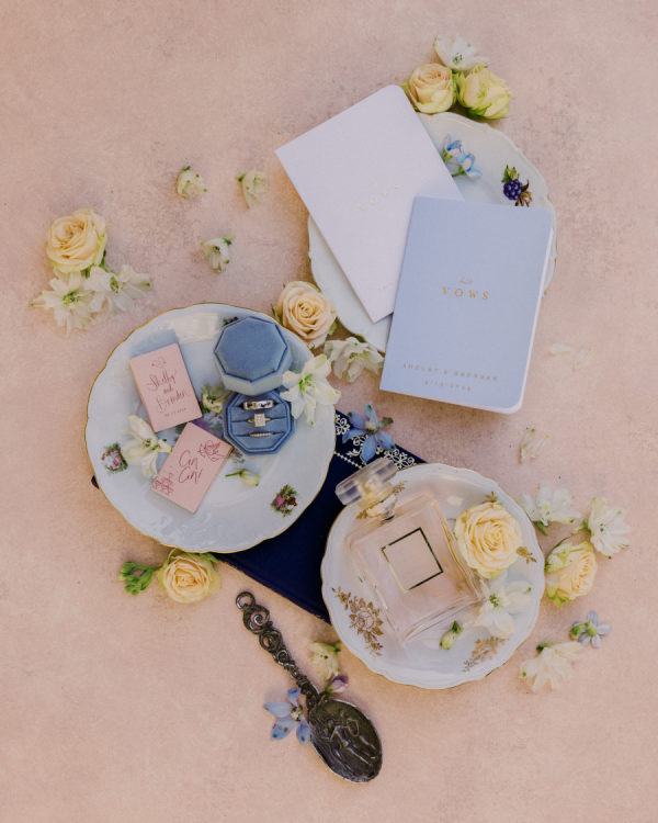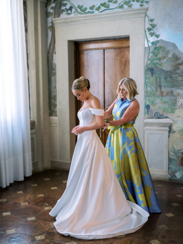 Floral arrangements were thoughtfully curated to echo the soft, romantic tones, with seasonal blooms, creating an atmosphere of refined elegance. “In my mind, the main objective was to not detract from the natural beauty and balance of the villa. I jokingly told my mom I didn’t want any florals because Cetinale is so beautiful, we didn’t need them. That being said, we chose florals that complemented and blended with Cetinale’s charm. “Timeless elegance” was a phrase often repeated throughout our conversations about dreams for our big day. Maintaining the authenticity of the region and the Villa was extremely important to us. Because this was our focus, I think the decor was our twist on that golden era. I wanted to maintain the old world charm and elegance that could have been missed with an outdoor reception, so we opted for a lot of crystal and gold for an elegant but airy feel. Finally, the florals we chose were in varying shades of pinks with pops of blue and greenery with wide variation in size and texture of the surrounding area.” – Shelby, the bride.