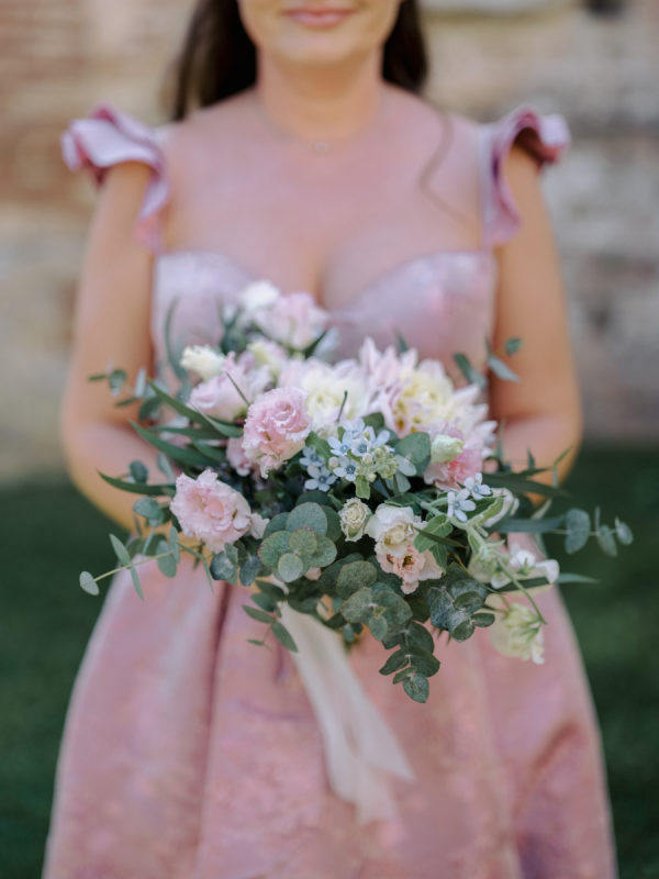 The color palette of light purple, blush, dusty pink, ivory, soft blue, green, and white added a radiant touch, complementing the natural splendor of Tuscany.