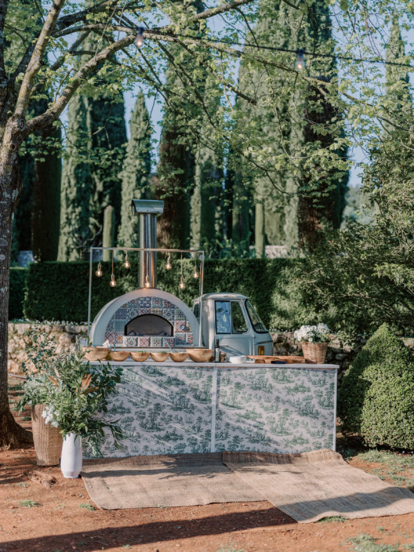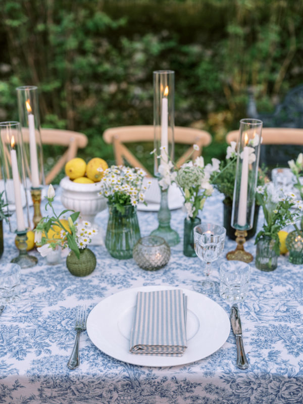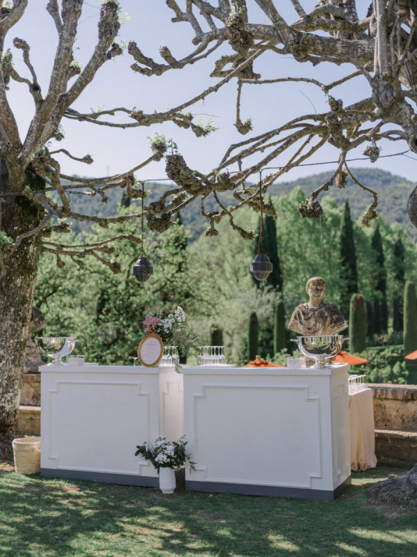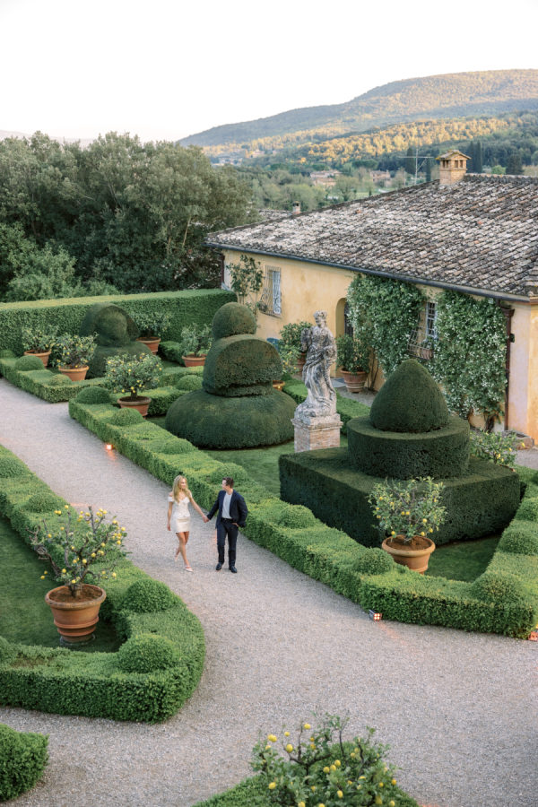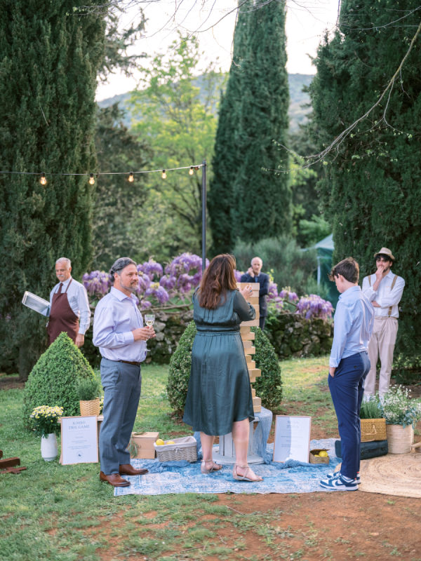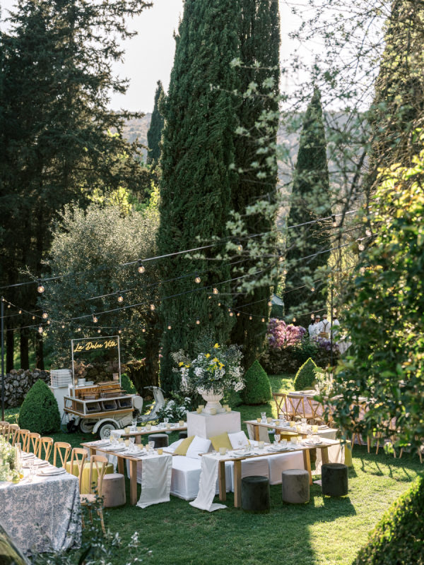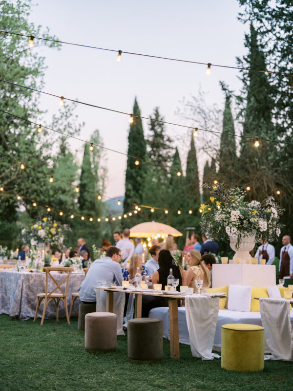 Welcome party inspiration: The welcome party was an informal, convivial evening, but far from ordinary. The protagonists were yellow, white, hints of blue, chamomile, and stone elements—all in perfect harmony with Cetinale and its Citrus Garden. “For us, the most important objective of the welcome party was fun! This was the first time many of our loved ones met, so we wanted it to be a casual and playful event. Again, capturing the spirit of Cetinale was so important to us. We hosted the welcome party in the citrusgardenn so the decor consisted of baskets of lemons, crisp white flowers, and blue toile tablecloths for contrast. To create a casual vibe, we chose to incorporate vintage bocce, badminton, delicious pizza and gelato trucks, and plenty of beer, spritz, and prosecco, along with an authentic Tuscan band under strings of light.” – Shelby, the bride