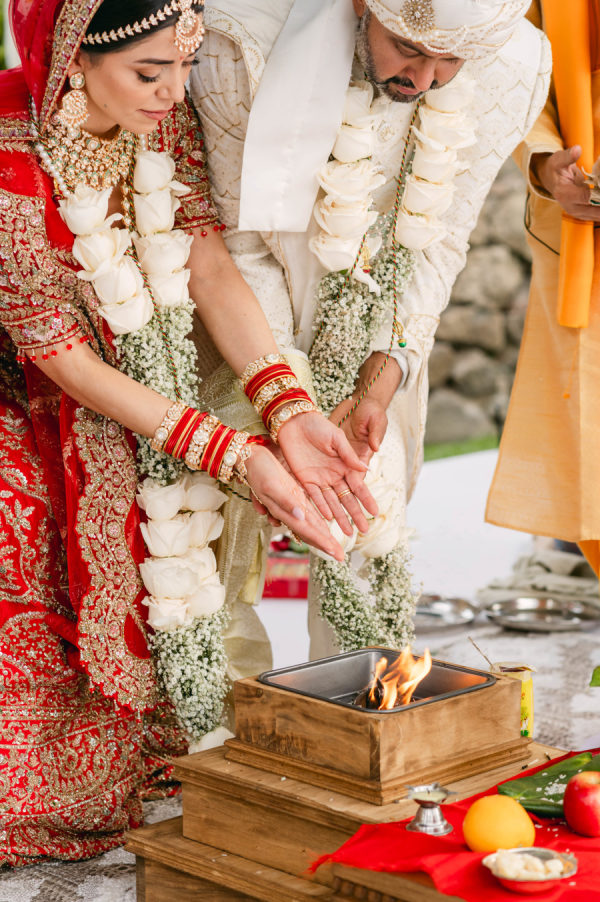 Groom’s attire is made-to-measure Brunello Cucinelli. Hindu: the bride and groom attire custom pieces from Nazranaa