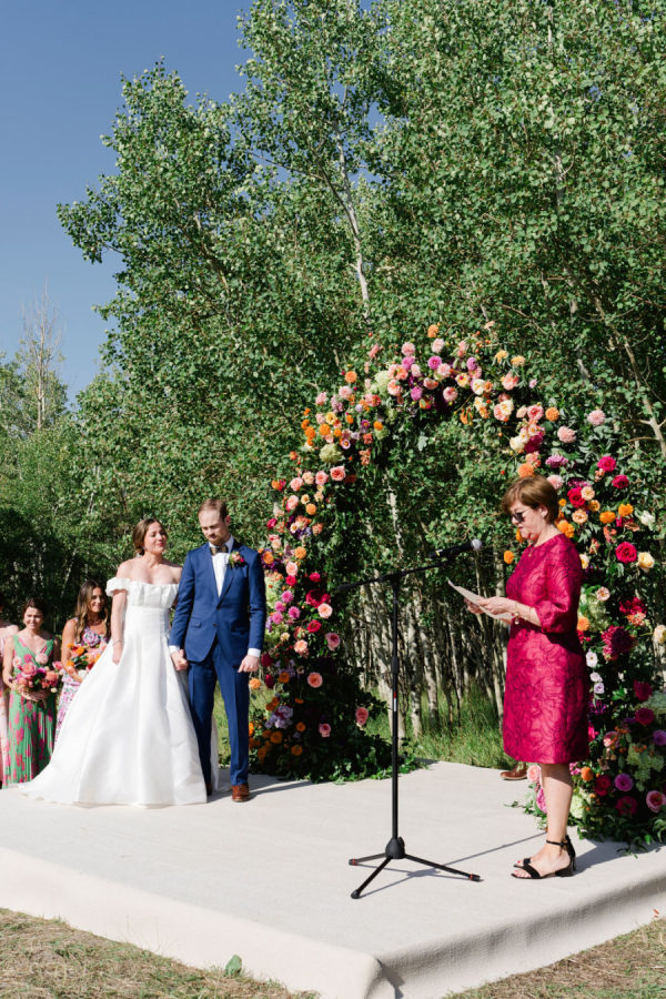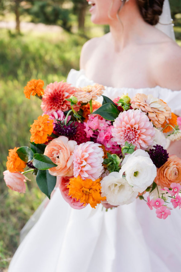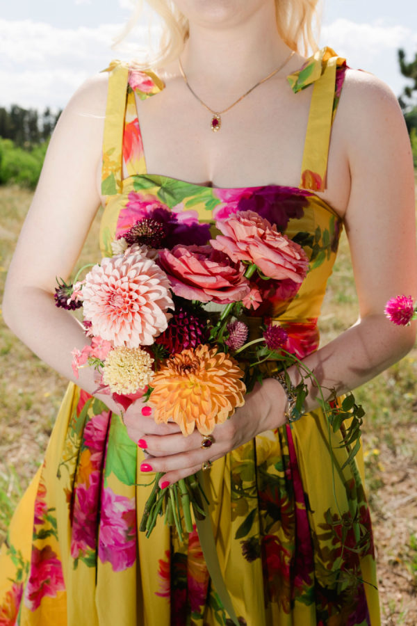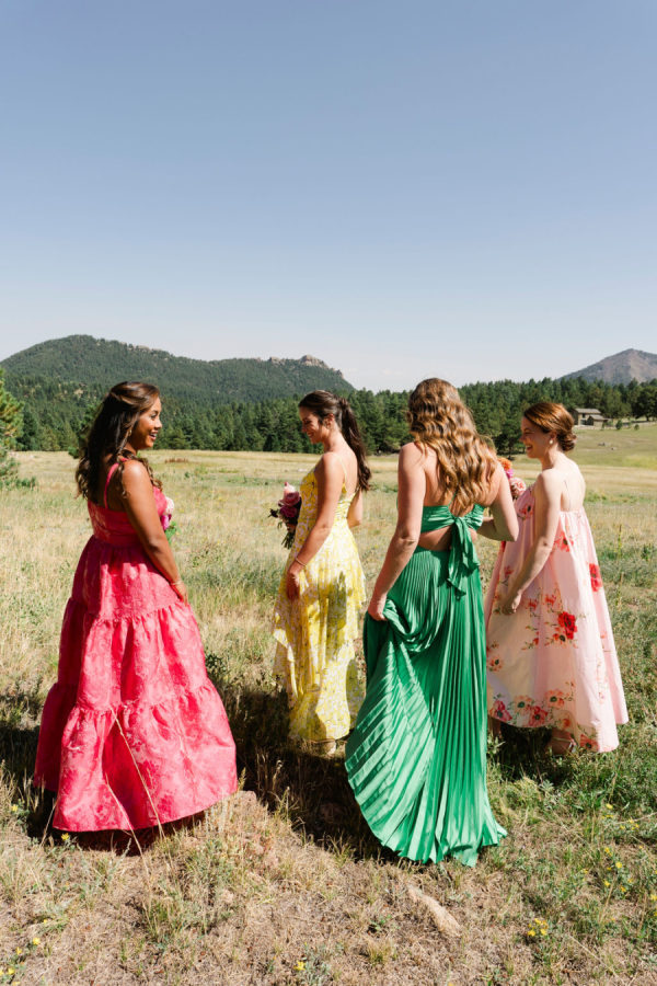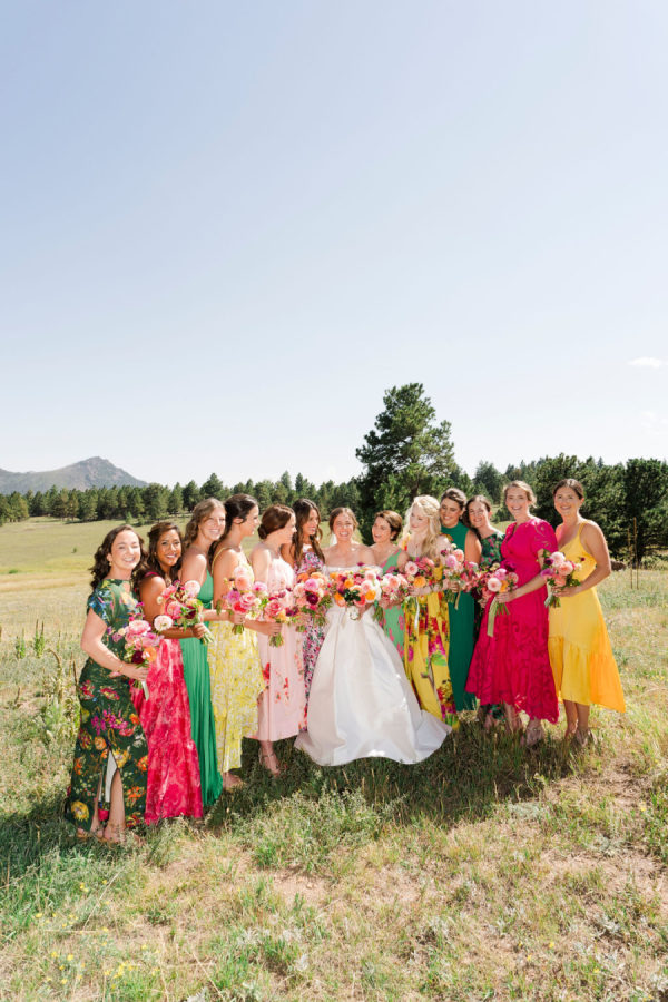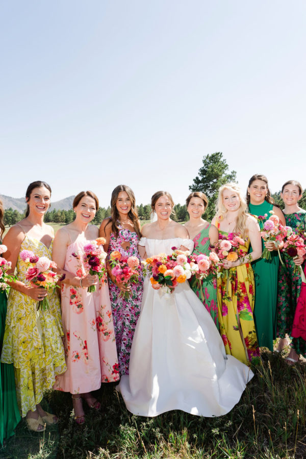 Bridesmaids wore a mix of floral and bold-colored gowns, creating a painterly, joyful palette that echoed the lush blooms.