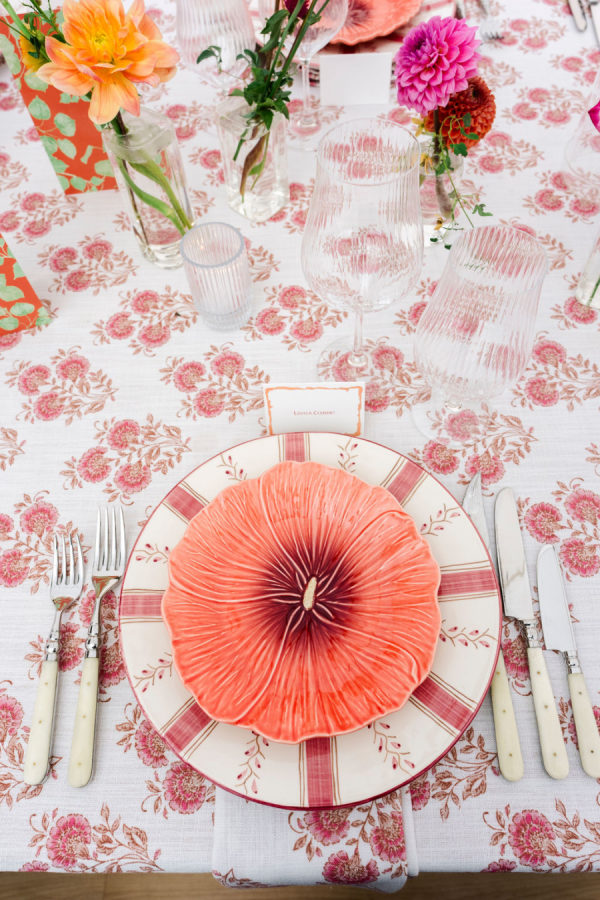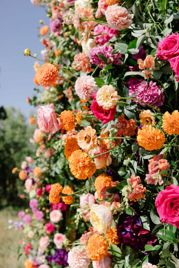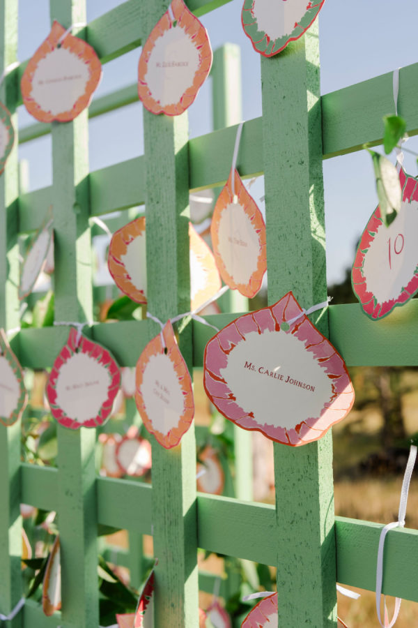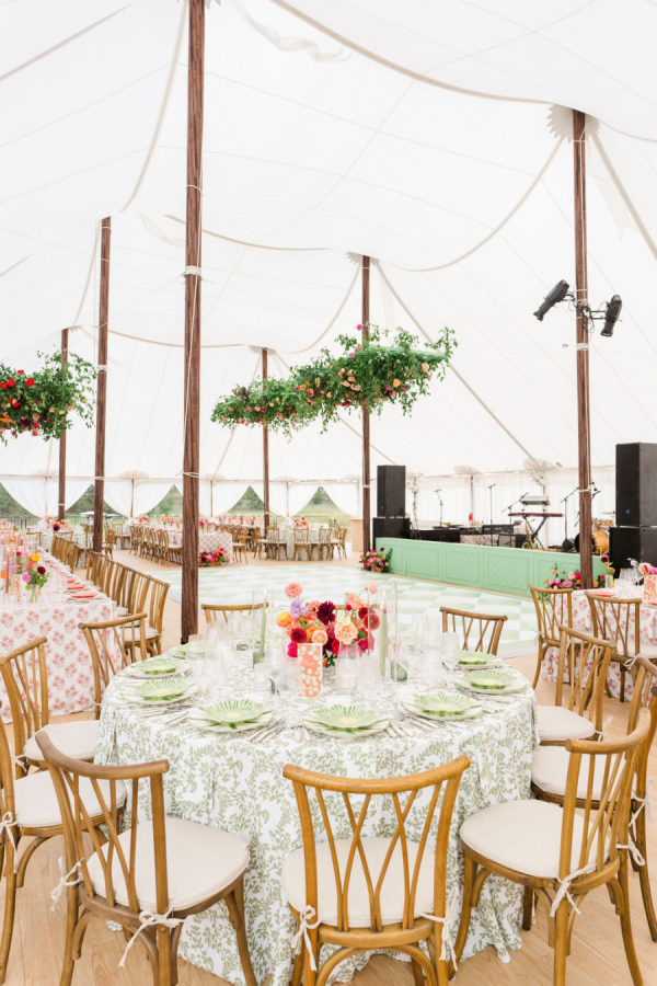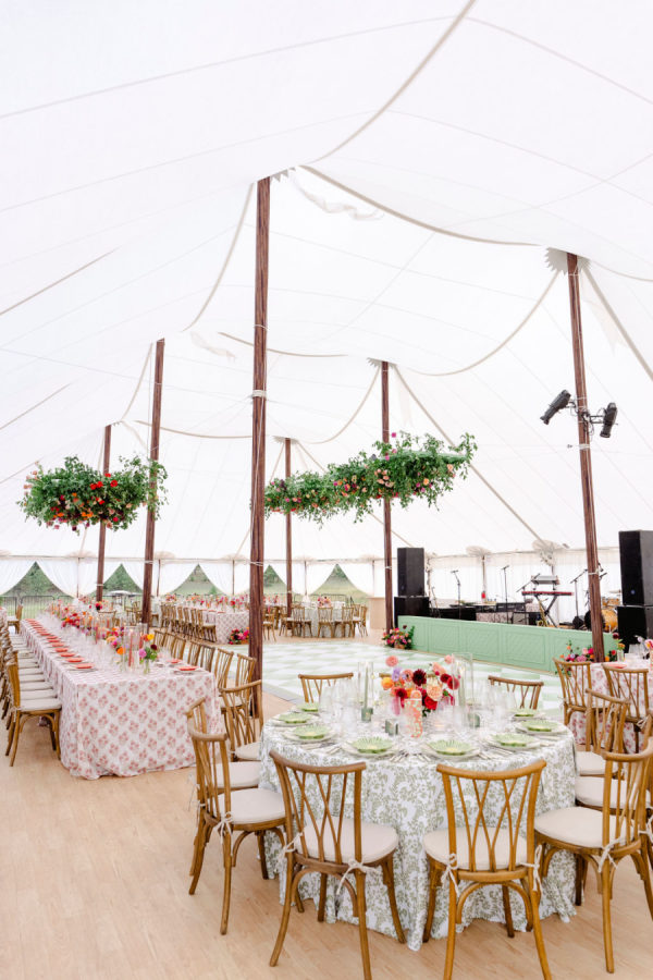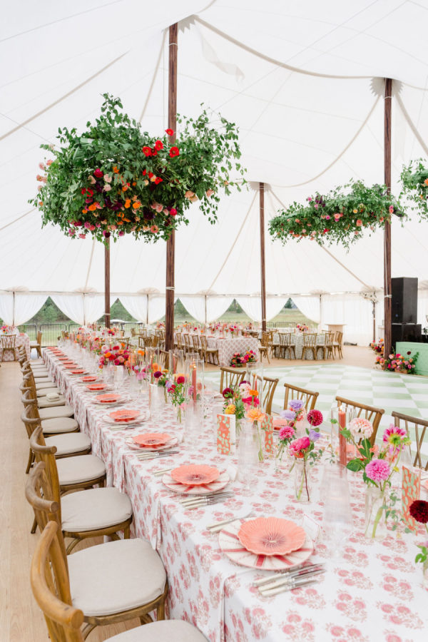 [field title=”Florals & Decor”]Lush florals in bold, saturated hues adorned the ceremony arch, seating chart, and reception, while patterned linens and playful plateware brought the garden party indoors under the tent.[/field]