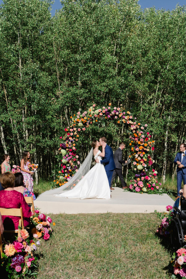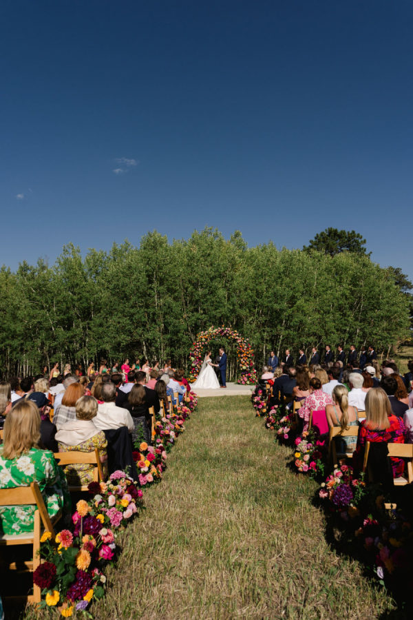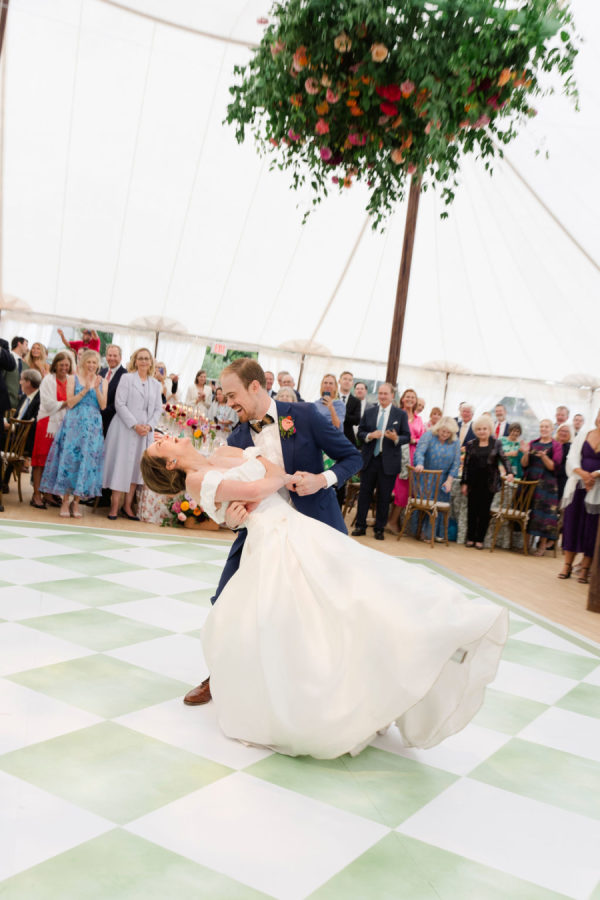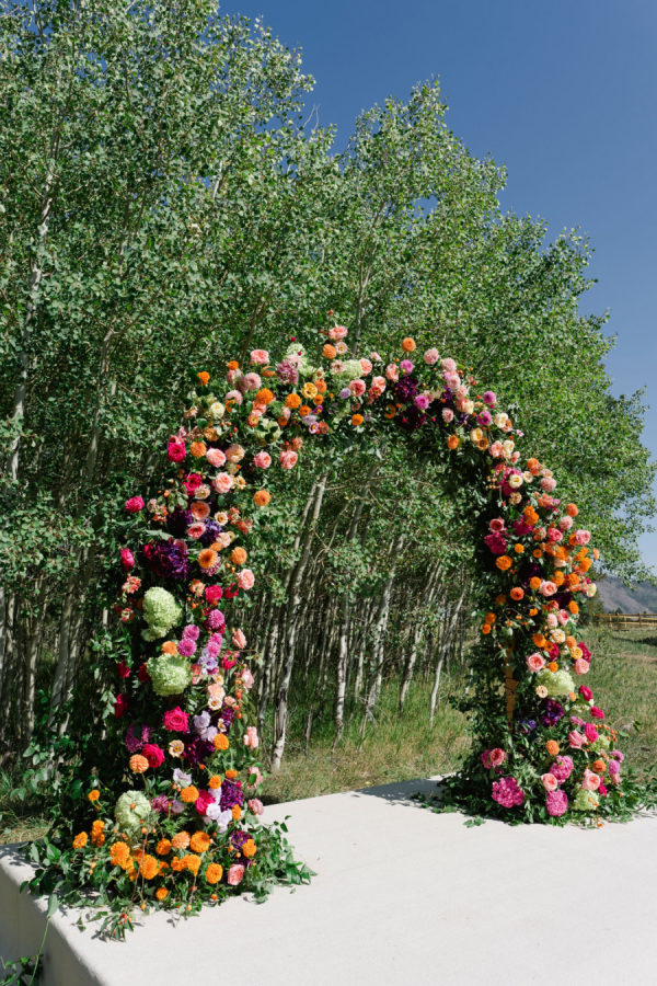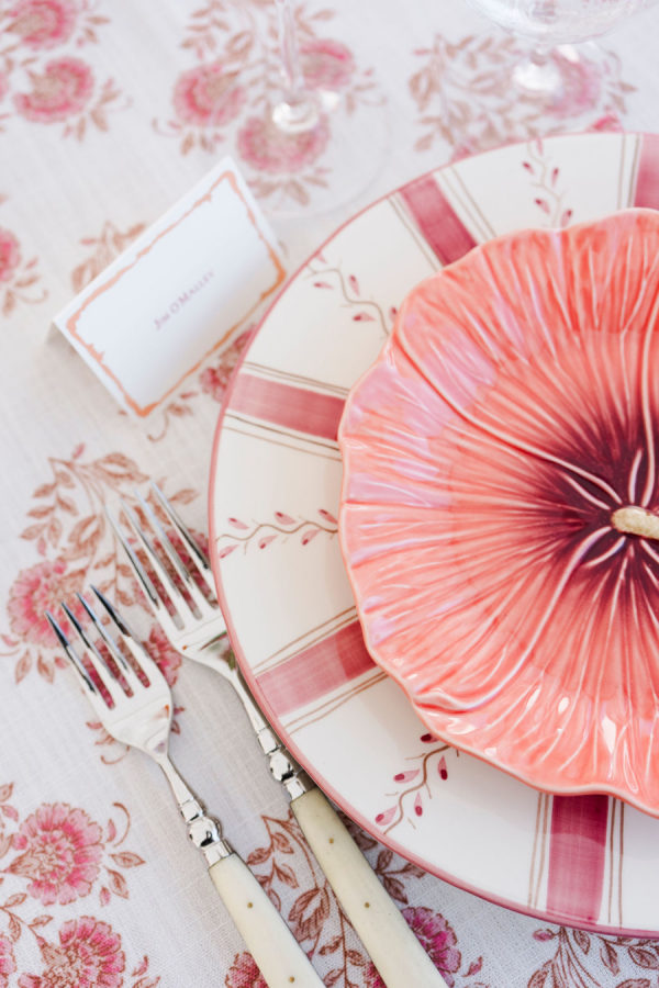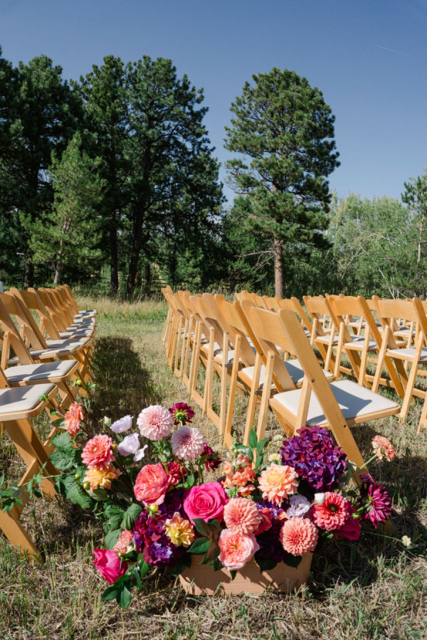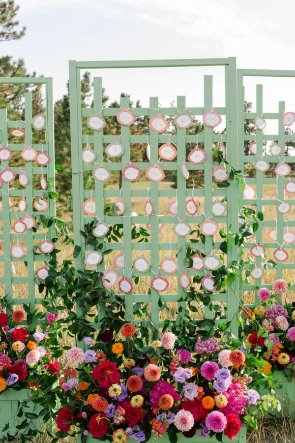 [field title=”Florals & Decor”]Lush florals in bold, saturated hues adorned the ceremony arch, seating chart, and reception, while patterned linens and playful plateware brought the garden party indoors under the tent.[/field]