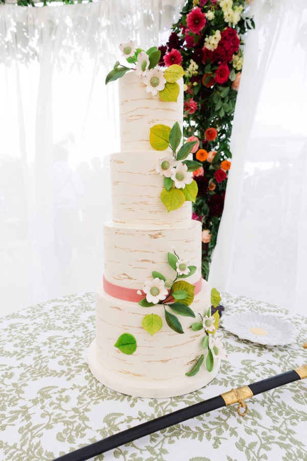 A four-tiered cake with a subtle birch-inspired texture, accented by sugar flowers and greenery, is perfectly tied into the natural garden theme.
