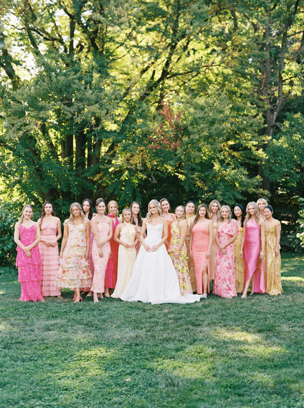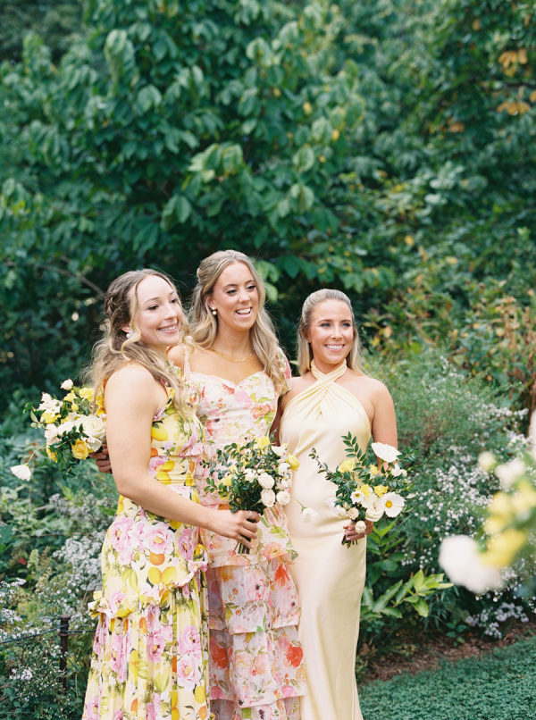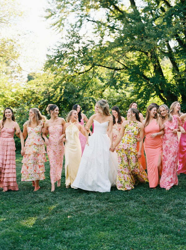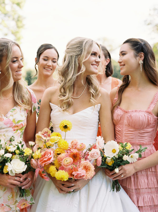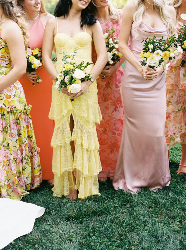 [field title=”Bridesmaid Dresses”]The bridesmaids’ dresses were an extension of the wedding’s vibrant garden party theme, mirroring the floral arrangements in a spectrum of warm, sun-kissed hues. Each bridesmaid wore a unique dress, creating a joyful and dynamic color palette. Embracing individuality, the dresses featured a mix of textures and patterns—flowing chiffon, delicate embroidery, playful prints, and soft satin—all coming together in an effortlessly chic and cohesive look. [/field]