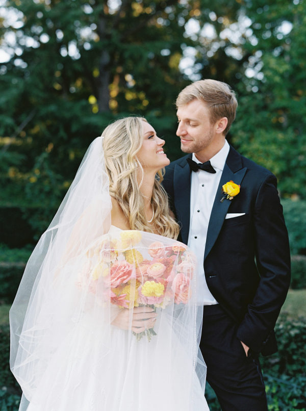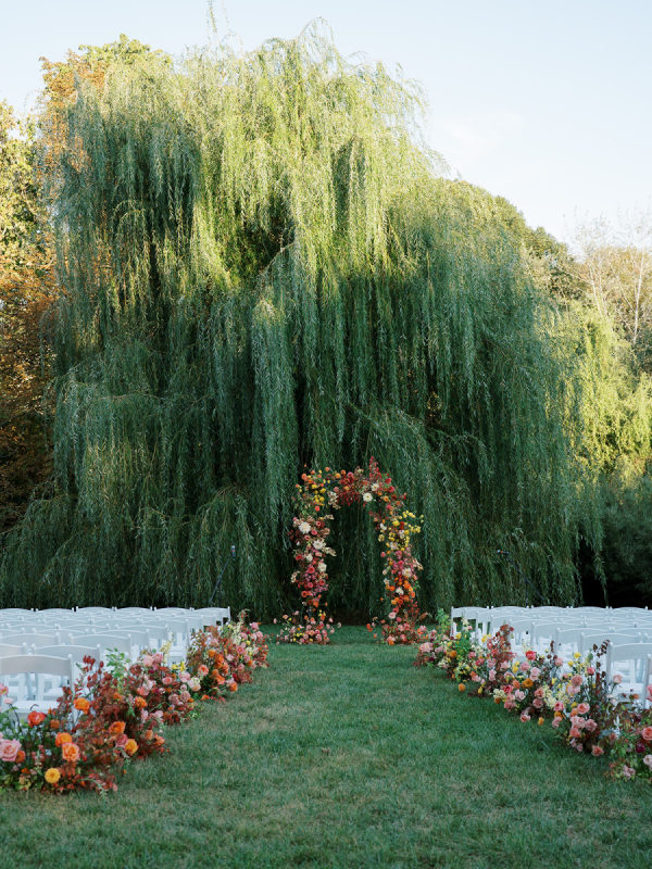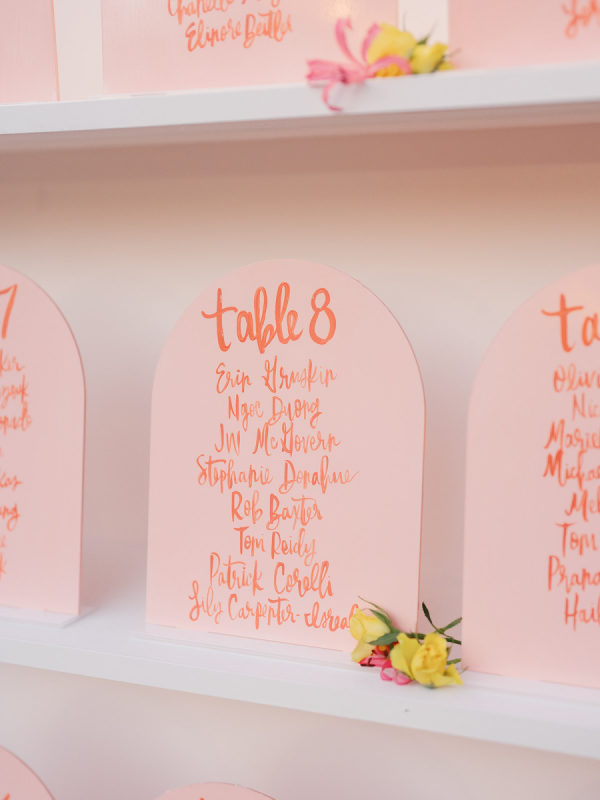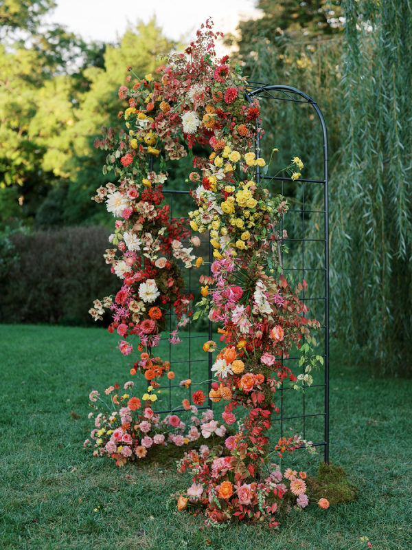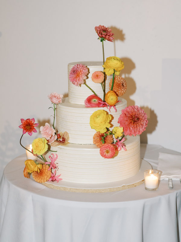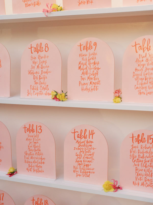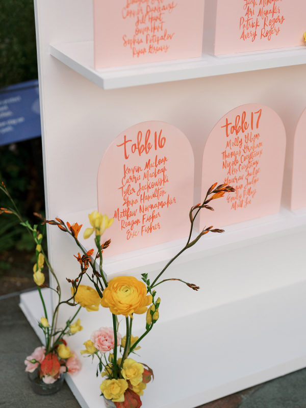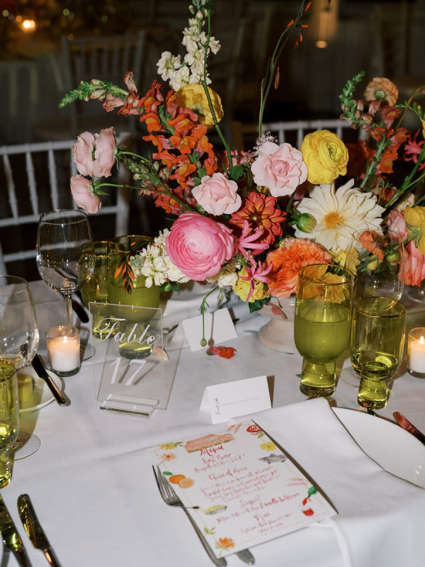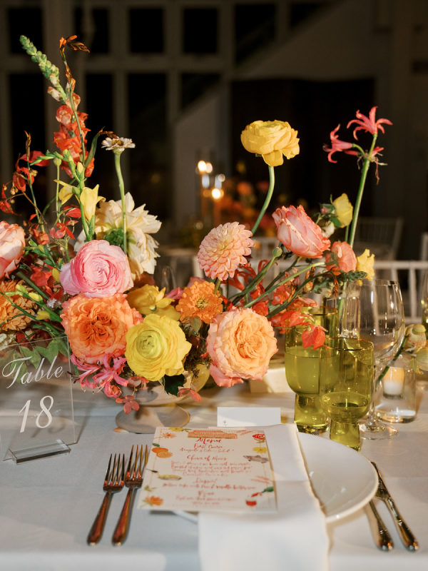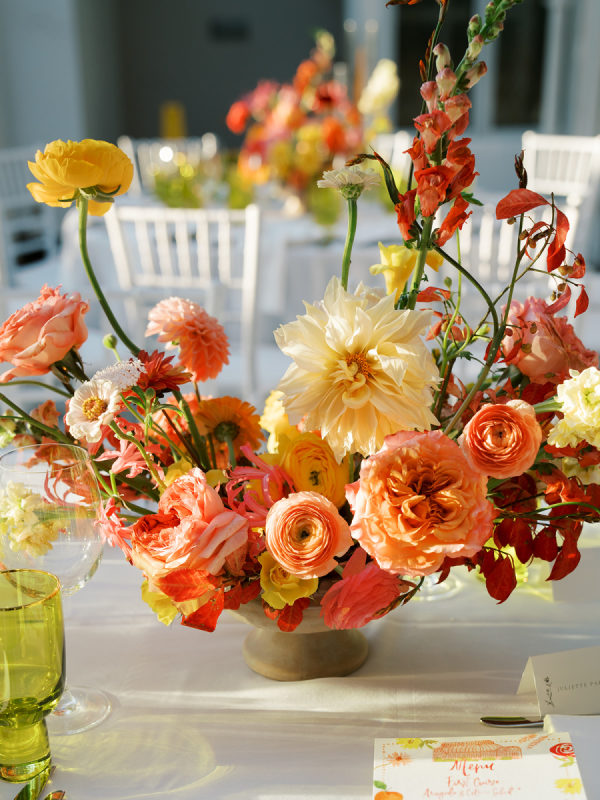 [field title=”Florals & Decor”]Blue Jasmine Floral brought the wedding’s vibrant garden party vision to life with breathtaking arrangements that seamlessly blended into the lush surroundings of the Brooklyn Botanic Garden. A rich palette of yellow, peach, pink, coral, and orange created a whimsical, romantic atmosphere, with blooms including roses, ranunculus, dahlias, cosmos, and more. Every floral element was thoughtfully designed to complement the venue’s natural beauty, enhancing the greenery rather than competing with it. The result was an effortlessly organic and immersive floral experience, making the ceremony and reception feel like a dreamlike extension of the garden itself[/field]