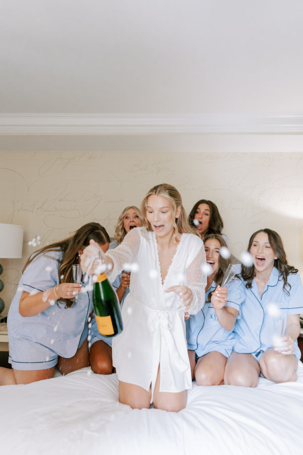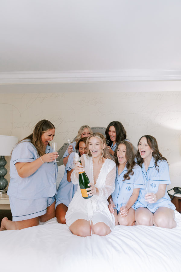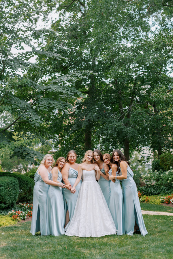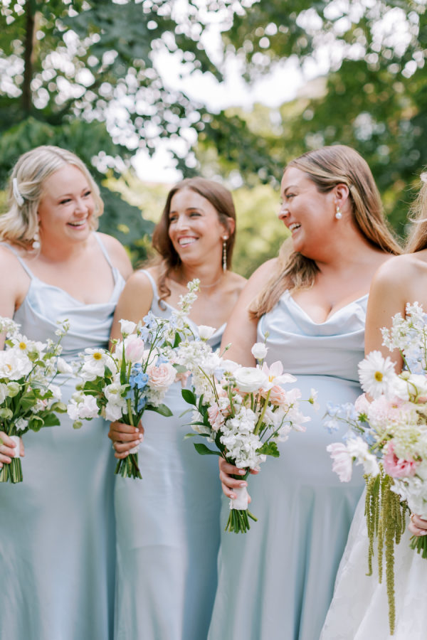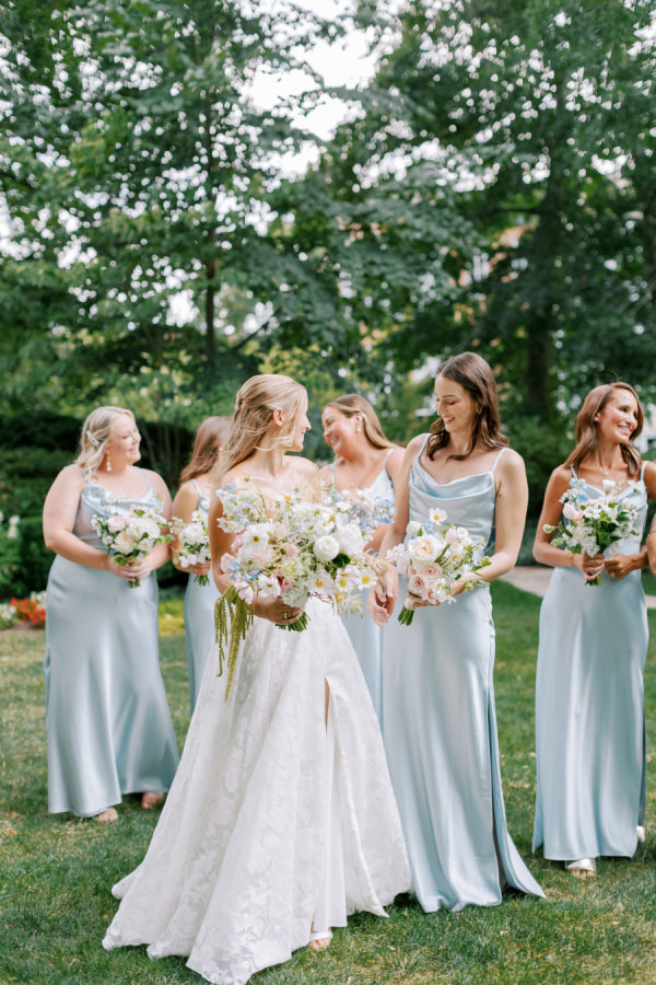 The bridesmaids wore light blue, satin gowns from Revelry.
