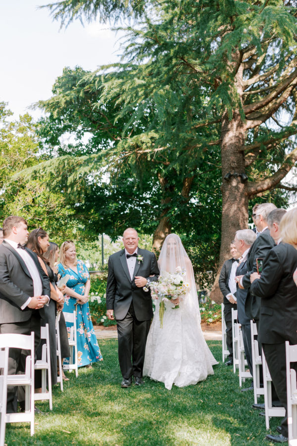 Abby chose a stunning A-line gown from Jenny Yoo, covered in lace. She also walked down the aisle with a gorgeous cathedral-length veil.