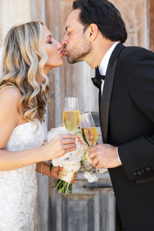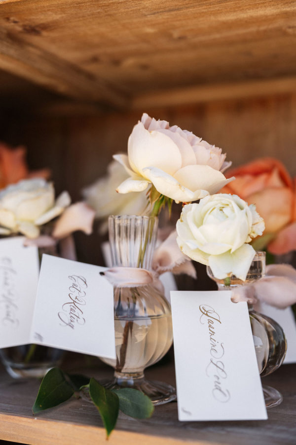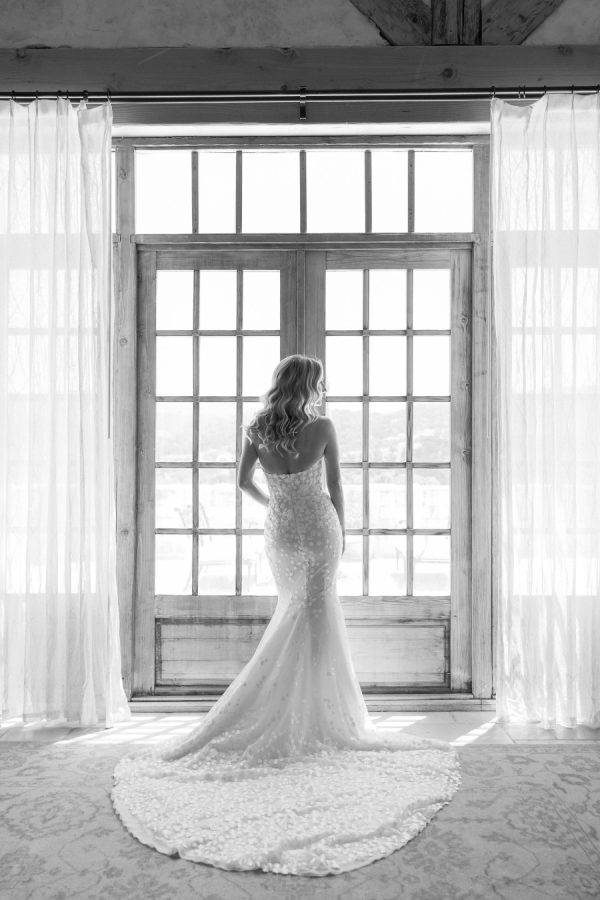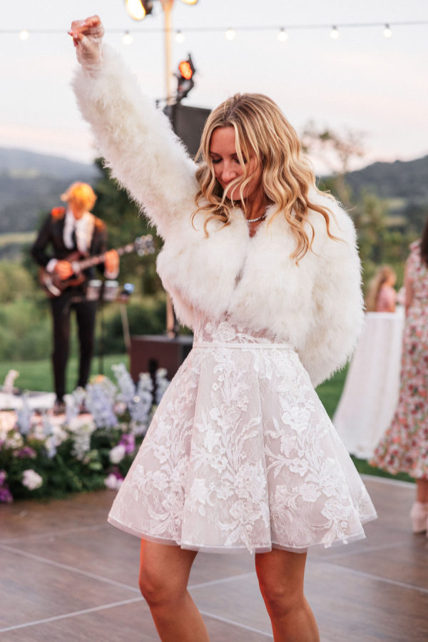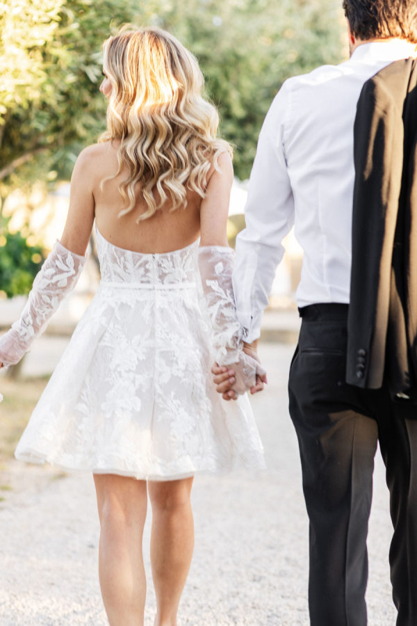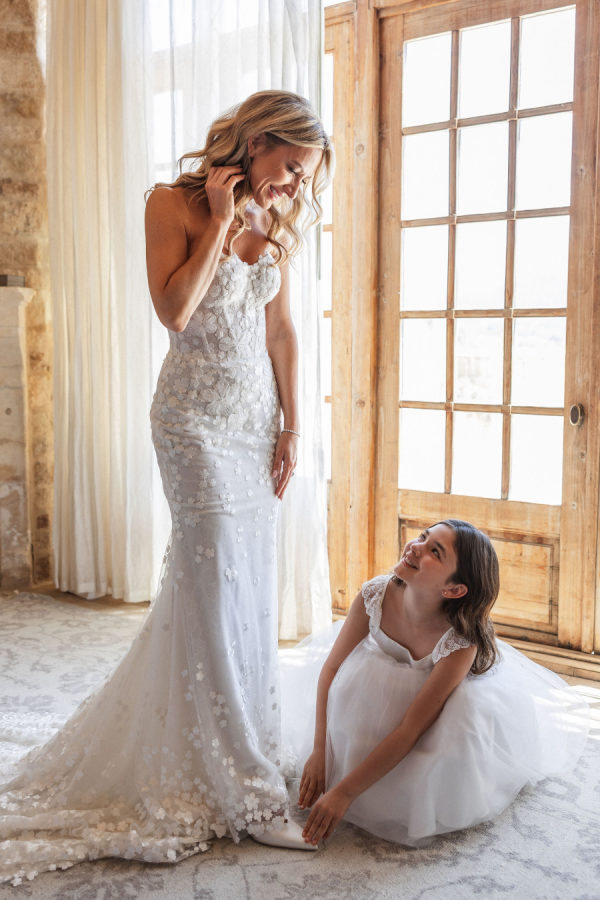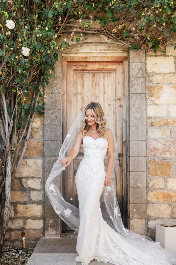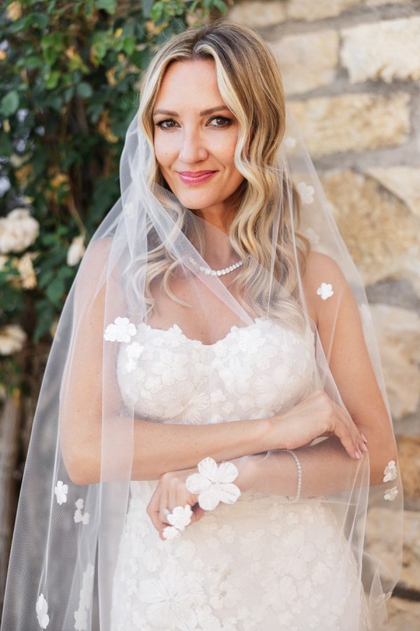 [field title=”Wedding Gown”]Michelle fell in love with not one, but two enchanting Mira Zwillinger gowns—each a dream in its own right. The ceremony gown, Karlee, featured a strapless sweetheart neckline and a sculpted silhouette that embodied elegance and grace, adorned with ethereal floral appliqués that felt straight out of a fairy tale. For the reception, she changed into Mishi, a flirty mini dress paired with delicate floral lace gloves—perfect for twirling beneath the stars. Michelle chose NWLA for the deeply personal bridal experience with the owner Nadia, and with the expert styling of Sam Ruiz, every gown and detail for her spring wedding soiree came together flawlessly.[/field]
