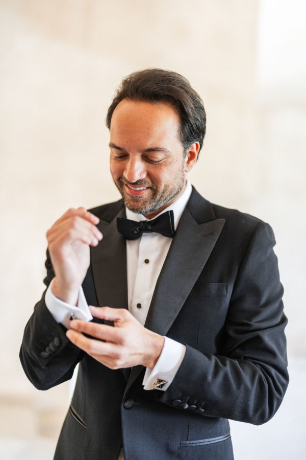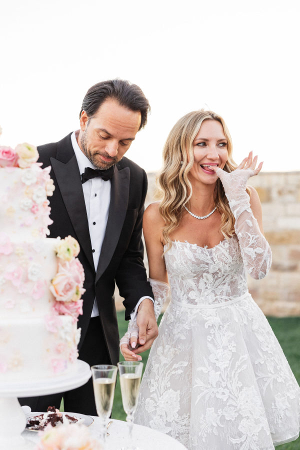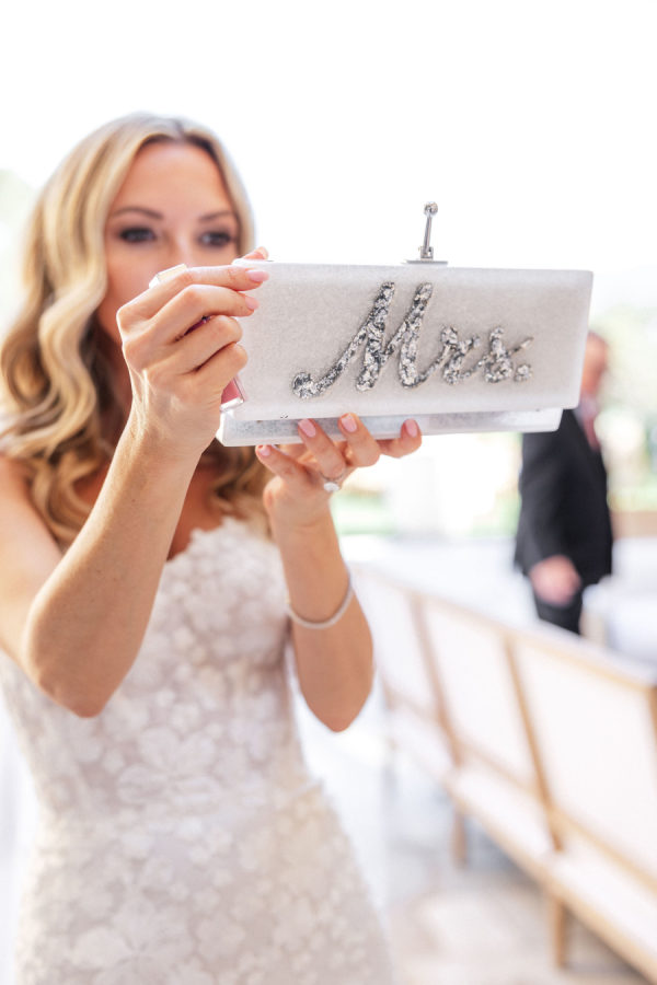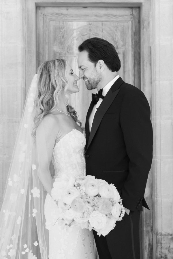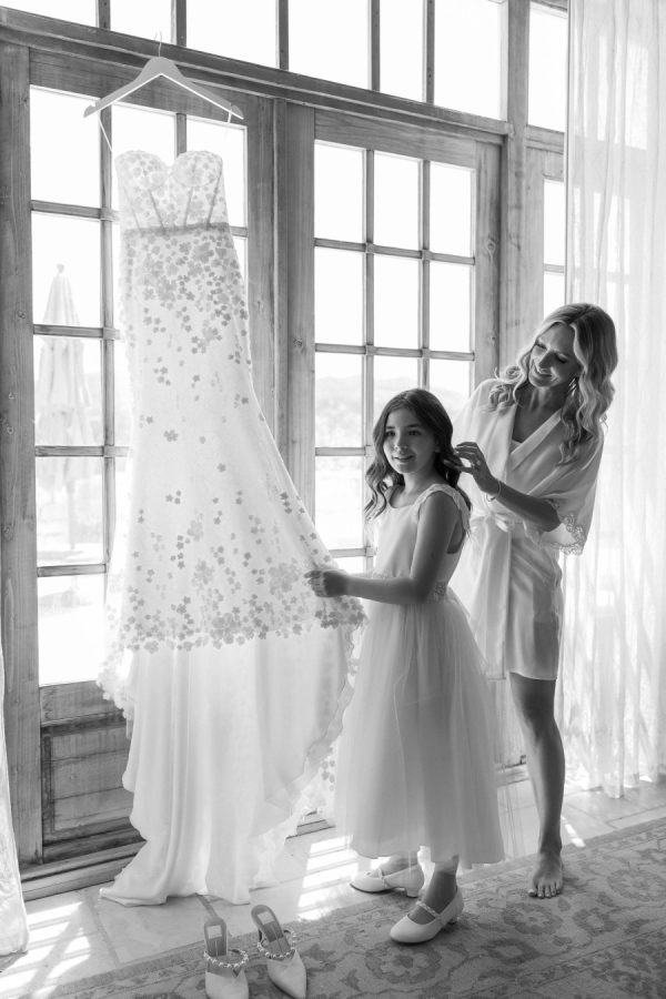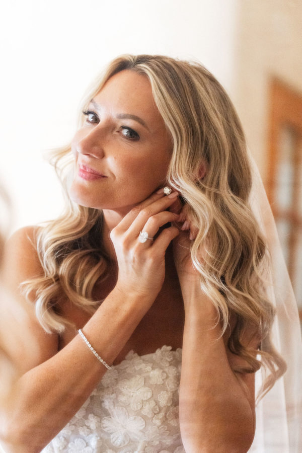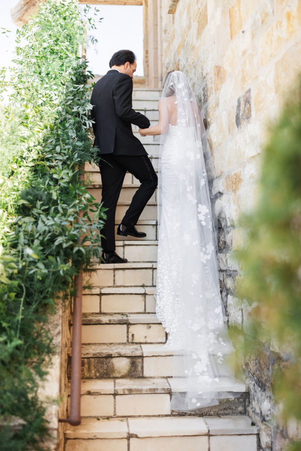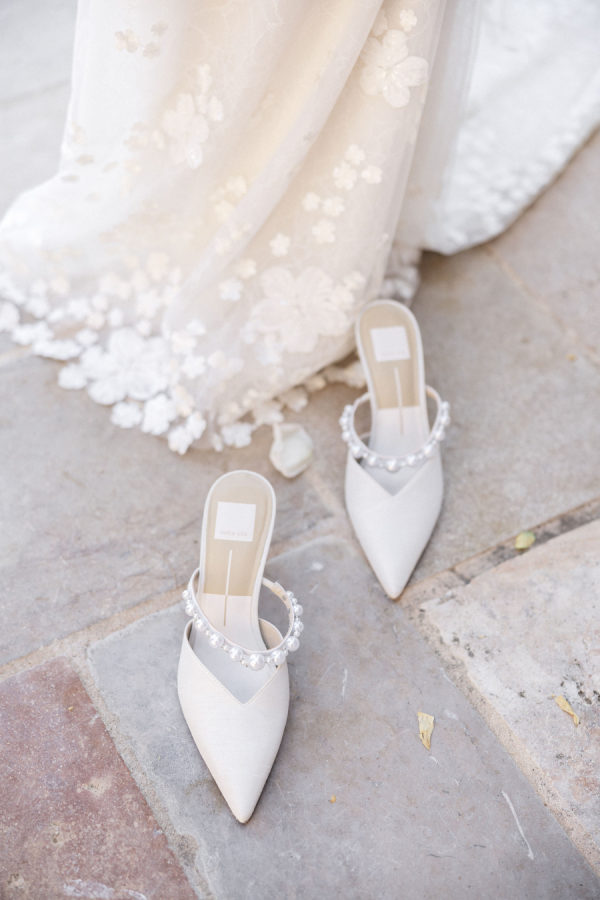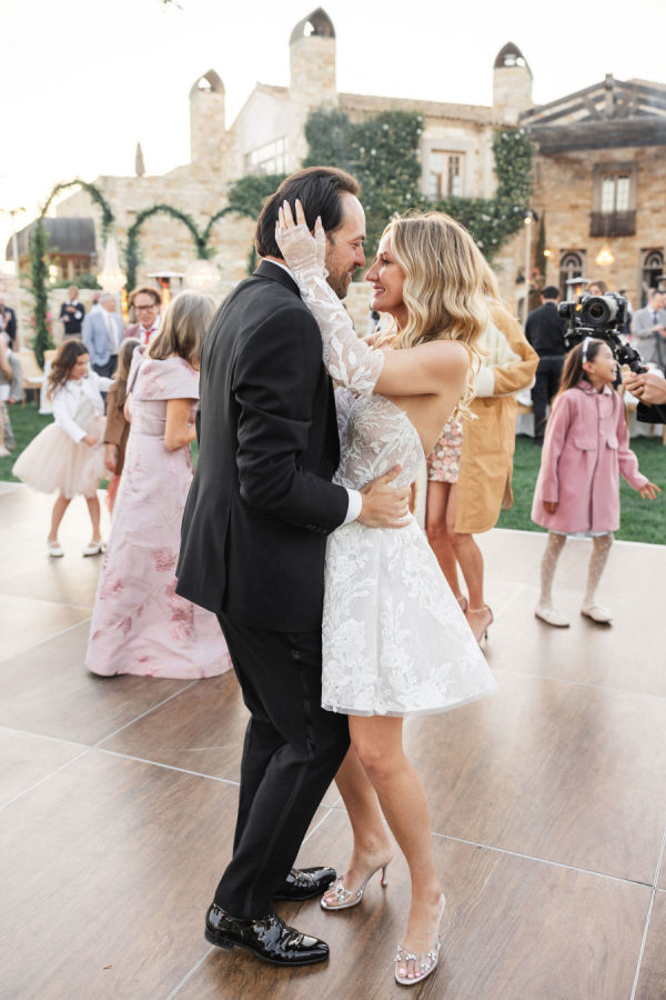 [field title=”Wedding Gown”]Michelle fell in love with not one, but two enchanting Mira Zwillinger gowns—each a dream in its own right. The ceremony gown, Karlee, featured a strapless sweetheart neckline and a sculpted silhouette that embodied elegance and grace, adorned with ethereal floral appliqués that felt straight out of a fairy tale. For the reception, she changed into Mishi, a flirty mini dress paired with delicate floral lace gloves—perfect for twirling beneath the stars. Michelle chose NWLA for the deeply personal bridal experience with the owner Nadia, and with the expert styling of Sam Ruiz, every gown and detail for her spring wedding soiree came together flawlessly.[/field]