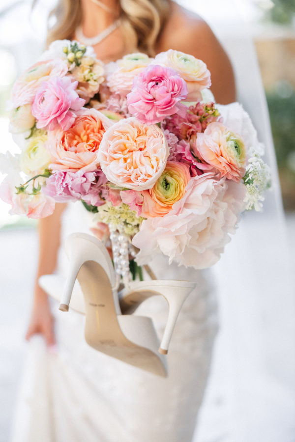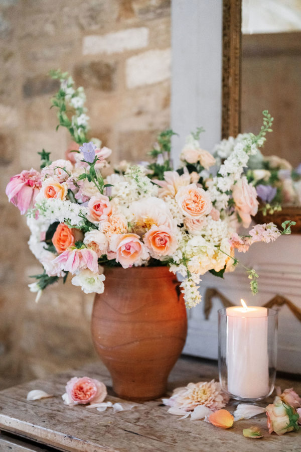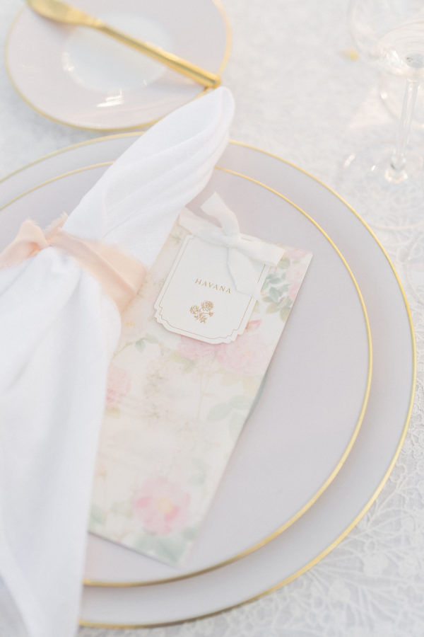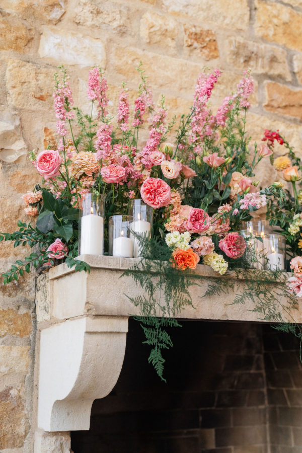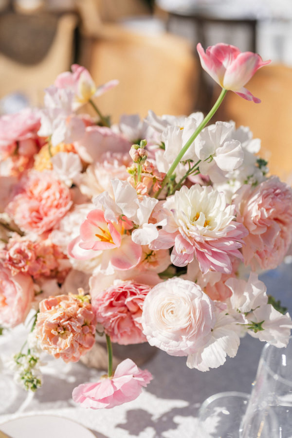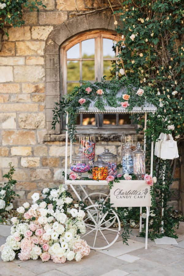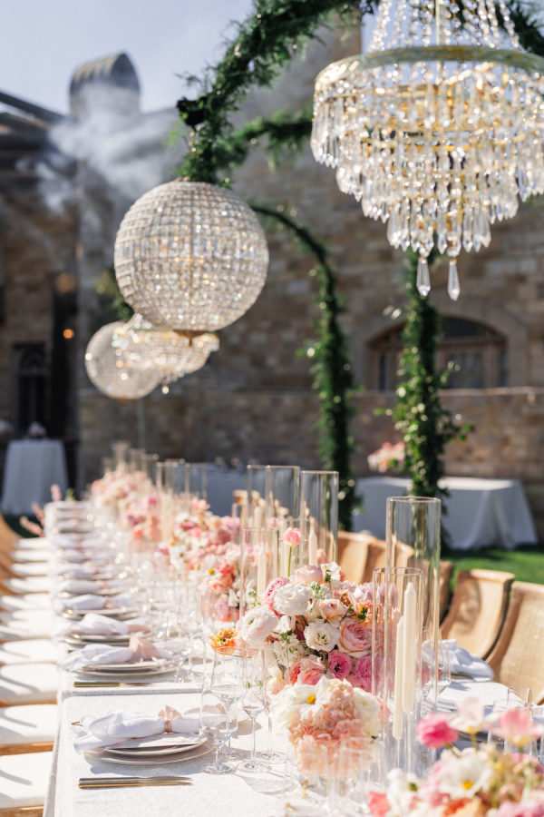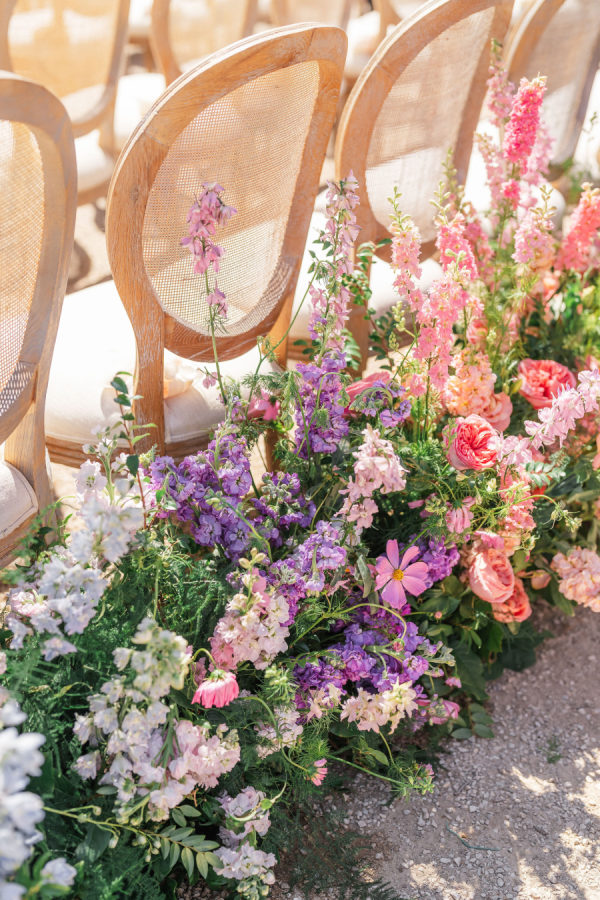 [field title=”Florals & Decor”]Sharon Lopez of Knot Just Flowers brought Michelle’s floral vision to life with breathtaking artistry. The centuries-old oak tree beneath which Michelle and Paul exchanged vows was adorned with a cascading canopy of garden roses in soft blush, ivory, and pastel pink—transforming the space into a living fairytale. The aisle was lined with a dreamy palette of spring florals in rainbow pastels, creating a whimsical path that felt straight out of a storybook.[/field]