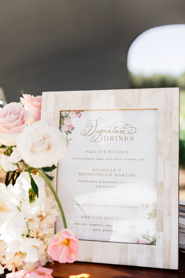 Field to Table Events curated a feast of fresh, organic cuisine that delighted every guest, while Flair Project Bartending kept spirits high with an unforgettable cocktail experience. Custom signature drinks included “Paul’s Picante,” a fiery take on his beloved spicy margarita; “Michelle’s Moonstruck Martini,” a luminous blend of rhubarb vodka, grilled peach, ginger, lime, and pink grapefruit; and the crowd favorite, “Rocket Fuel,” a refreshing mix of mint, lime, cucumber, and marjoram gin. Adding a meaningful touch, each drink was adorned with a paper-clipped love quote, allowing guests to unfold a little piece of inspiration with every sip.
