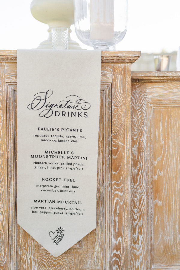 [field title=”Special Detail #2″]The heart, rocket and star, representing the new family of three, were integrated throughout the entire wedding, on the invitations, the menu, the signs and ultimately the necklace Paul gifted Charlotte. [/field]