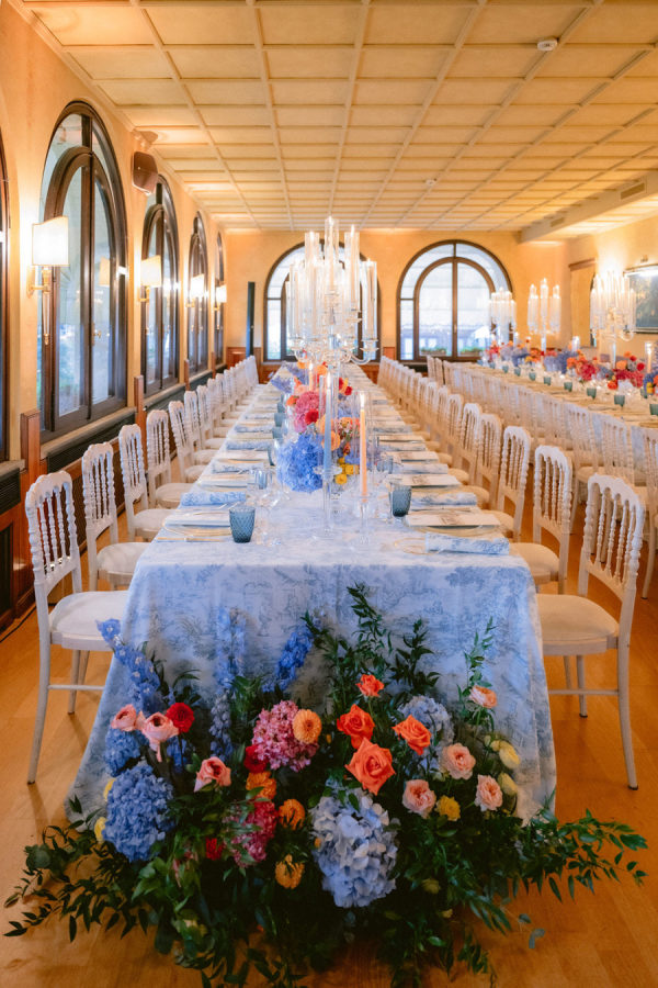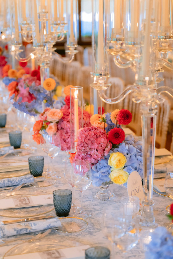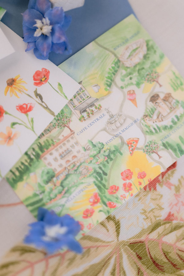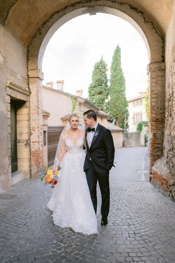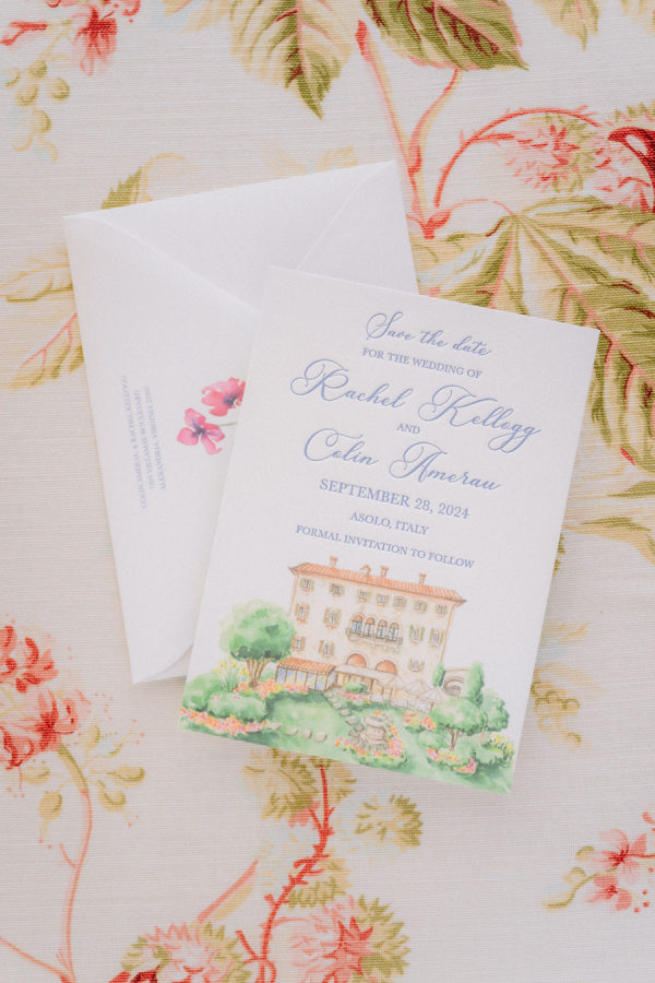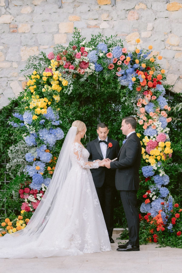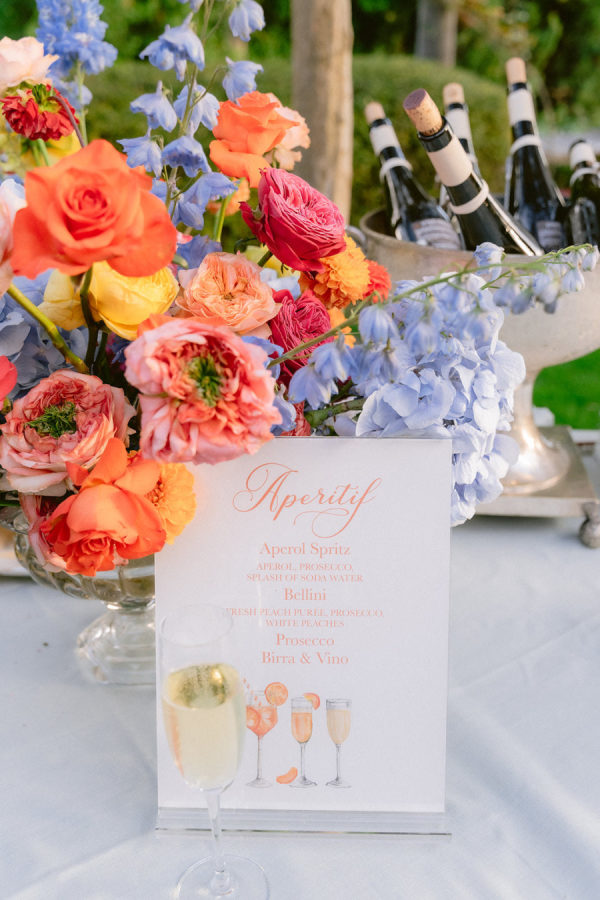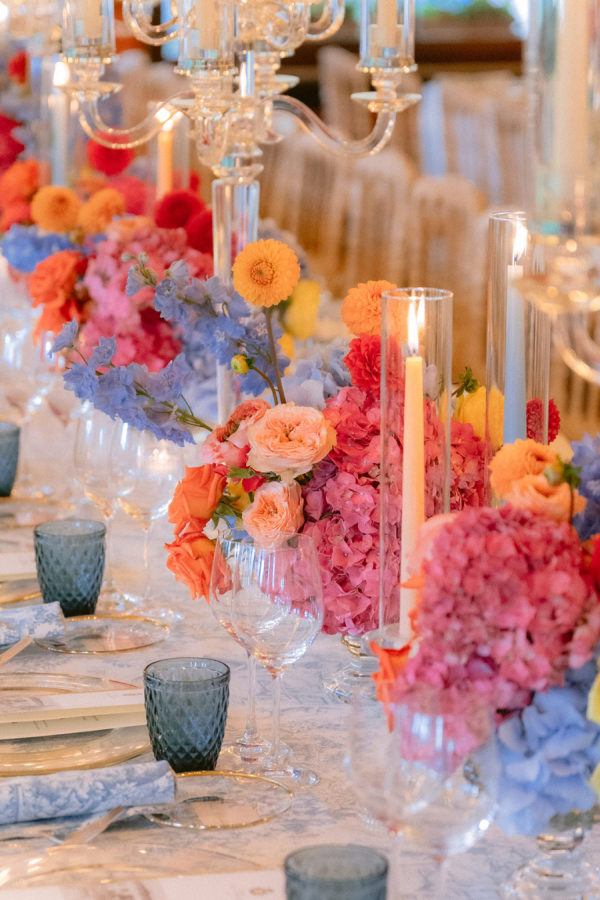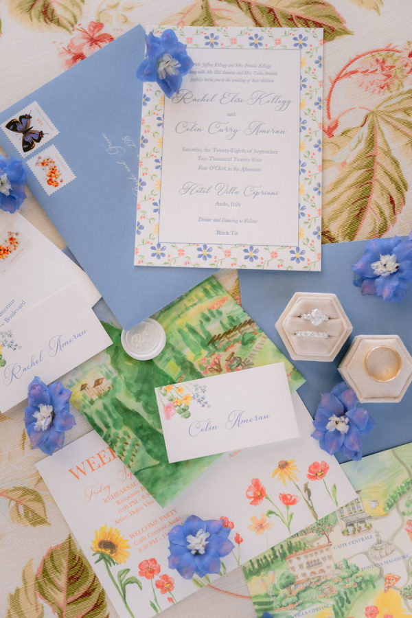 From the bride: Asolo holds a special place in our hearts—the people, the charm, the artistry, the history, and, of course, its undeniable beauty. It’s called The City of a Hundred Horizons for a reason! When envisioning our wedding, we wanted it to feel like a natural extension of Asolo’s beauty, not something that overshadowed it. That intention guided every decision, from the save-the-dates and invitations to the flowers, place cards, tablescapes, and gift bags. Every detail reflected the essence of Asolo and our venue, Hotel Villa Cipriani. The invitations featured a watercolor design inspired by the artisan tile found in each guest room’s bathroom at the hotel—a detail the bride fell in love with on her very first visit. A vellum wrap overlay showcased a delicate watercolor of the hotel’s gardens and surrounding prosecco fields, setting the tone for the celebration to come. With a love for color, the bride envisioned vibrant yet harmonious hues woven throughout the wedding. A striking floral arch served as the ceremony’s focal point, bursting with shades of blue, orange, pink, and green against the hotel’s historic stone backdrop. This balance of tradition and fresh vibrancy carried into the reception, where blue and white toile tablecloths, elegant candelabras, and colorful candles complemented the hotel’s signature floral plates. At its core, the bride’s vision was simple: a wedding that was timeless, beautiful, colorful, and, above all, fun!