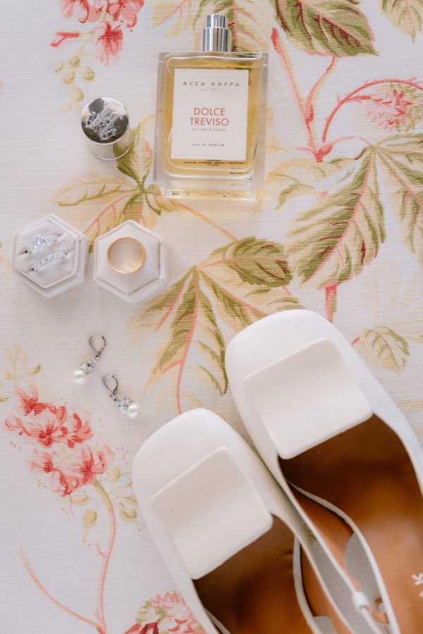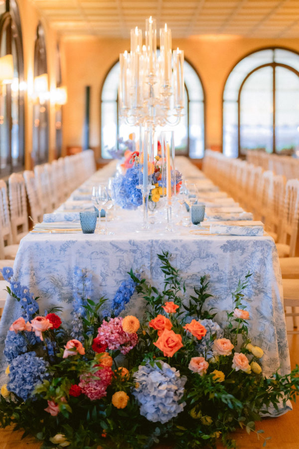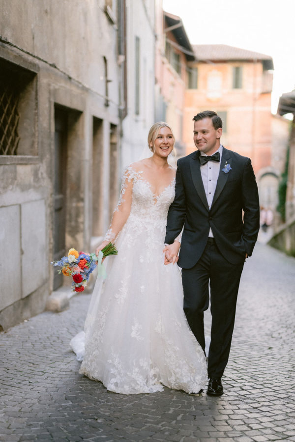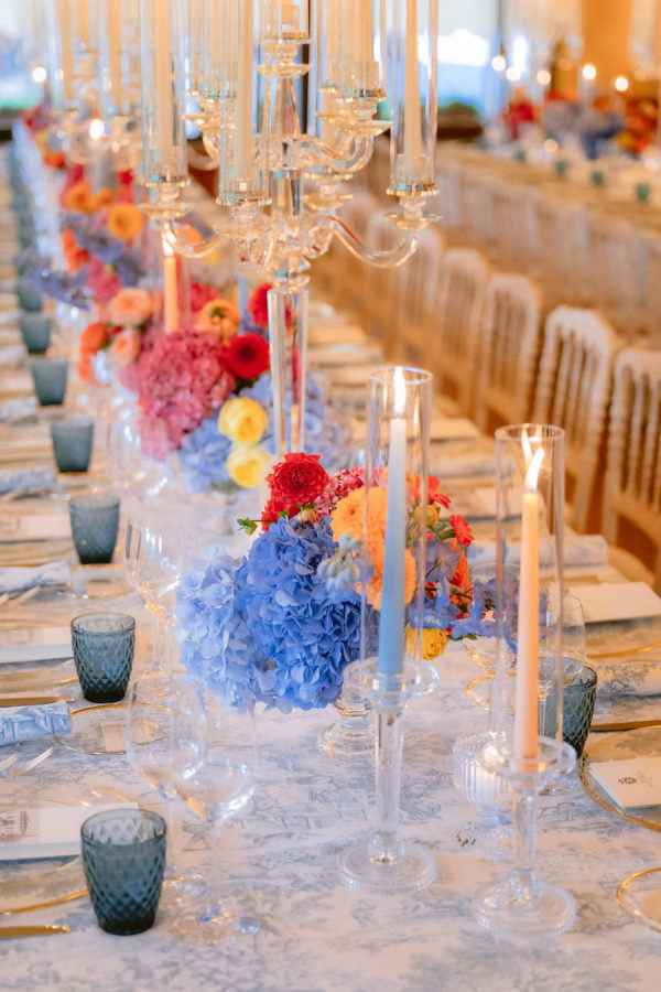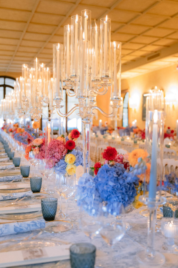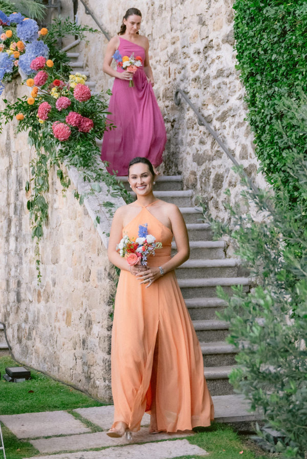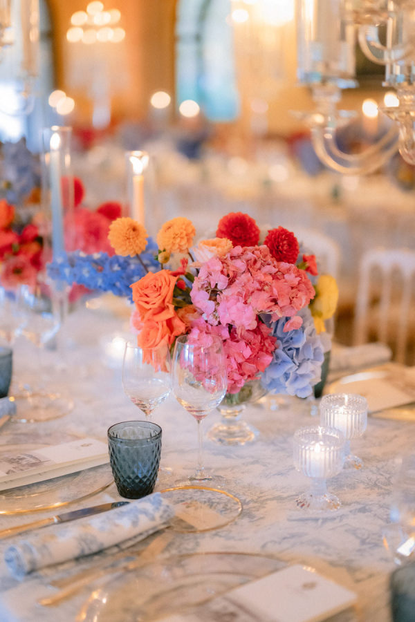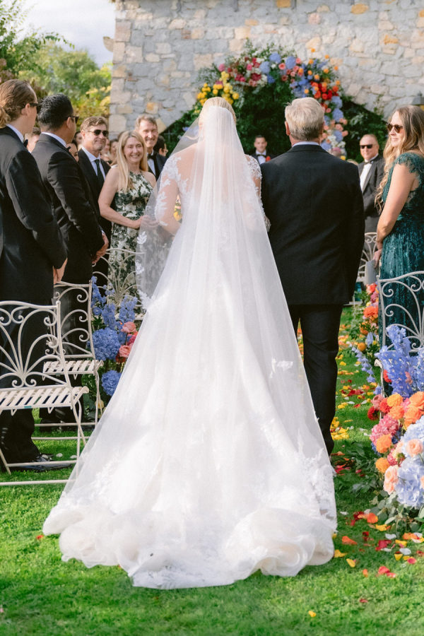From the bride: Asolo holds a special place in our hearts—the people, the charm, the artistry, the history, and, of course, its undeniable beauty. It’s called The City of a Hundred Horizons for a reason! When envisioning our wedding, we wanted it to feel like a natural extension of Asolo’s beauty, not something that overshadowed it. That intention guided every decision, from the save-the-dates and invitations to the flowers, place cards, tablescapes, and gift bags. Every detail reflected the essence of Asolo and our venue, Hotel Villa Cipriani. The invitations featured a watercolor design inspired by the artisan tile found in each guest room’s bathroom at the hotel—a detail the bride fell in love with on her very first visit. A vellum wrap overlay showcased a delicate watercolor of the hotel’s gardens and surrounding prosecco fields, setting the tone for the celebration to come. With a love for color, the bride envisioned vibrant yet harmonious hues woven throughout the wedding. A striking floral arch served as the ceremony’s focal point, bursting with shades of blue, orange, pink, and green against the hotel’s historic stone backdrop. This balance of tradition and fresh vibrancy carried into the reception, where blue and white toile tablecloths, elegant candelabras, and colorful candles complemented the hotel’s signature floral plates. At its core, the bride’s vision was simple: a wedding that was timeless, beautiful, colorful, and, above all, fun!
