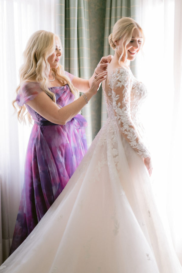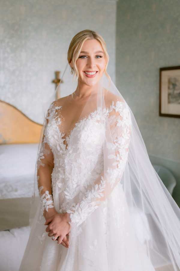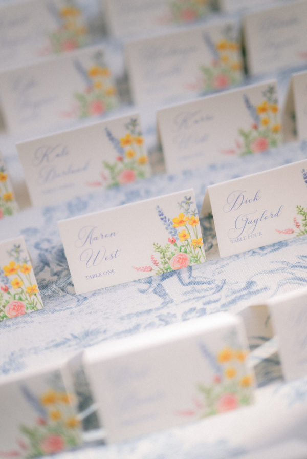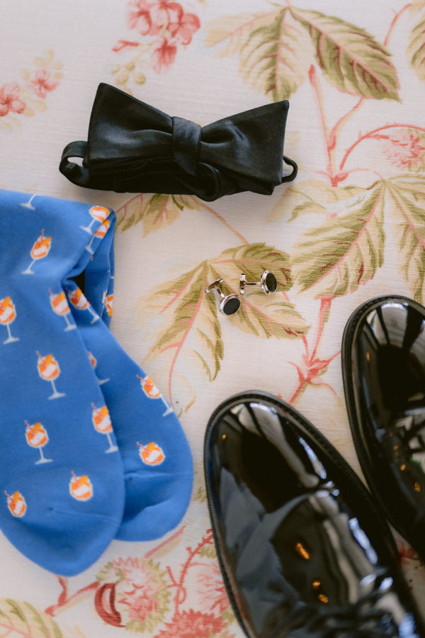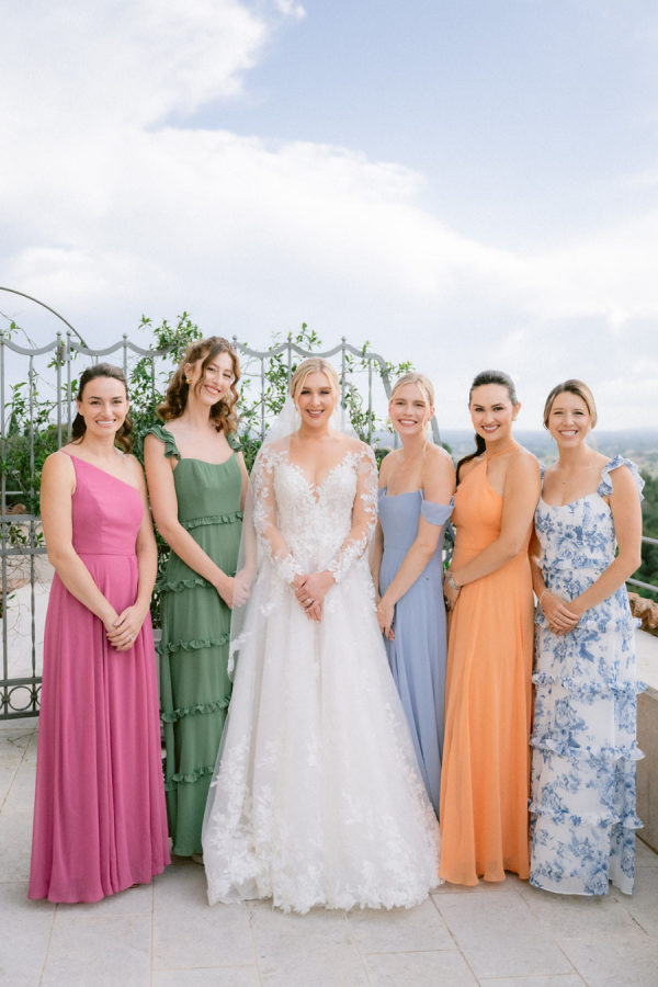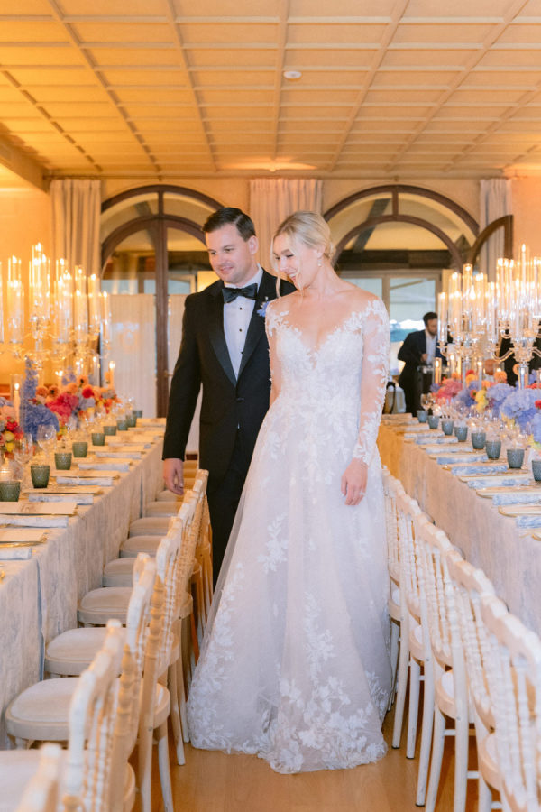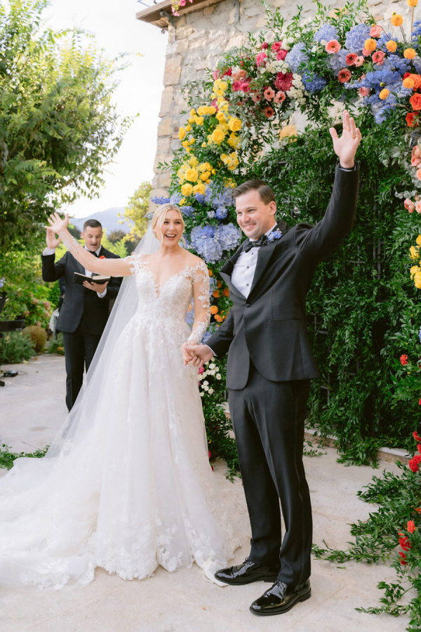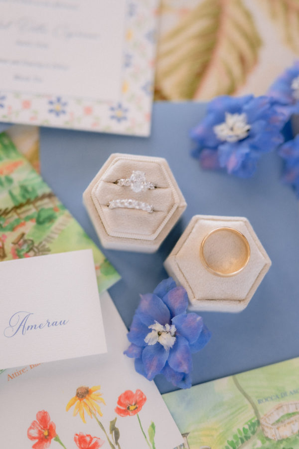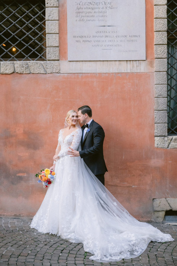 From the bride: Asolo holds a special place in our hearts—the people, the charm, the artistry, the history, and, of course, its undeniable beauty. It’s called The City of a Hundred Horizons for a reason! When envisioning our wedding, we wanted it to feel like a natural extension of Asolo’s beauty, not something that overshadowed it. That intention guided every decision, from the save-the-dates and invitations to the flowers, place cards, tablescapes, and gift bags. Every detail reflected the essence of Asolo and our venue, Hotel Villa Cipriani. The invitations featured a watercolor design inspired by the artisan tile found in each guest room’s bathroom at the hotel—a detail the bride fell in love with on her very first visit. A vellum wrap overlay showcased a delicate watercolor of the hotel’s gardens and surrounding prosecco fields, setting the tone for the celebration to come. With a love for color, the bride envisioned vibrant yet harmonious hues woven throughout the wedding. A striking floral arch served as the ceremony’s focal point, bursting with shades of blue, orange, pink, and green against the hotel’s historic stone backdrop. This balance of tradition and fresh vibrancy carried into the reception, where blue and white toile tablecloths, elegant candelabras, and colorful candles complemented the hotel’s signature floral plates. At its core, the bride’s vision was simple: a wedding that was timeless, beautiful, colorful, and, above all, fun!