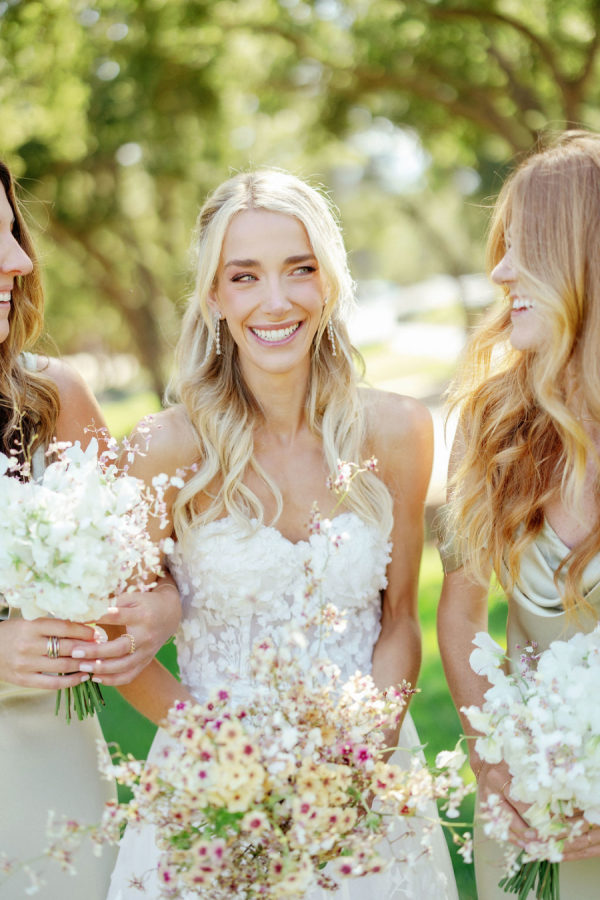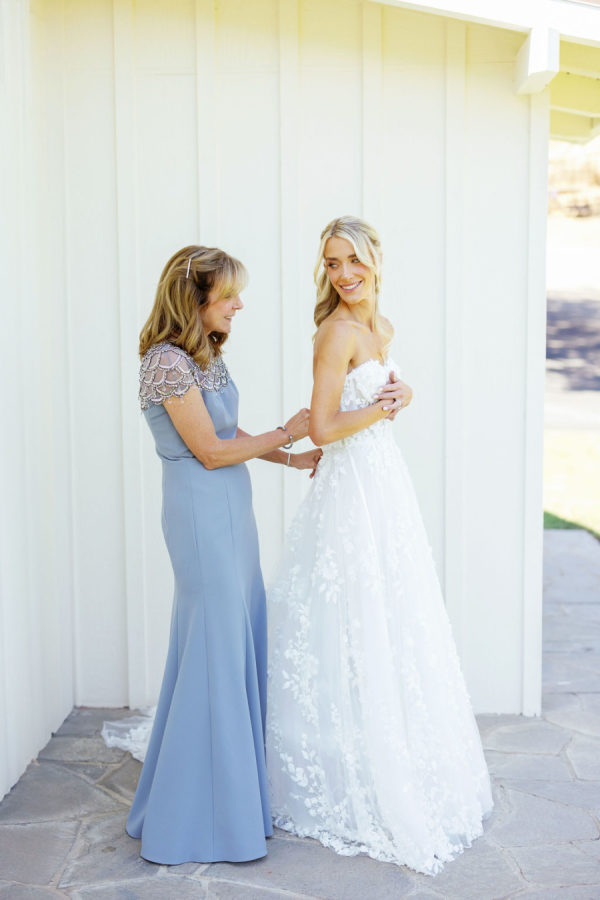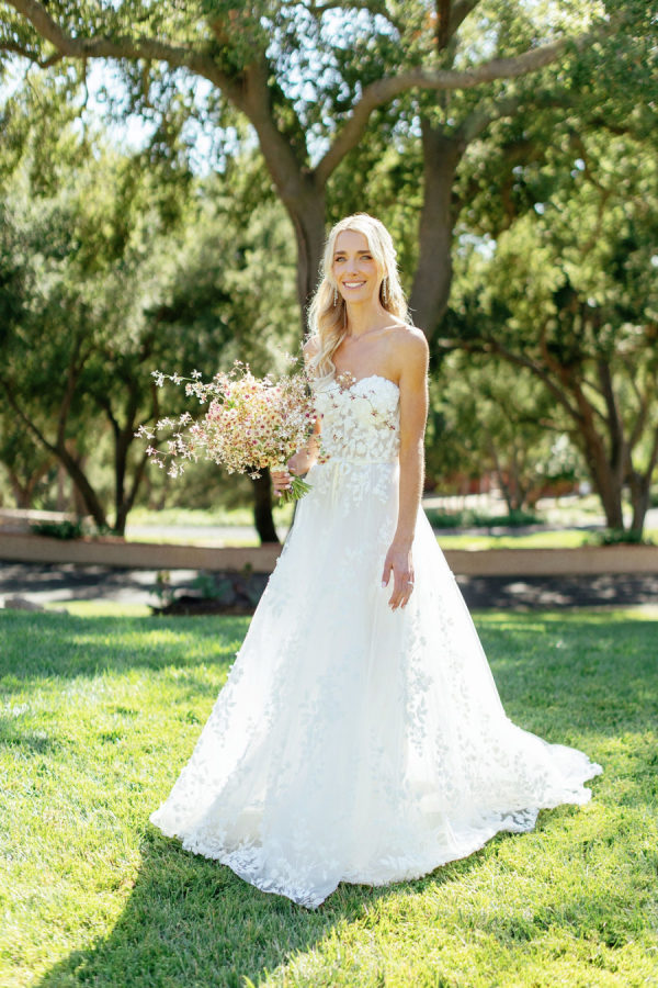 Wedding Day: Marchesa Notte “Bailey” gown, Jimmy Choo heels, SHASHI earrings, custom Etsy hair clips, heirloom diamond bracelet. I went to several bridal shops in LA with my Mom, who flew in from NY, and my mother-in-law. I ended up finding my dream dress at En Blanc Bridal.’