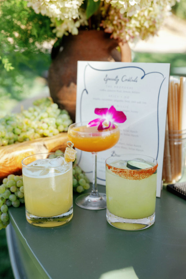 A hot air balloon surprise at dinner, the couple’s dog Millie crashing cocktail hour in a flower collar, and a dance party in the barn that went late into the night with espresso martinis and pizza. All of our wine at the wedding was made using grapes from the vineyard, and we had a special cocktail menu that included personal drinks such as the below: ‘ The Proposal A bright and celebratory sip blending vodka with tropical passion fruit, fresh lemon, and a hint of bitters. A bold twist on a margarita, this cocktail mixes tequila with crisp cucumber, zesty lime, and jalapeño heat, finished with a chili salt rim. Smooth scotch layered with yuzu, ginger, lemon, and honey for a warming yet citrus-forward drink.