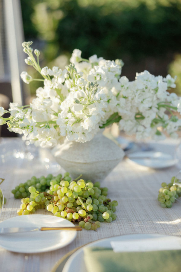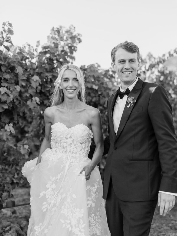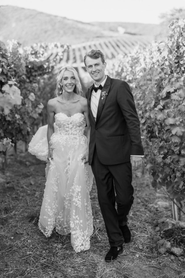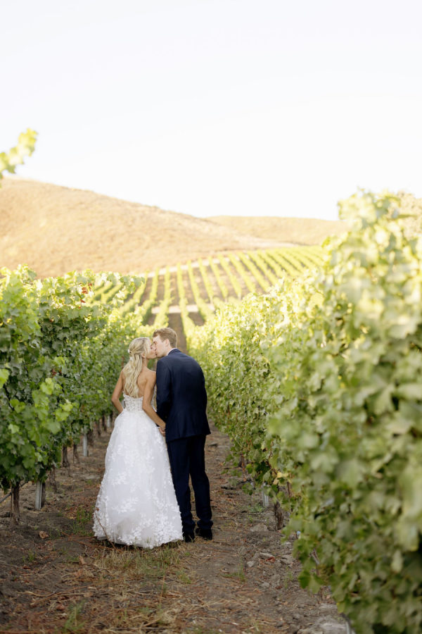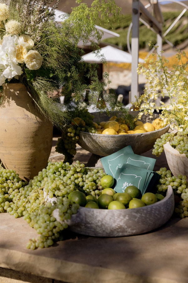 Florals: @pigsty The wedding décor was a romantic ode to the vineyard itself—lush white and blush florals paired effortlessly with clusters of grapes and citrus, long tables dressed in soft linens, and vine-covered pergolas that framed the celebration with natural beauty. Every detail felt abundant yet refined, from custom napkins and matchboxes to signature cocktails adorned with fresh garnishes. What made it truly special was that the vineyard and wine were all family grown and made, infusing the celebration with heritage and heart.