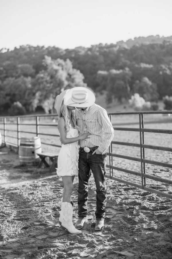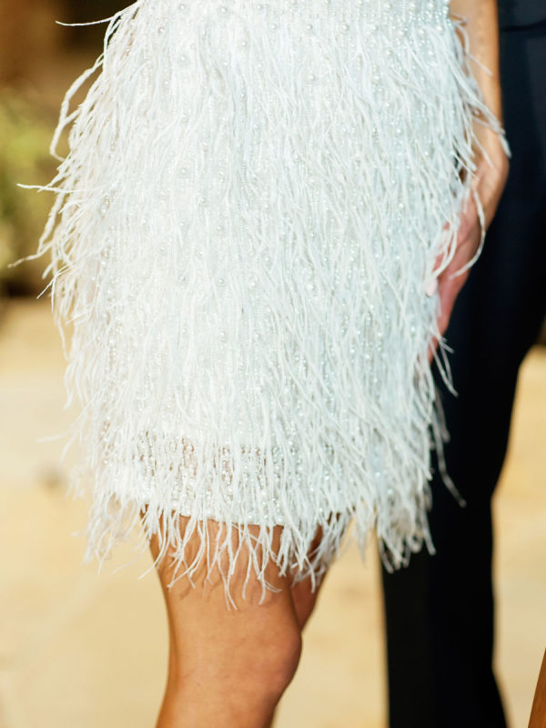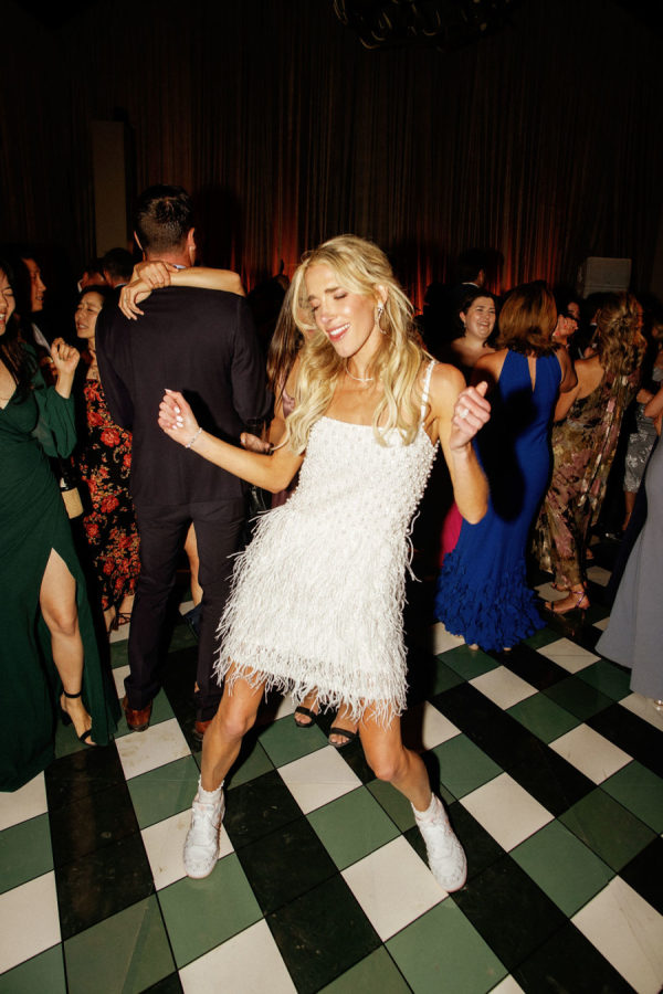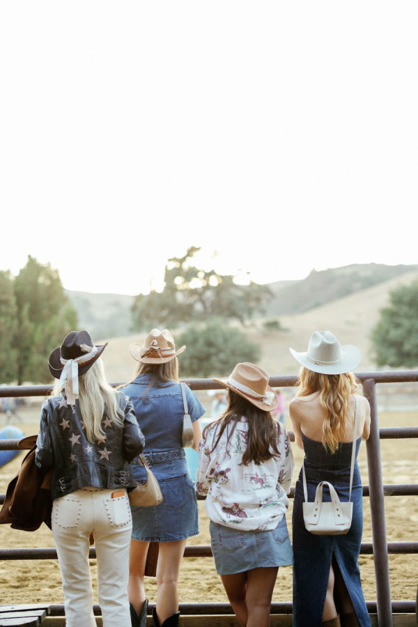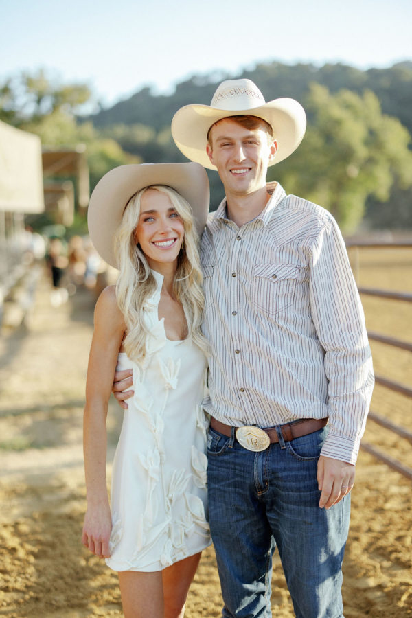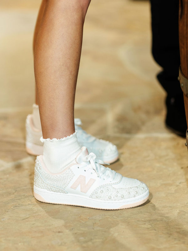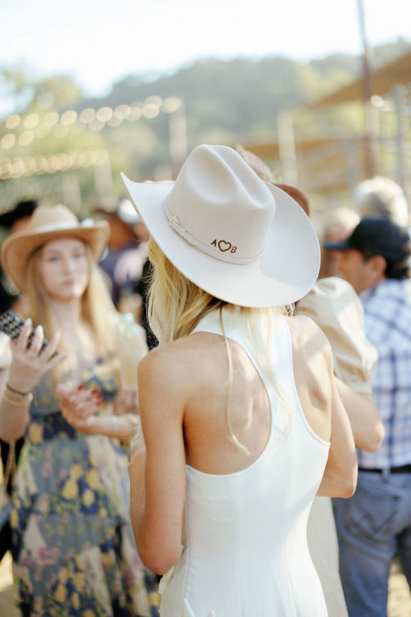 Fashion: Friday Welcome Rodeo: Cult Gaia “Ela” dress, Stetson hat, Tecovas boots, vintage horseshoe earrings. After-Party: Nadine Merabi “Carrie” dress with custom pearl-embellished New Balance sneakers (a nod to her new last name, Nolan)