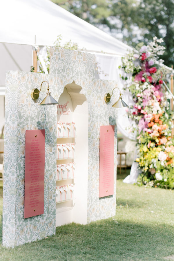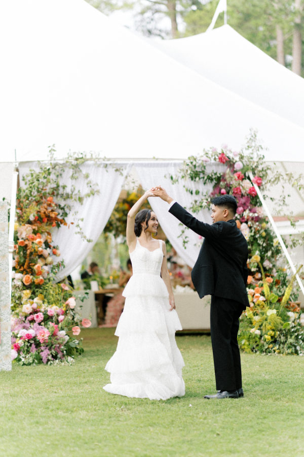 [field title=”Florals & Decor”]Lush floral arrangements can transform a reception table into a botanical paradise, with abundant blooms in a variety of colors and textures. Overhanging floral displays create a dramatic and enchanting atmosphere, with cascading flowers and greenery suspended above guests, adding depth and elegance to the space. A grand tent entrance adorned with floral accents sets a majestic tone, welcoming guests into the celebration with towering arrangements or delicate garlands that frame the entrance with natural beauty. For the ceremony, floral arrangements can be designed to complement the surroundings, whether adorning arches, lining aisles, or creating a focal point at the altar, enhancing the romance and ambiance of the occasion with their exquisite fragrance and visual appeal.[/field]