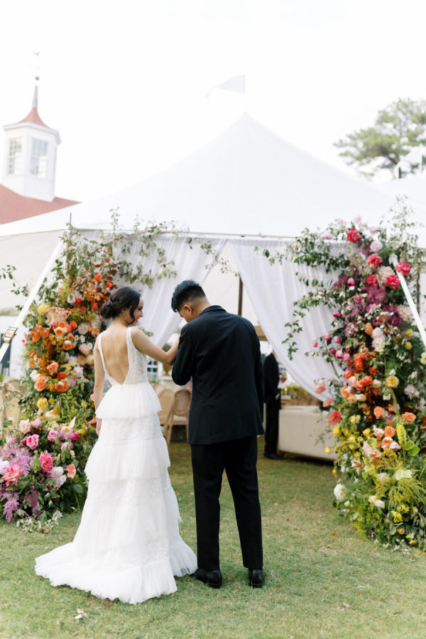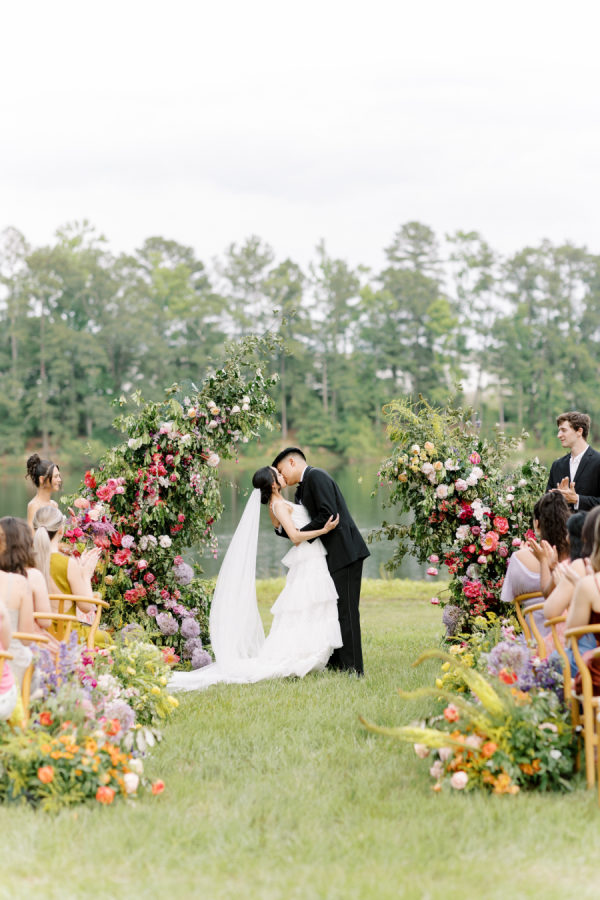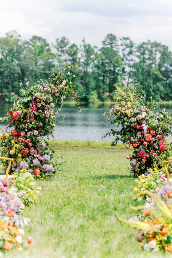 [field title=”The Inspiration”]This wedding table setting exudes a bold and chic ambiance, characterized by its vibrant floral arrangements and elegant table decor. The table is adorned with a striking display of flowers that cascade from overhead installations, creating a lush, garden-like atmosphere. The color palette transitions beautifully from soft yellows and oranges to vivid reds and purples, adding a dynamic and eye-catching element to the setting. The ceremony florals in this wedding setup are a breathtaking display of nature’s beauty, creating a vibrant and enchanting atmosphere. The archway is adorned with an abundant arrangement of flowers in various shades of pink, purple, yellow, and green, forming a stunning backdrop against the serene lakeside setting. [/field]