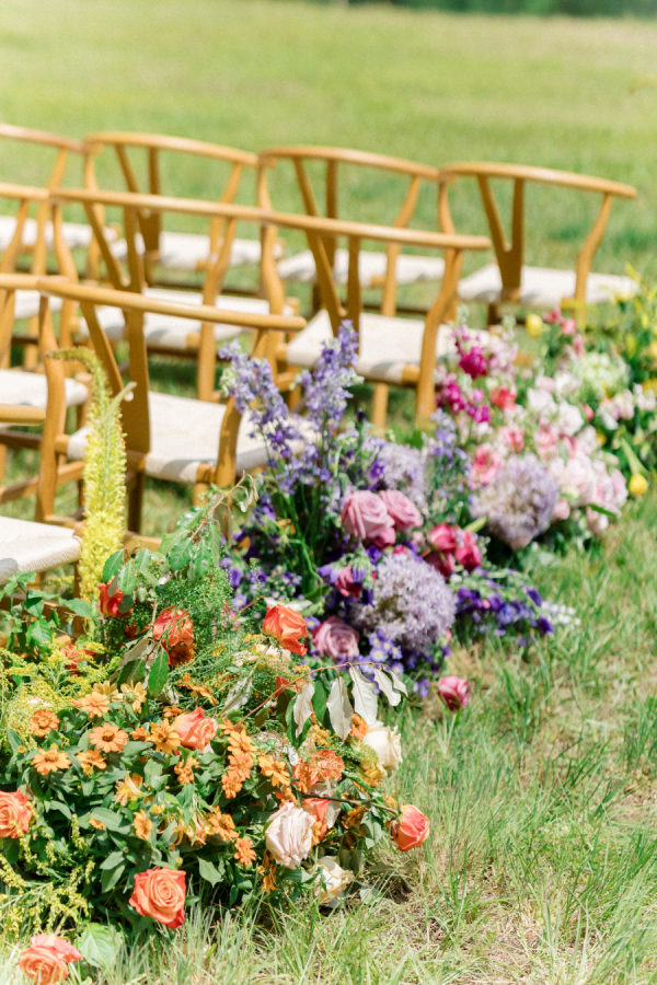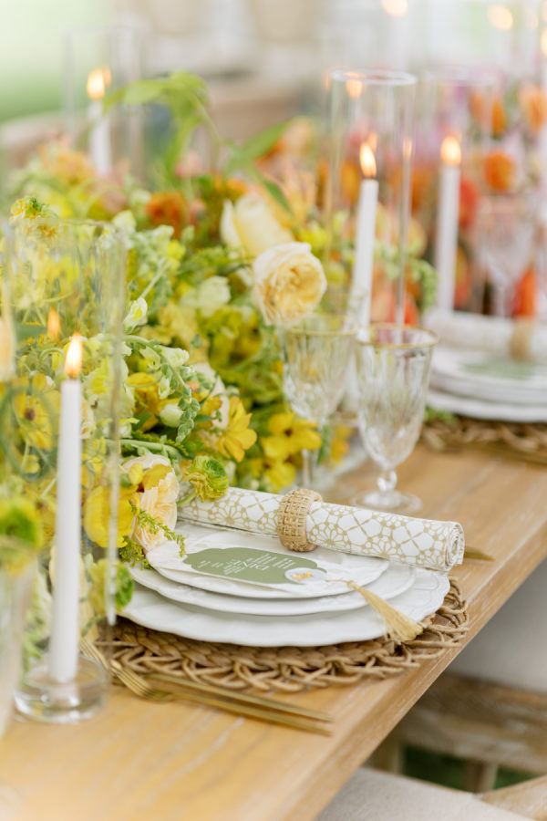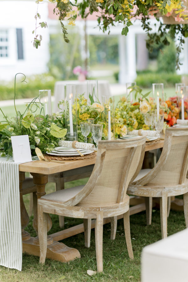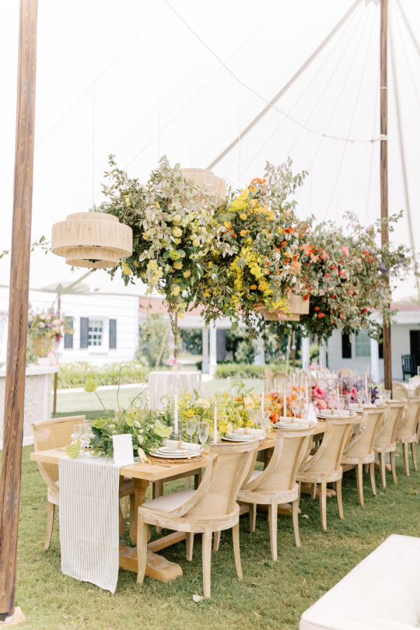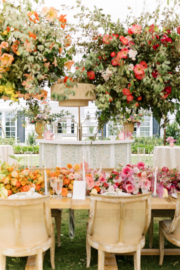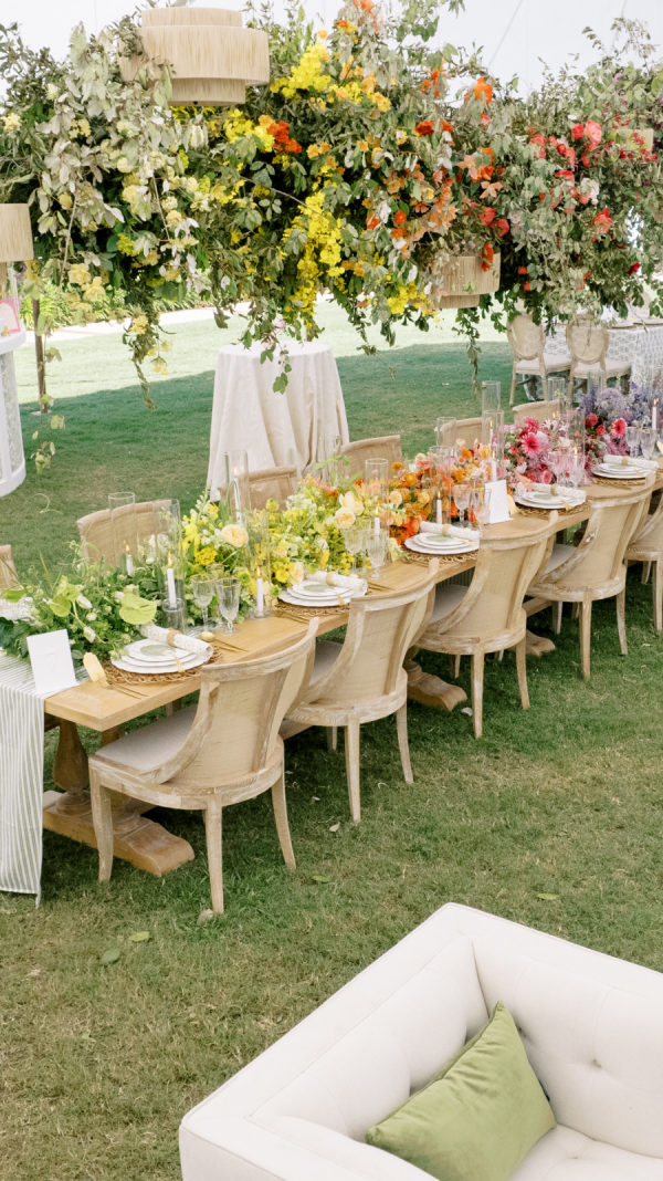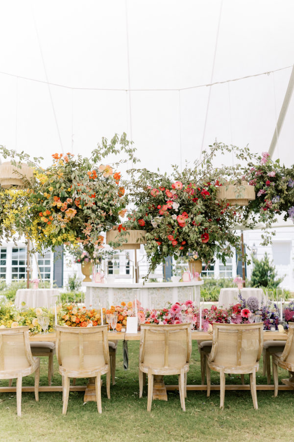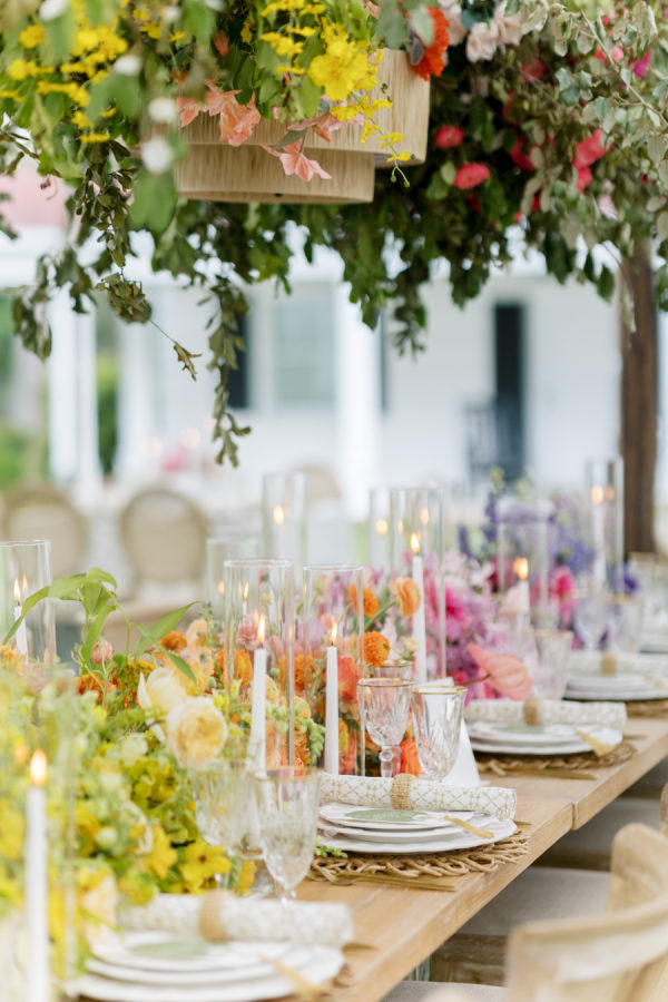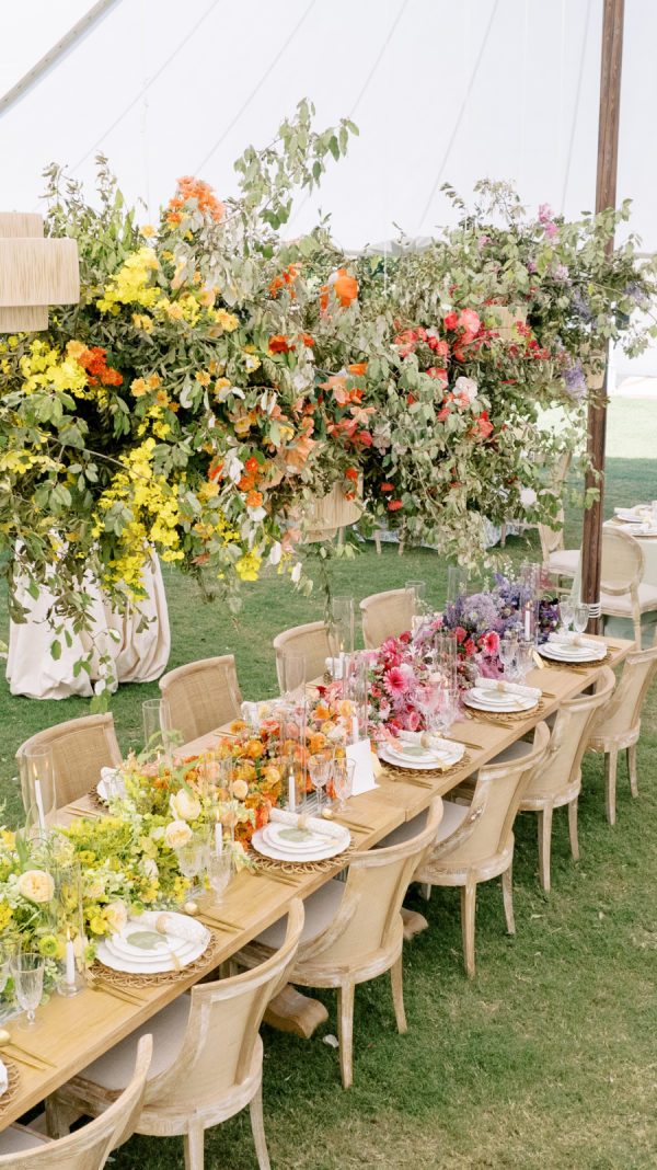 [field title=”Favorite Design Element”]This bold chic wedding table setting features a stunning combination of vibrant floral arrangements and elegant tableware. The long wooden table is adorned with a lush, colorful runner of flowers that transitions beautifully from yellow to orange, pink, and purple hues, creating a gradient effect that captures the eye. The flowers are complemented by the overhead floral installations, which add height and drama to the overall décor.[/field]