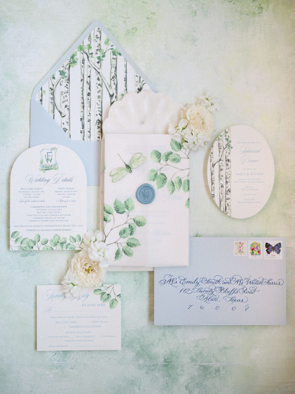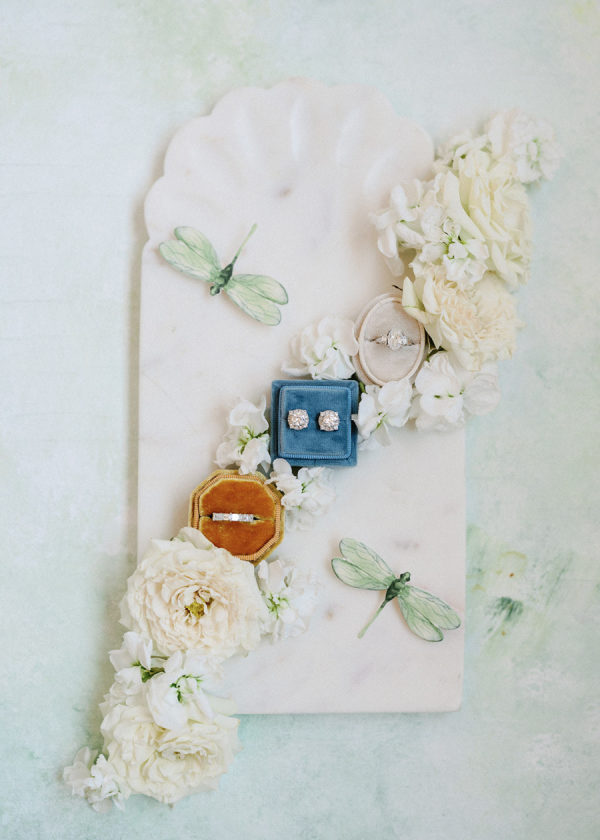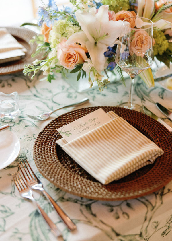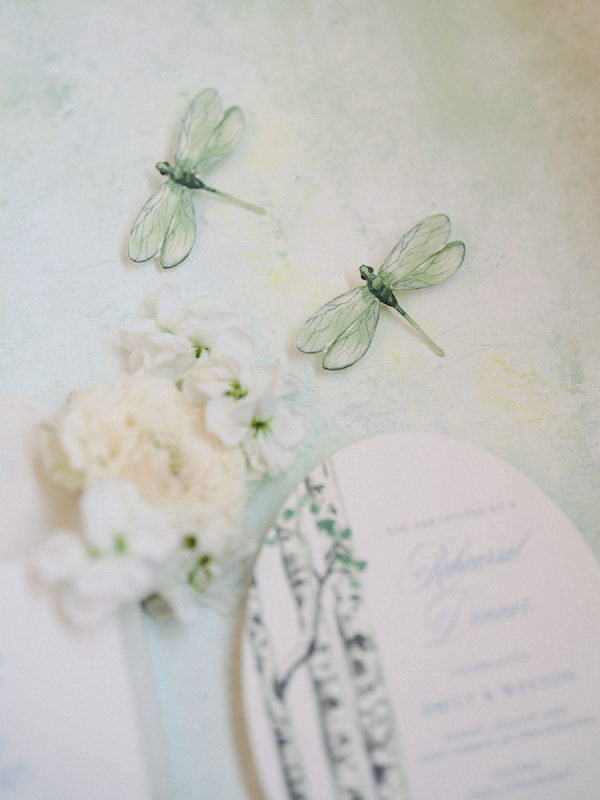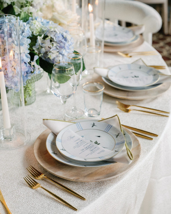 [field title=”Special Detail #1″]The bride selected dinner plates adorned with a delicate dragonfly motif, which became a subtle thread woven throughout the day. It was a quiet, thoughtful detail—symbolic and personal—that added depth to the design without ever distracting from the overall elegance of the celebration.[/field]