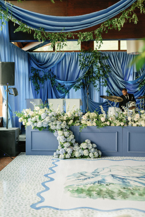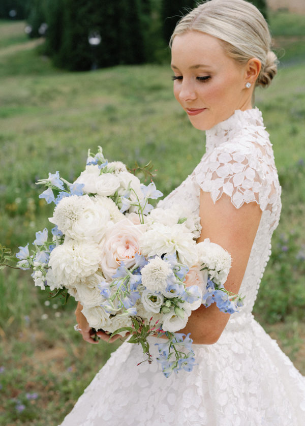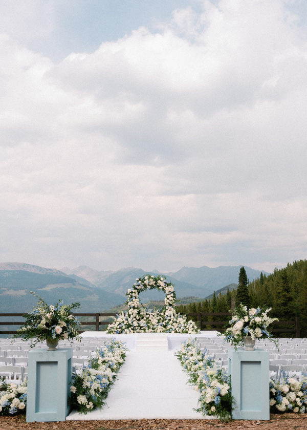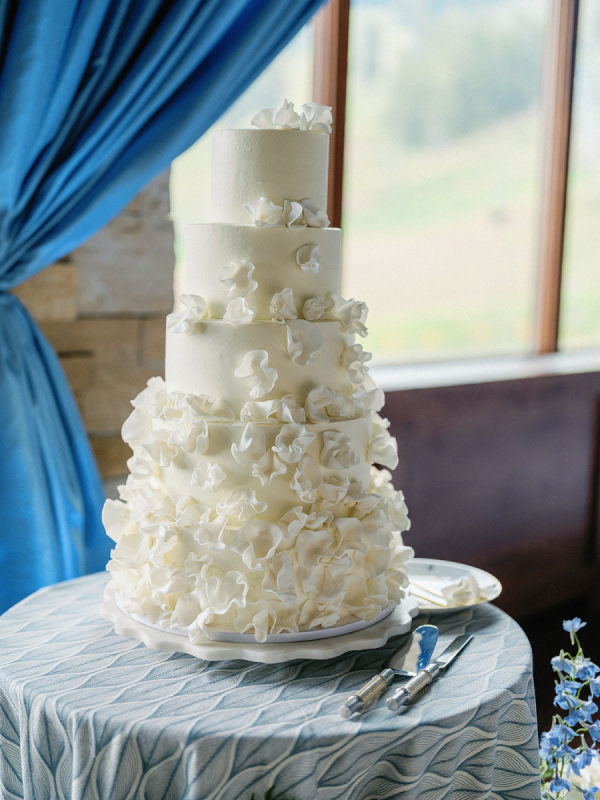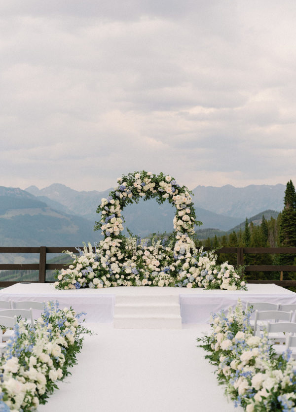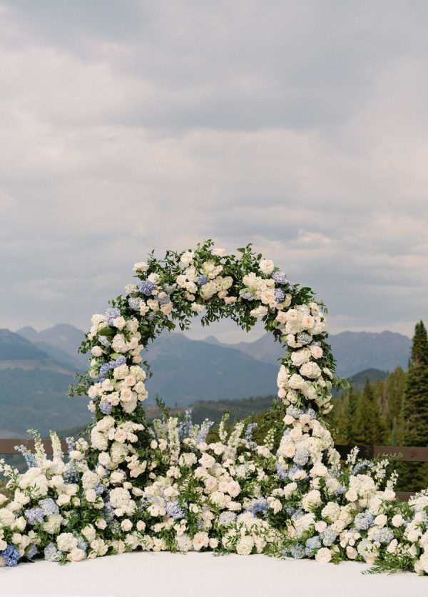 [field title=”Florals & Decor”]The floral design featured a soft mix of garden roses, dahlias, hydrangea, ranunculus, and delicate blue delphinium, layered with fresh greenery throughout. The palette felt light and romantic, with classic white blooms warmed by subtle blue accents—abundant yet airy, and perfectly in step with the mountain setting.[/field]