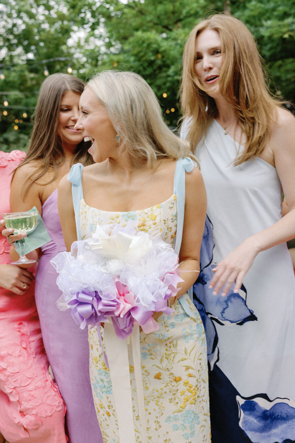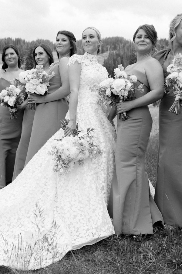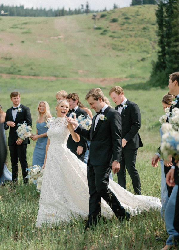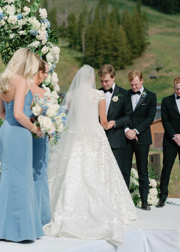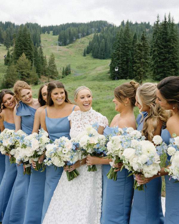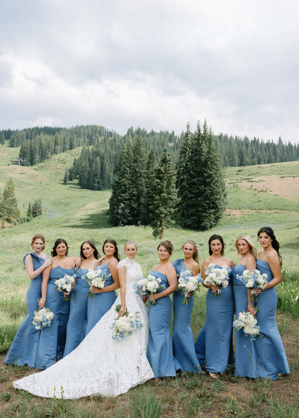 The bridesmaids wore classic blue gowns in varying silhouettes, creating a cohesive yet effortless look. The soft, tailored lines and muted tone felt timeless and elegant, perfectly complementing the mountain setting while allowing each bridesmaid’s individual style to shine.