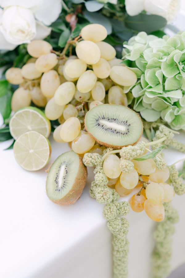 Ceremony flowers: White roses with lots of greenery, dinner with lots of greenery, and fruit arrangements.