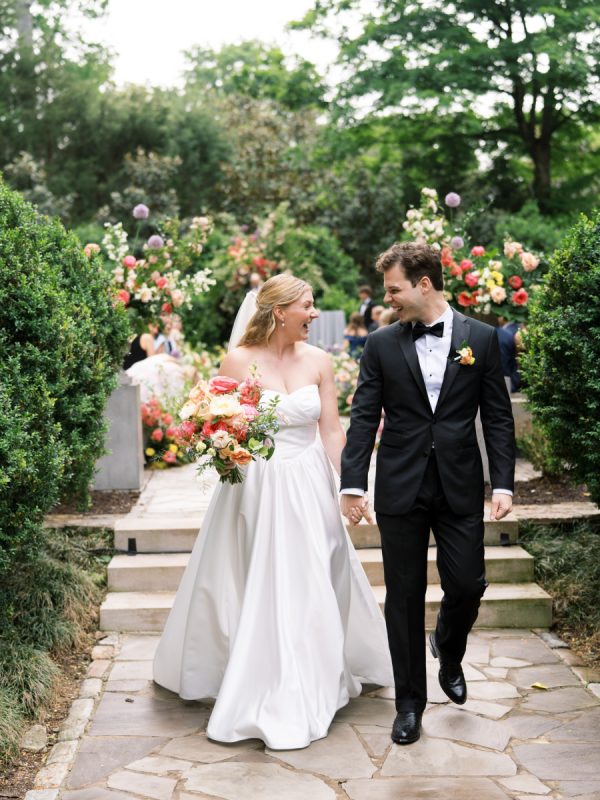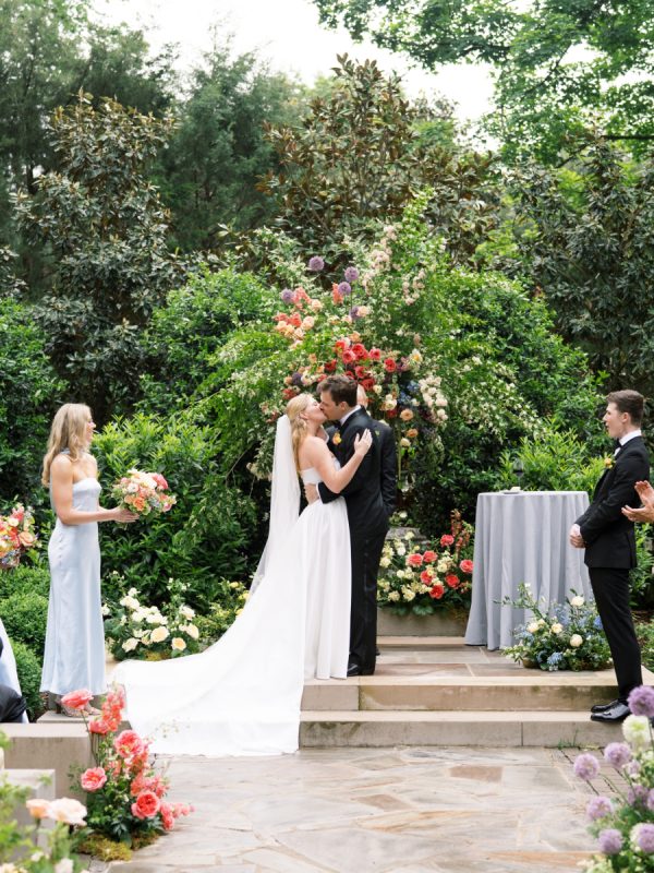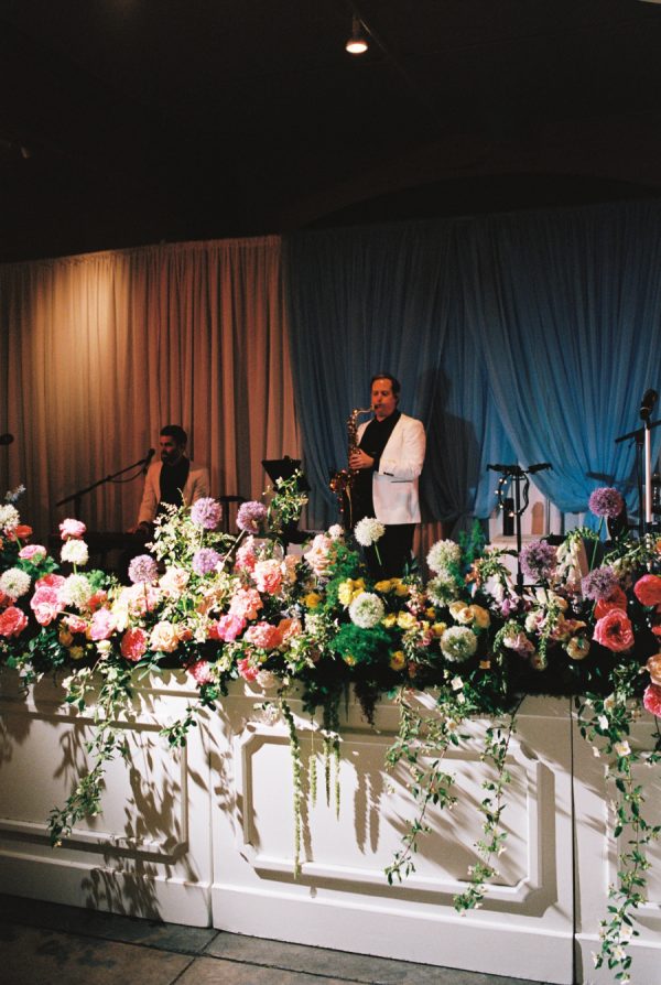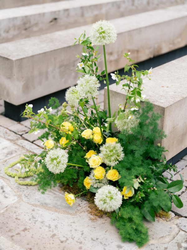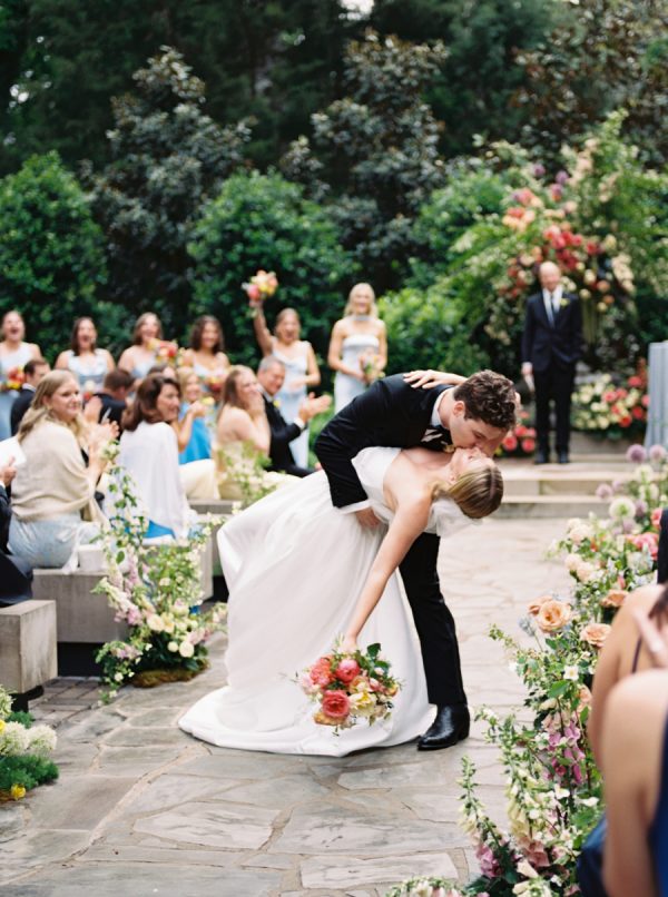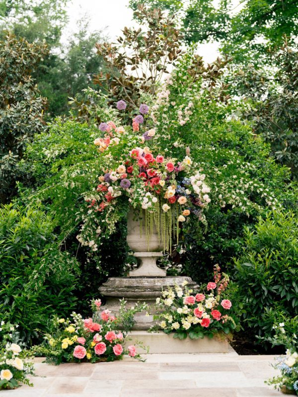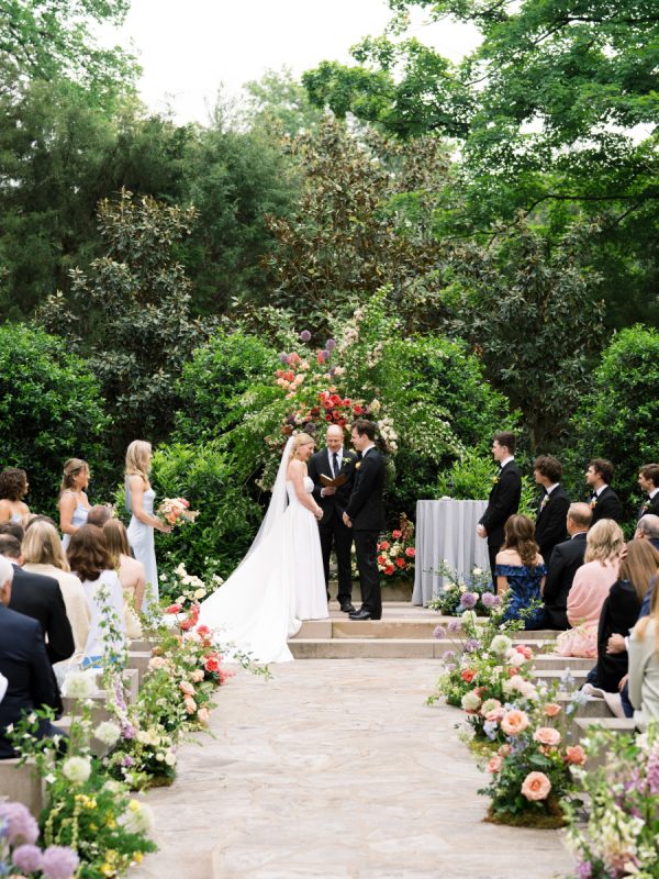 Vibrant floral arrangements marked each space, from ceremony to reception, highlighting this love of wildflowers. The ceremony took place on a stone platform in the middle of a lush garden, where flowers spilled from stone planters in artful, color-blocked designs.