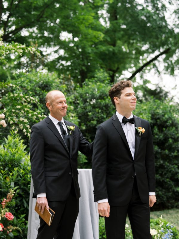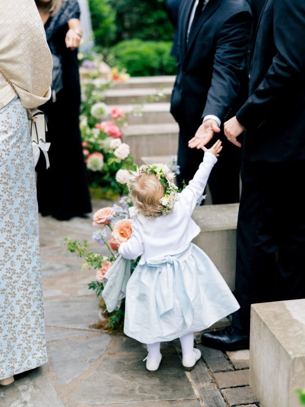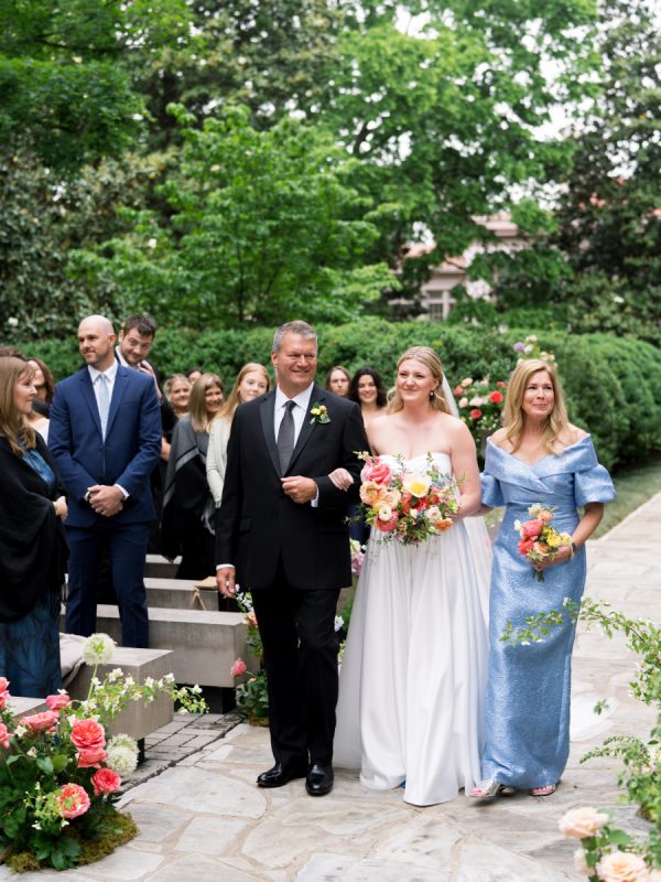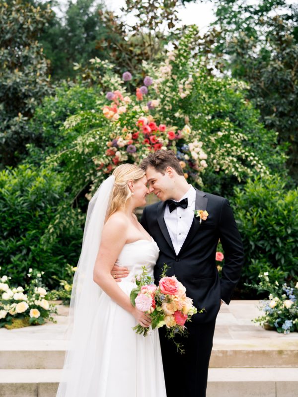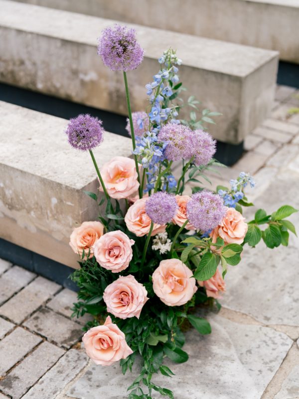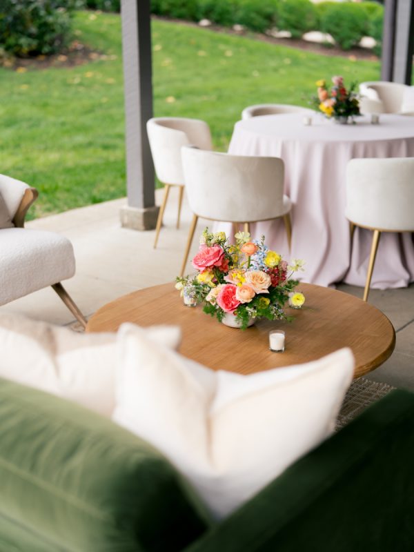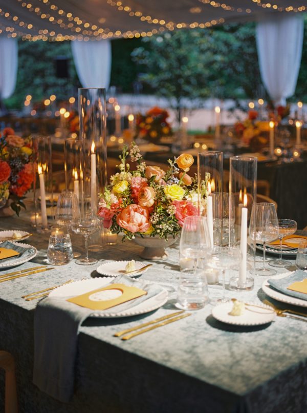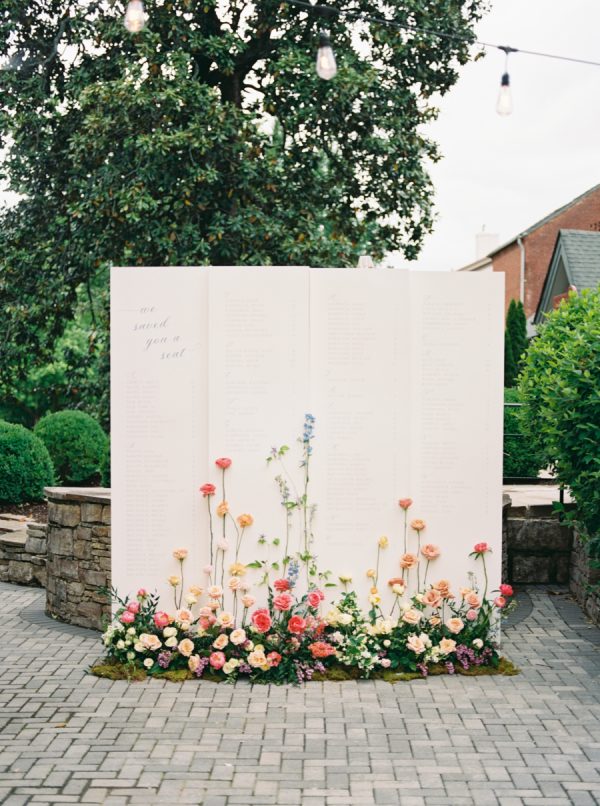 Vibrant floral arrangements marked each space, from ceremony to reception, highlighting this love of wildflowers. The ceremony took place on a stone platform in the middle of a lush garden, where flowers spilled from stone planters in artful, color-blocked designs.
