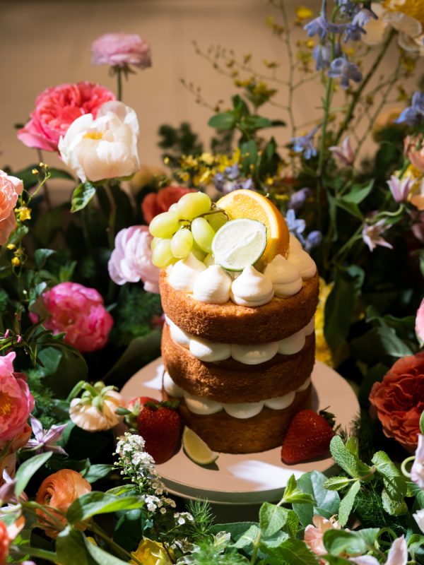 [field title=”Wedding Cake”]The couple’s stripped-down wedding cake featured fresh fruit decor like grapes, oranges, strawberries, and limes.[/field]