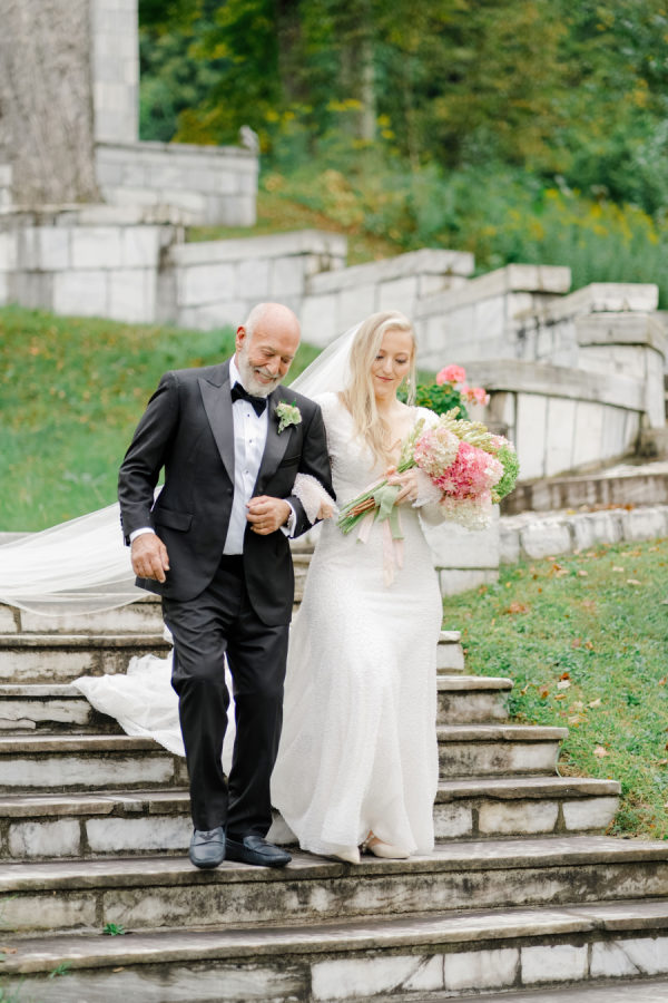 [field title=”Florals & Decor”]The Marble House gardens, built in 1815, set the tone for a day that felt historic yet deeply personal. The ceremony itself needed little more than the venue’s natural beauty: cascading marble staircases, lush late-summer blooms, and a sweeping view of the garden terraces. The bride, an opera singer and attorney who grew up just minutes away from the property, made her entrance from the very top of the staircase with a cathedral-length veil trailing behind her. A breathtaking, dramatic moment that felt straight out of a scene in a European garden. Adding even more meaning, some of the hydrangeas came directly from her mother’s garden, and her mother arranged one of the urn displays at the ceremony site herself.[/field]