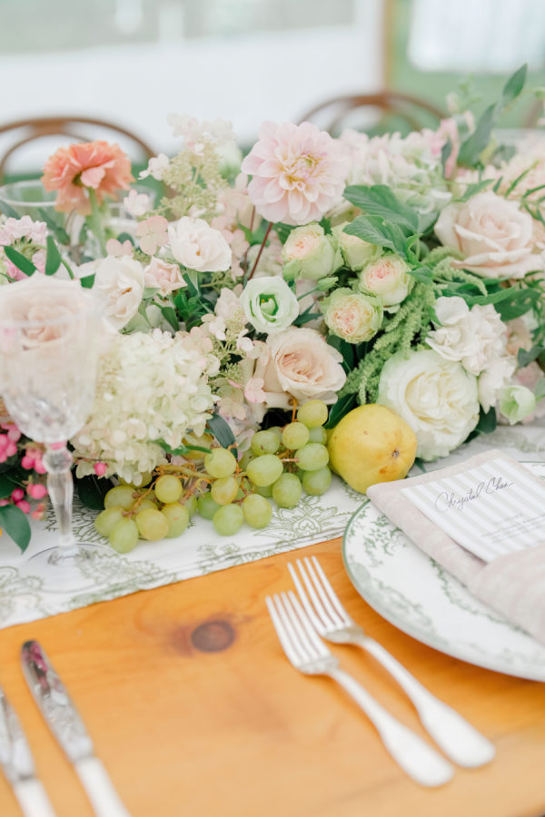 The palette centered around soft pinks and fresh greens, accented with creamy neutrals and natural wood. Hydrangeas, garden roses, and seasonal blooms carried the colors throughout. The most meaningful detail? The hydrangeas came straight from the bride’s mother’s garden.
