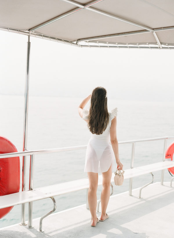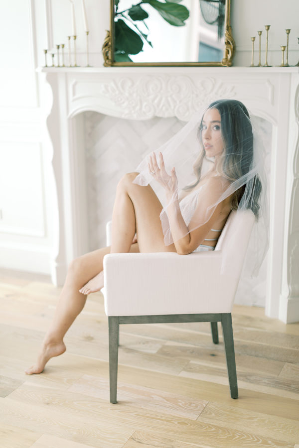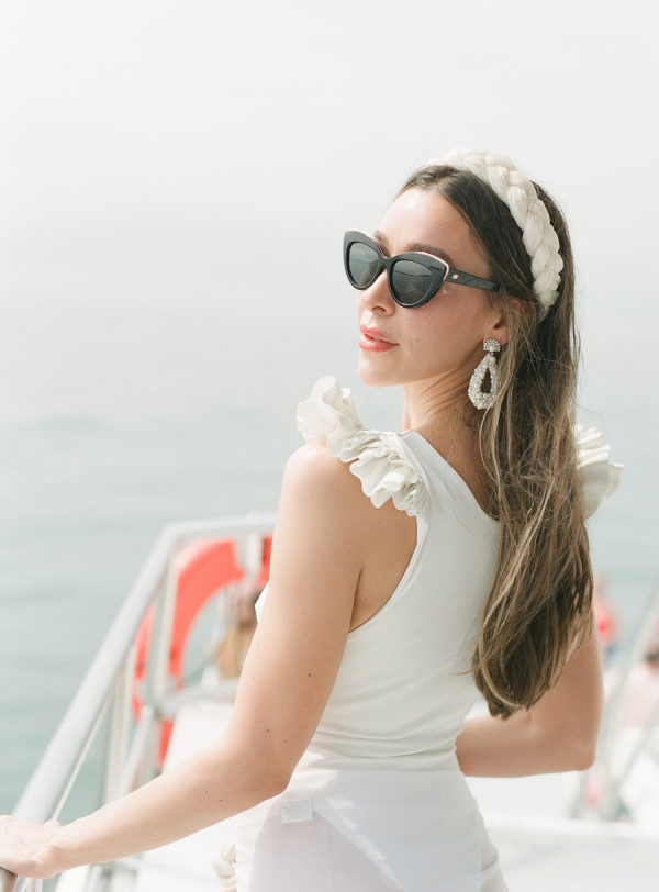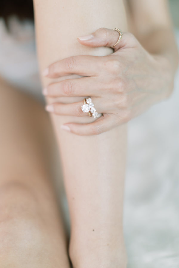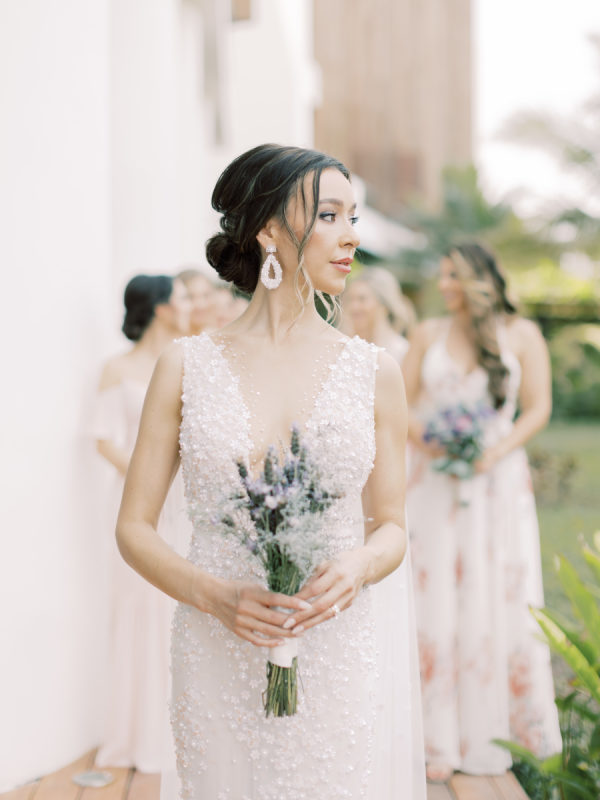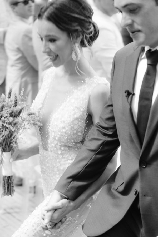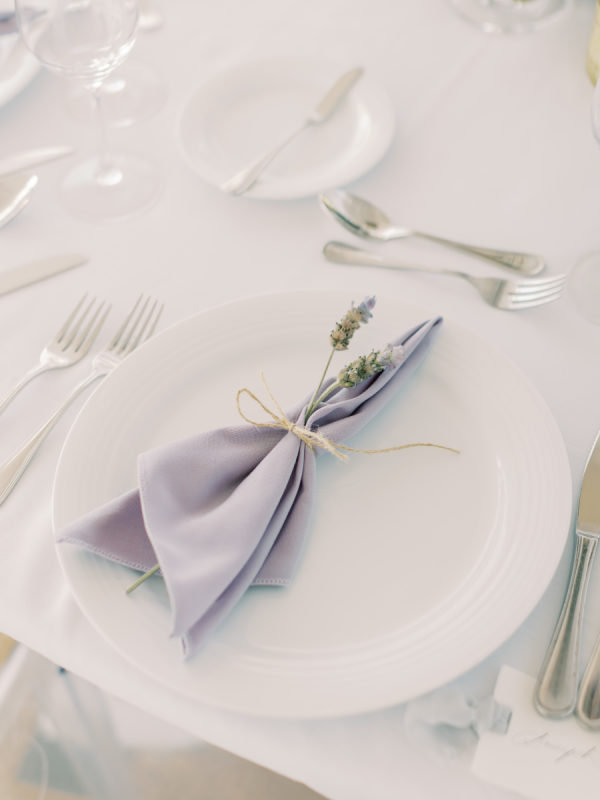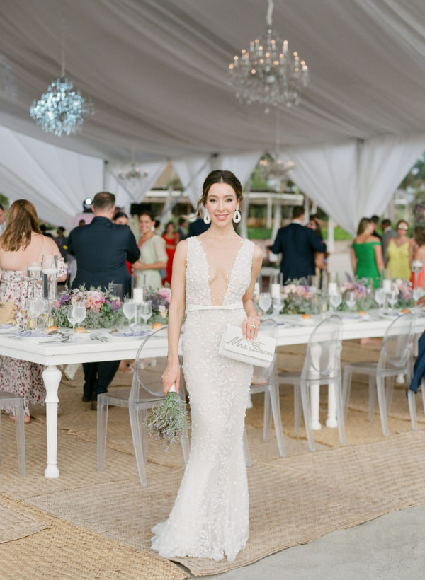 The couple wanted their wedding aesthetic to feel elevated, but still relaxed. Think “Vogue wedding photo shoot mixed with a picnic in a secret garden.” Keeping these ideas in mind, the couple mixed the two themes as they went! For example, her bouquet had a very ‘wild garden’ vibe, but her dress had a dramatic, softly-beaded cape. The tables were adorned with crisp linens, but each napkin was situated with a sprig of lavender tied with twine. Straw mats made up the floor under the tent, while chandeliers hung from the ceiling.