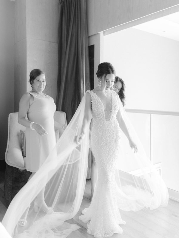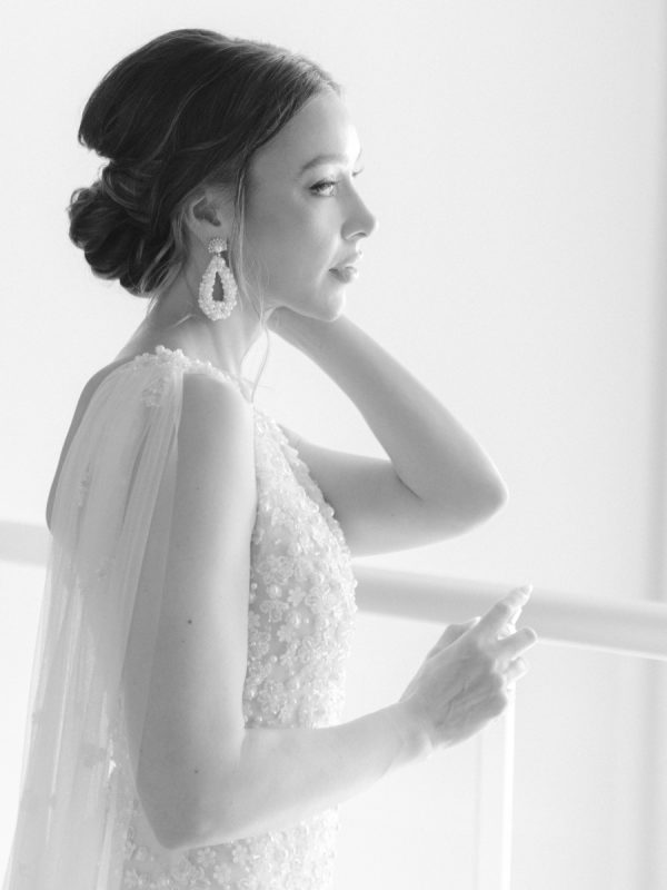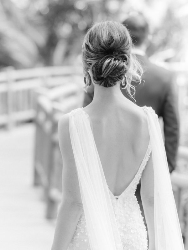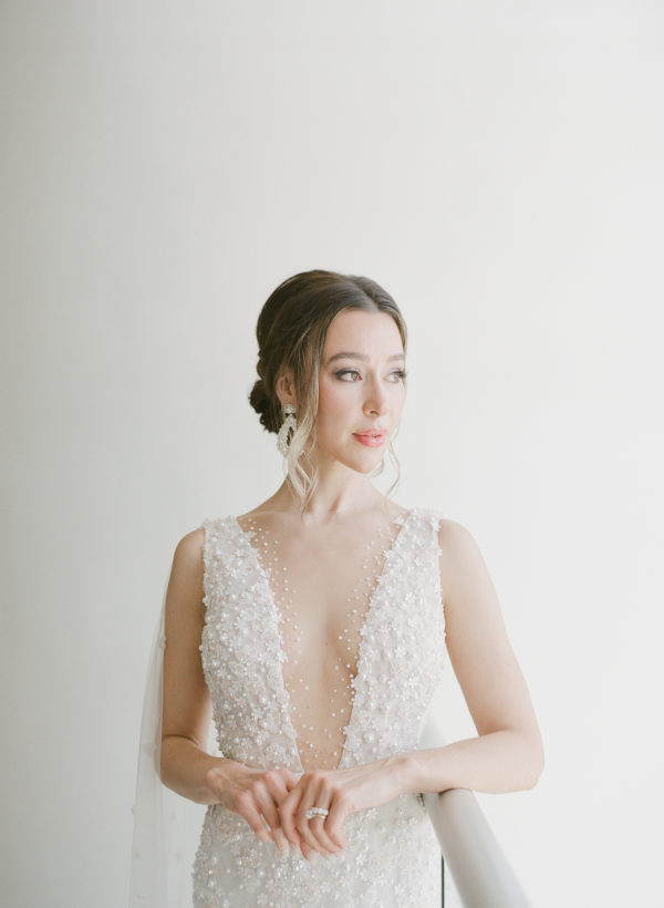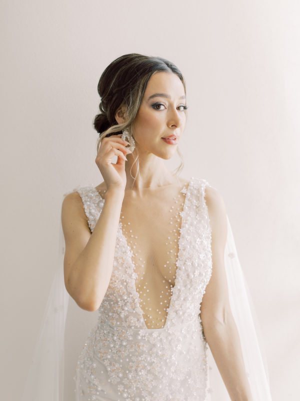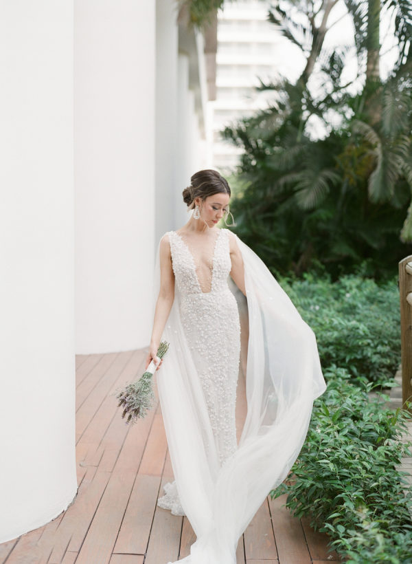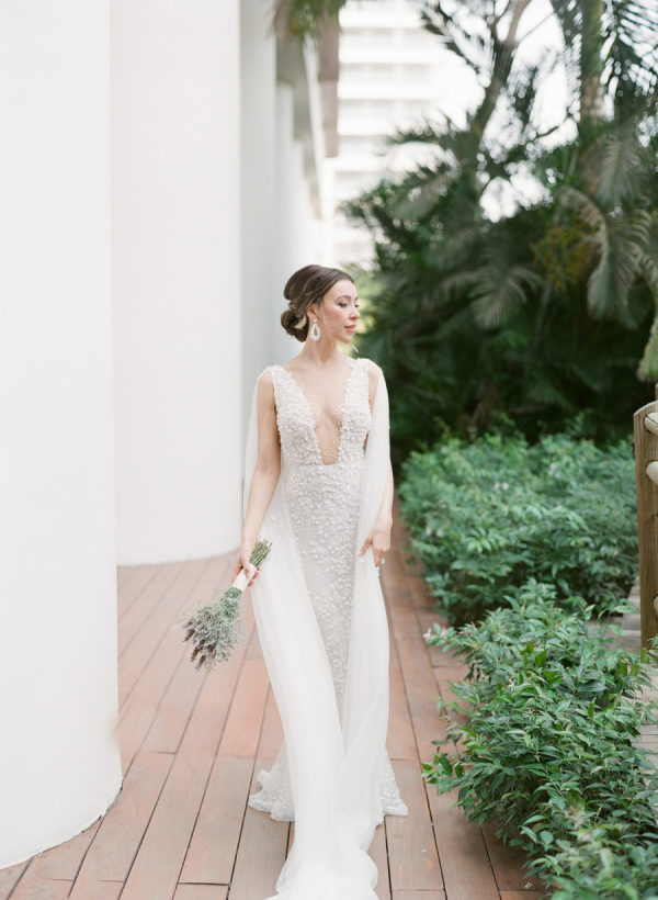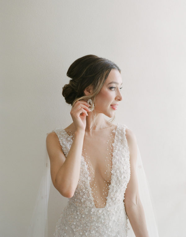 The bride wore a stunning gown by Lee Grebenau adorned with a dramatic, softly-beaded cape.