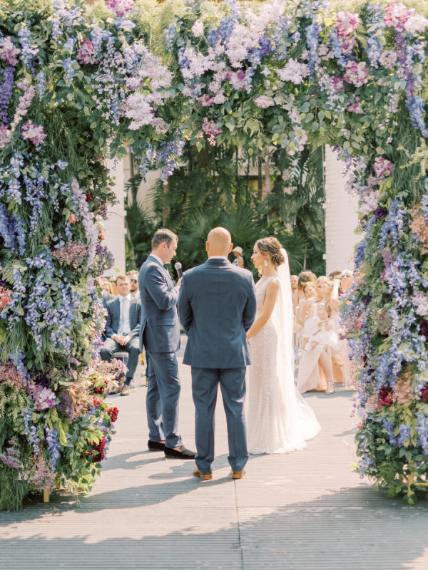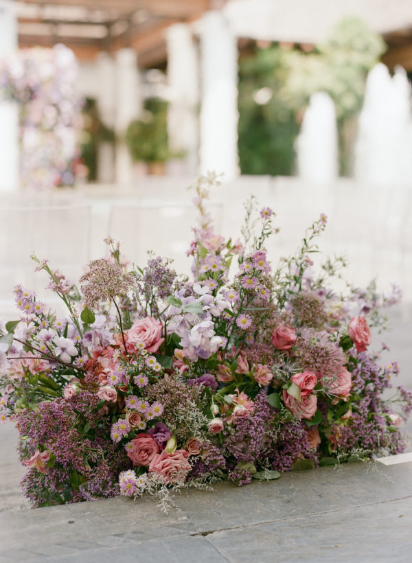 Modern romance was the theme here, with a beautiful blending of delicate pastel hues with rich jewel tones. The breathtaking ceremony arch is a cascade of blooming wisteria, roses, and hydrangeas in shades of lavender, blush pink, and deep burgundy, creating a whimsical yet opulent atmosphere. Verdant greenery weaves through the arrangement, adding depth and texture to the design.