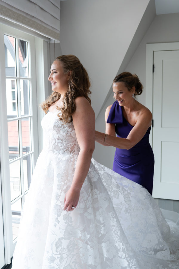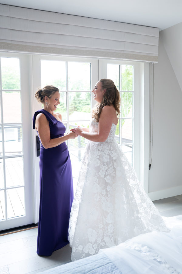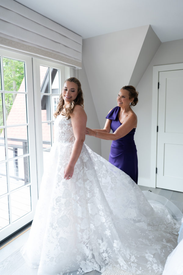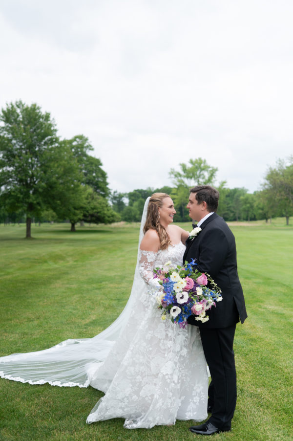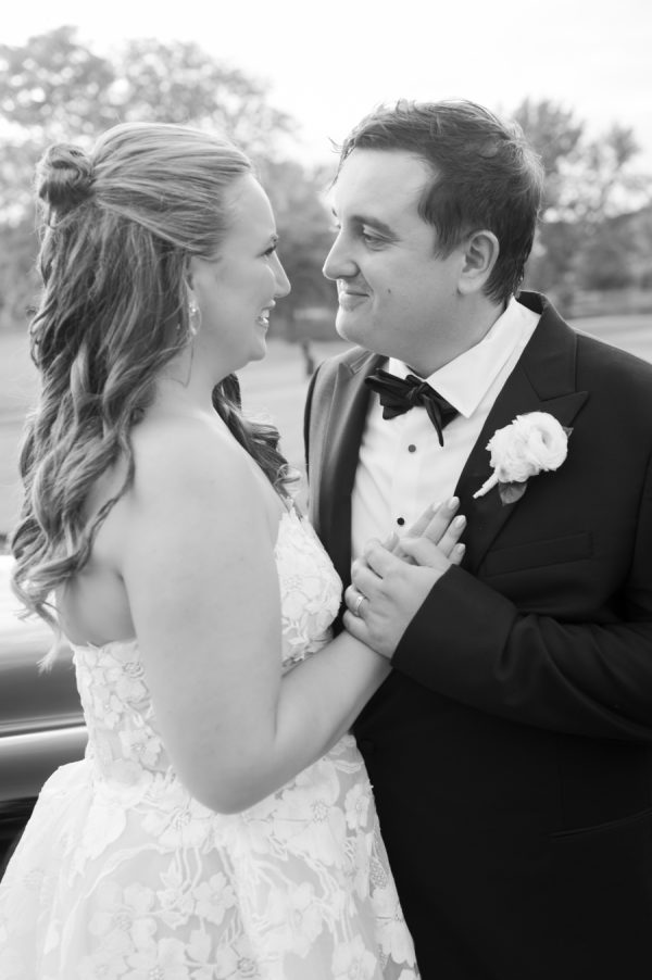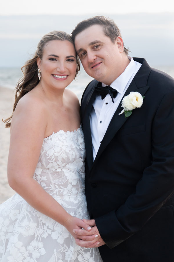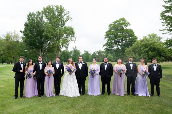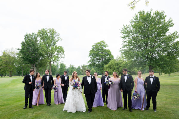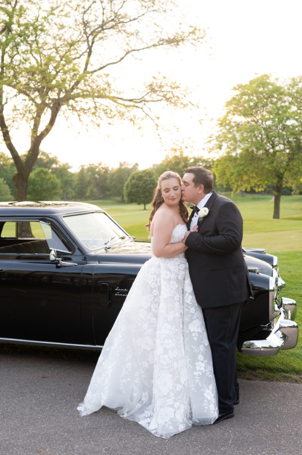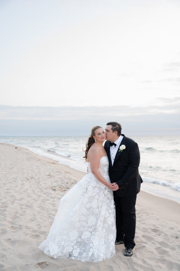 When it came time for sunset photos, the couple wanted photos both on the golf course and at the beach. The couple was able to travel in style thanks to the Studebaker Museum, which provided a vintage Studebaker car for the occasion. The classic black color and style matched Chris’s slick tuxedo. The contrast created by Brooks’ white gown resulted in every image looking like they just walked off a Hollywood movie set. Brooks’ family home is nestled right on Lake Michigan. Brooks has so many happy memories of spending countless days at the beach with her whole family, including her father, who had passed away. Being able to take photos on the beach that meant so much to Dadra was one of the highlights of the day. It was almost kismet that the clouds turned blueish-purple, their exact wedding colors. Brooks knew that that was her dad, smiling down on her. It just doesn’t get any better than that.