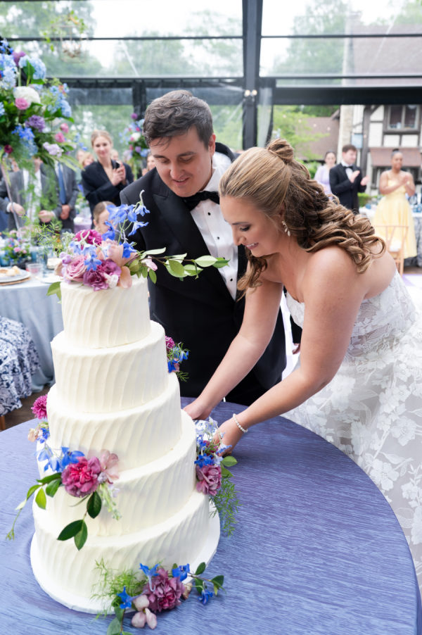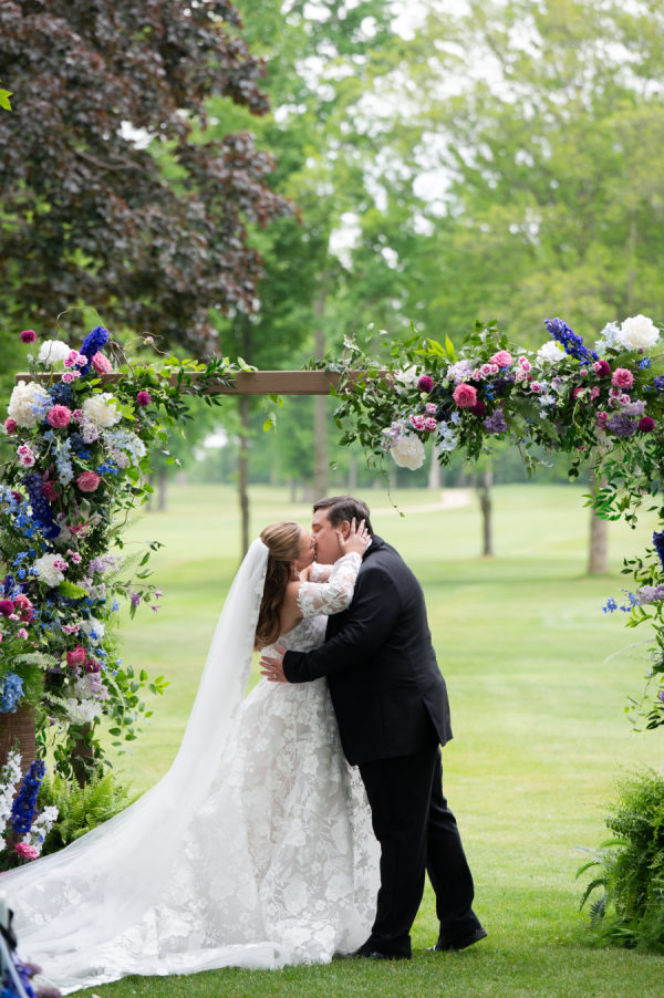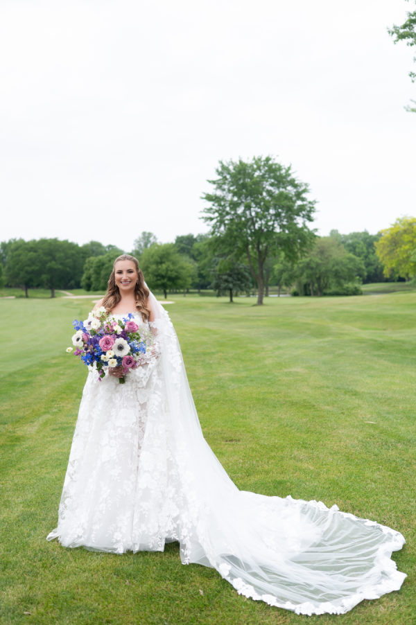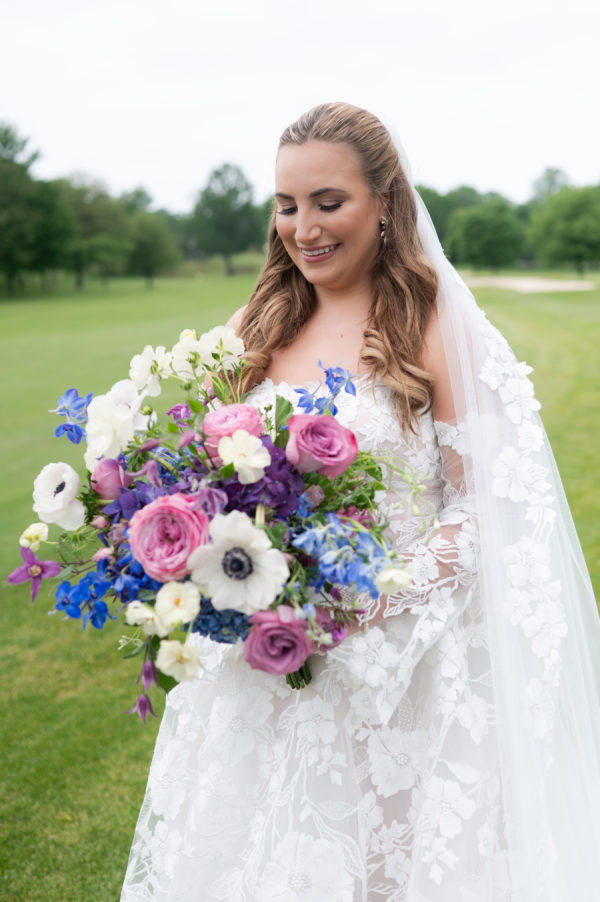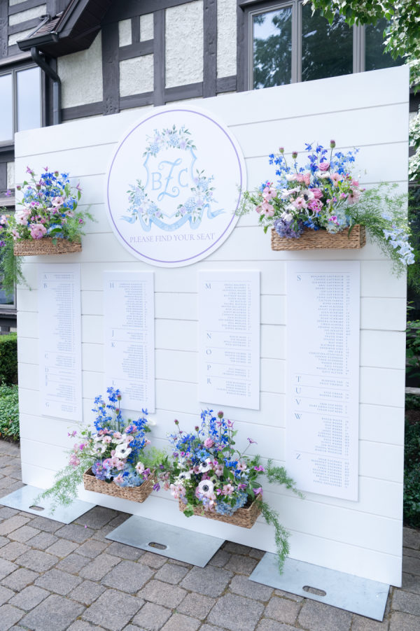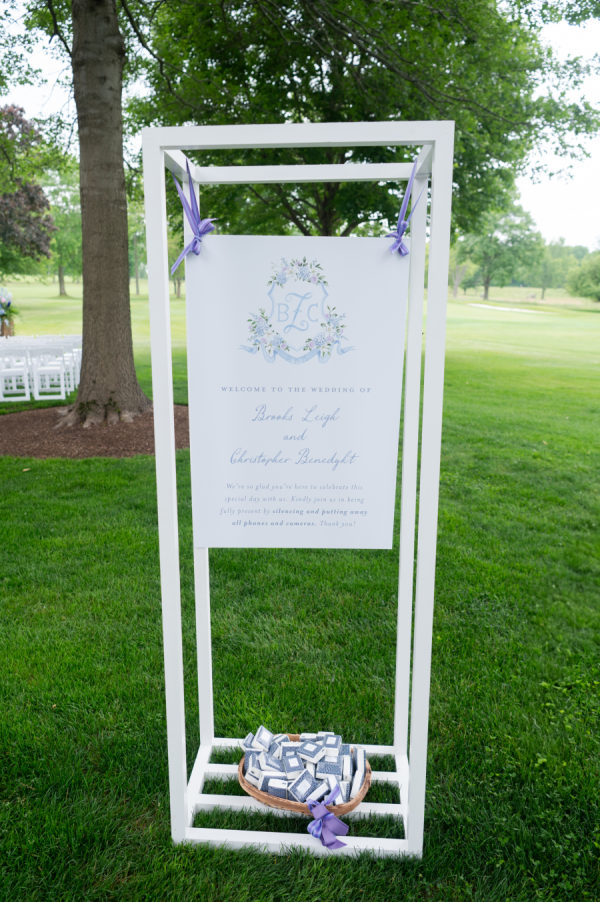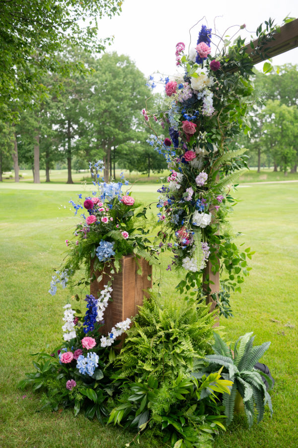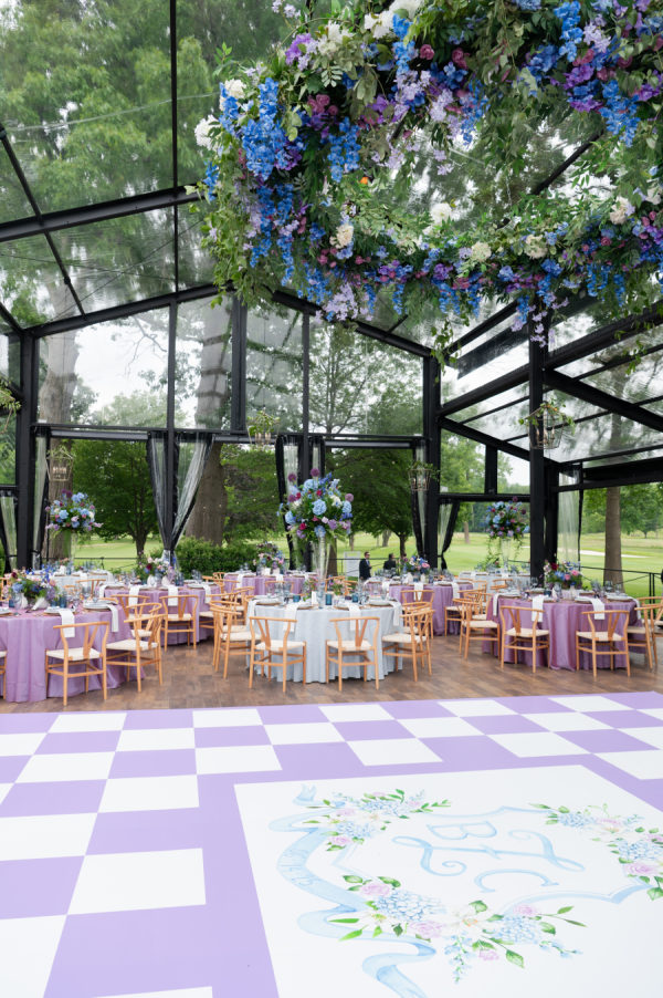 The florals and decor were essential in creating the enchanted garden that the couple dreamed of. Starting with the ceremony, guests were immediately greeted by the custom welcome sign as they entered the space. Rows and rows of floral arrangements led up to the beautiful ceremony arch that Merry Me had made. The combination of the beautiful golf course, tall trees, and colorful flowers turned this ceremony into a fairytale garden. As guests moved into cocktail hour, each decor element immersed the guests in Chris and Brooks’ fairytale garden. The handcrafted shiplap escort wall, complete with floral boxes, and the custom monogram, which appeared on the bars, escort wall, dance floor,r and invitations, showed how dedicated this couple was in creating a unified theme throughout their day. After walking up the wooden steps into the atrium tent, you were immediately greeted by the large floral ring andlanterns hanging from the tent ceiling. The whole dance floor was wrapped in lavender and white squares, with Brooks and Chris’ monogram in the center. Each table adorn unique linens and flatware. The wicker chairs and matching chargers were a great way to incorporate that woodsy feel without overpowering the table with darker tones. The centerpieces consisted of tall, glass arrangements or small floral bunches, kept in ornate, white vases that reminded me of a country garden. Each design, including the bouquets, had an arrangement of garden roses, delphinium, hydrangeas, butterfly ranunculus, alliums, roses, and anemones.