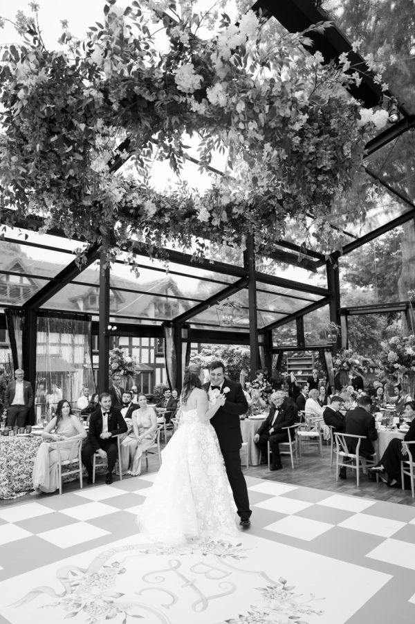 The couple’s vision for their wedding day was an Enchanted Garden. They wanted to walk into the space and be surrounded by color, tons of beautiful florals, and personalized touches that really spoke to who they are and what they love. A custom monogram was created and implemented throughout the design, and sprinkles of their dog, Ziggy, appeared on personalized items, such as the napkins and signature drinks. Merry Me took the couple’s vision and created a real-life fairytale, complete with stunning floral designs, custom bars and seating chart, gorgeous linens, beautiful ceremony arch, and so much more. To bring this gorgeous garden feel inside, a stunning, black-framed atrium tent was constructed on the grounds of Chikaming County Club. Blue Peak Tents created a space where the guests were able to be indoors for dinner and dancing, yet retain that immersive outdoor garden feel. The guests were able to dance the night away under the stars since all the sides, including the roof, were clear.