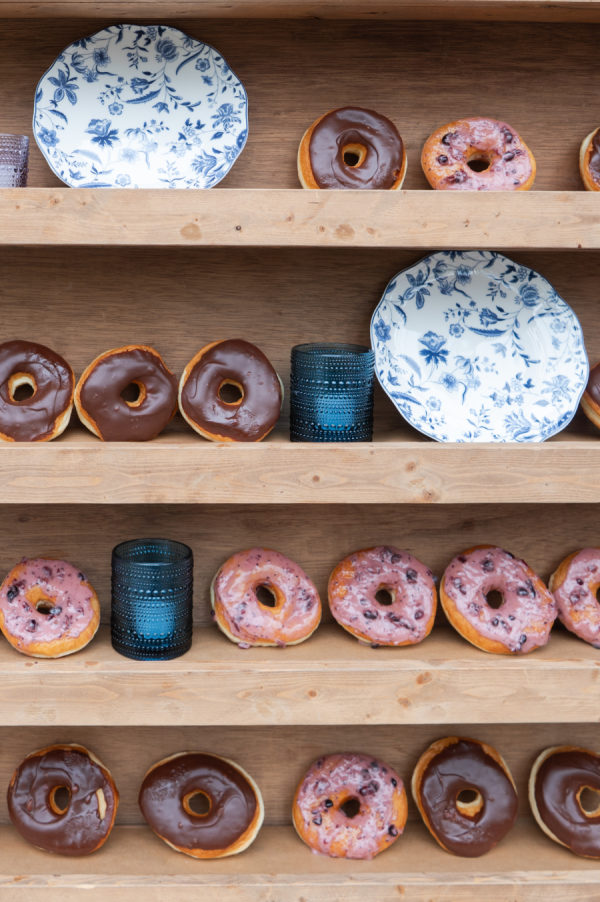 Black Currant Bakery created the most elegant cake for Brooks and Chris. This 5-layer cake was frosted in a wave pattern, giving the cake movement and depth. Florals were added to elevate the look and bring pops of color to this stunning white cake. Black Currant also provided the signature donuts at the reception. These are the bride’s absolute favorite donuts, so Merry Me constructed a donut wall to display them and add to the fun of the decor. Later on in the evening, Beaver’s Donut Truck arrived, serving adorable donut holes in to-go bags so guests could take them home. However, the majority of the donut holes were found on the dance floor as guests rocked out to Blue Water Kings, donut in hand.