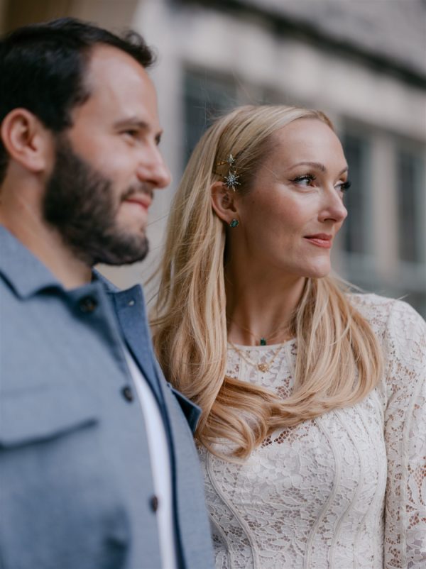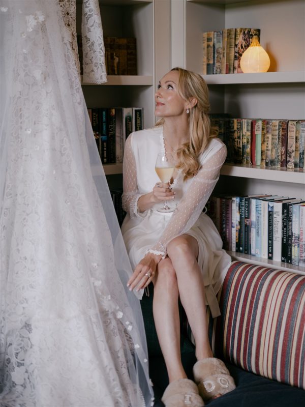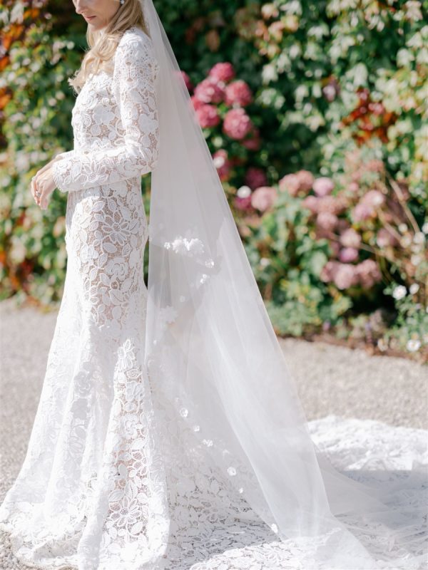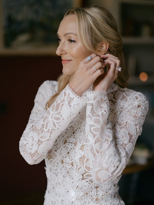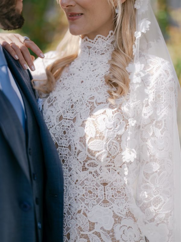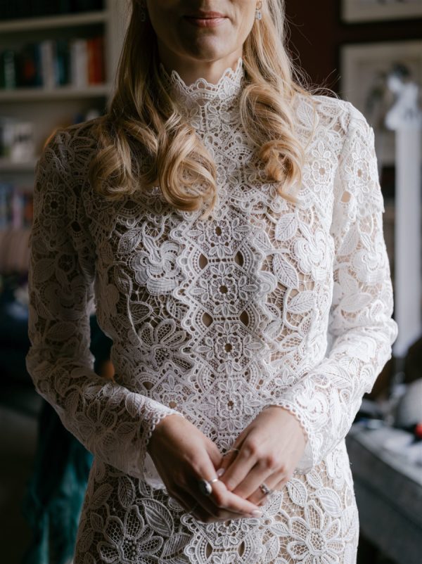 Right after we were engaged, I saw a beautiful high-neck floral lace dress on a Costarellos model, and I knew I had to have the dress. However, I emailed the company, and they said no boutique stores in the U.S. carried the sample. Costarellos is based in Greece. I was so disappointed, but then I found a boutique in Los Angeles, LOHO Bride, which said they would ship the dress sample from Greece to their store for me to try on. As soon as I tried it on, I knew it was THE ONE! I was so excited. It was the only dress I tried on and looked at. Costarellos handmade the dress for me in my size. My dress for the welcome dinner, evening reception dress, and my brunch dress for the day after the wedding were all by Zimmermann.