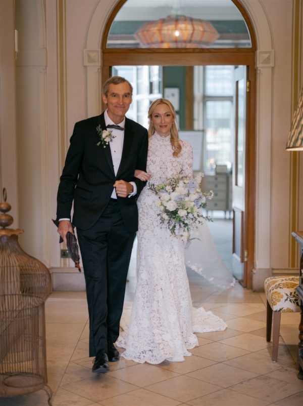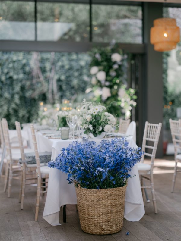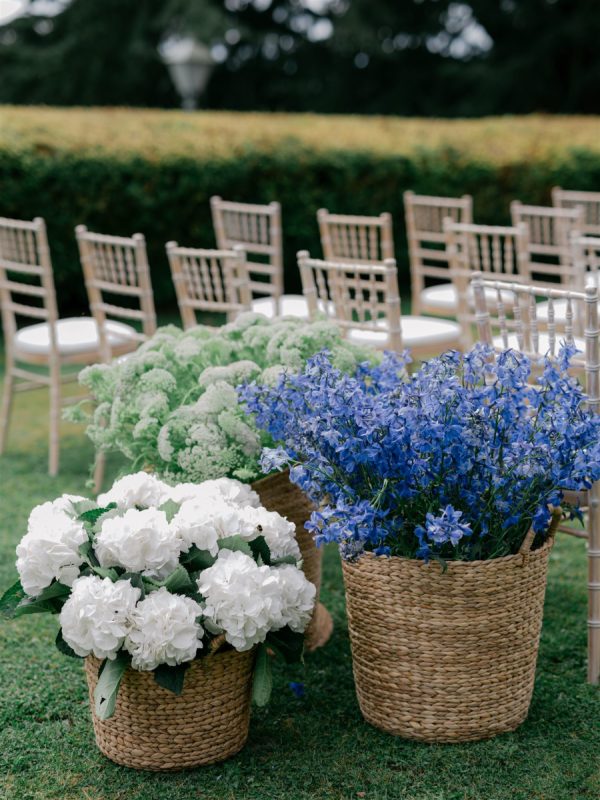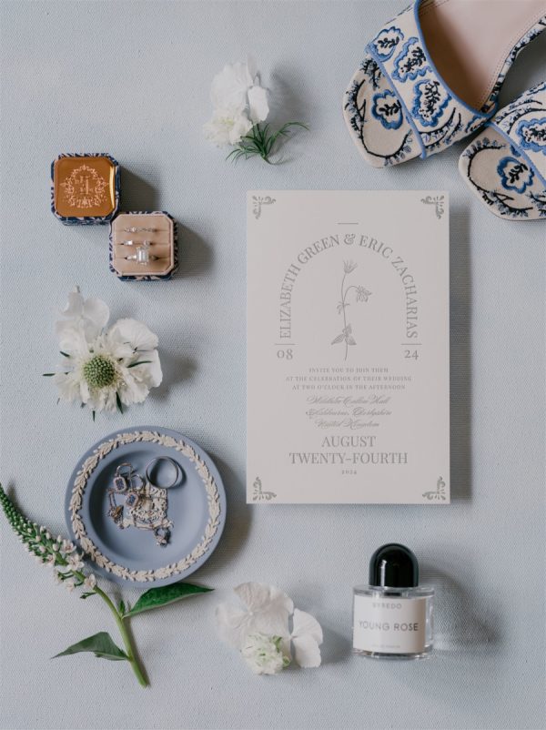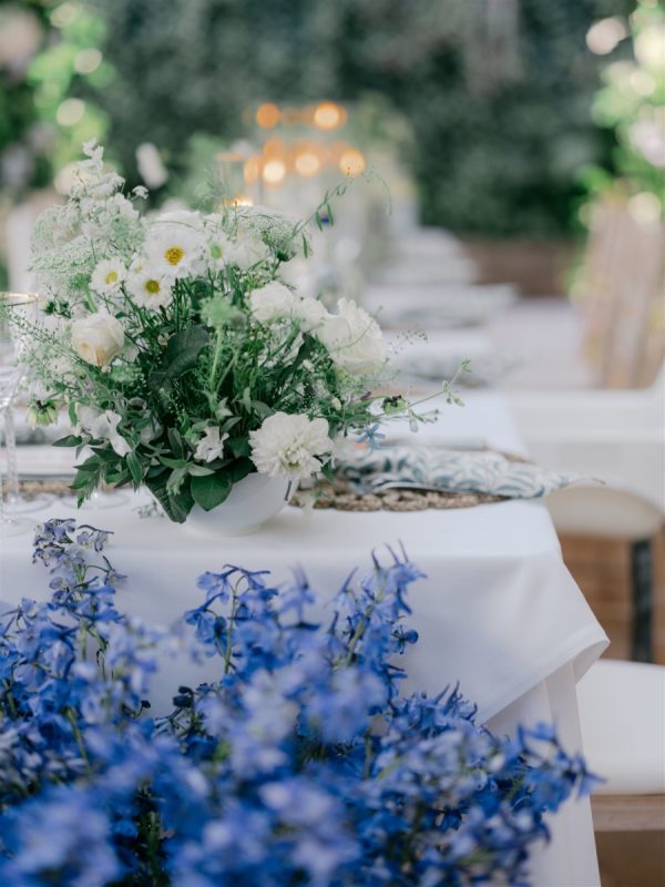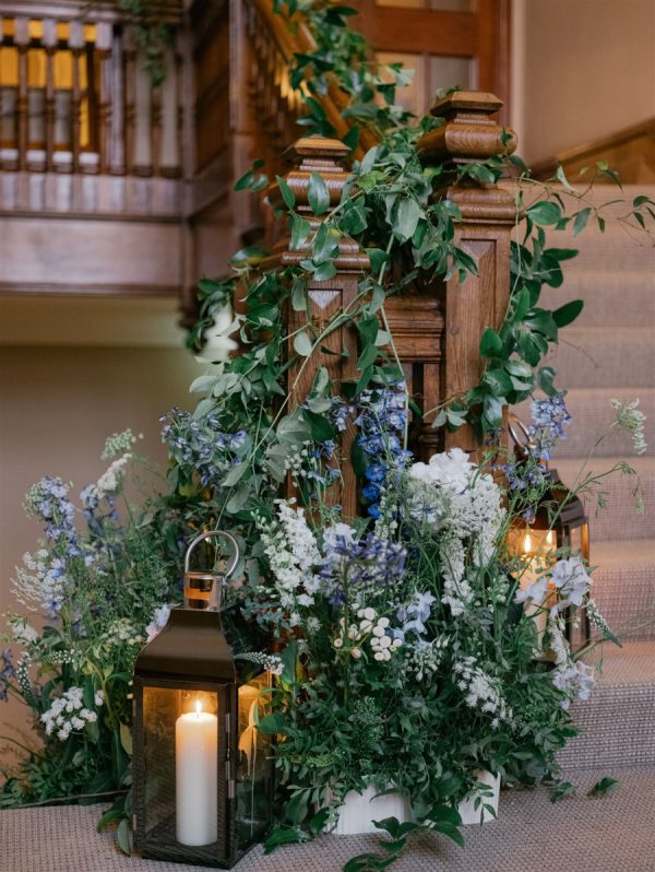 For the flowers and decor, we wanted blooms locally sourced in the English countryside, and we wanted a whimsical, romantic, elegant, and quintessential English Garden look. We did beautiful Wedgewood blue delphiniums, white roses, larkspur, Canterbury bells, hydrangea, and my absolute favorite-Queen Anne’s lace. My favorite part of the florals was the way the florist, Meadows and Mulberry Weddings, dressed the staircase inside Wildhive. As guests returned to their rooms, they were greeted by a beautifully decorated floral staircase with lanterns. It was magical. Also, we gave dried white larkspur petals to the guests to throw when Eric and I walked back down the aisle, and it made for some really beautiful wedding pictures. For the decor, we did a lot of baskets filled with lush flowers to really make our English Garden vision come to life. For our table decor, we had William Morris printed napkins, rattan floral placemats, and tapered candles in a variety of green hues that helped create an elegant and romantic look. Village Green Events, our event designers, helped source all of these elements. My favorite part of the decor was the hand-painted place cards my mother painted for each guest’s seat. These place cards had each guest’s name with a beautiful botanical floral design. These were the final touches!