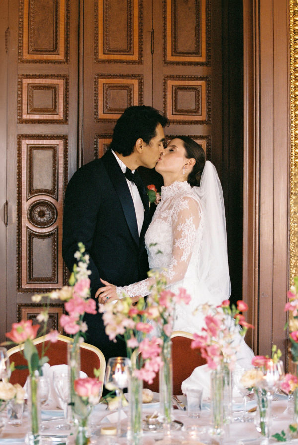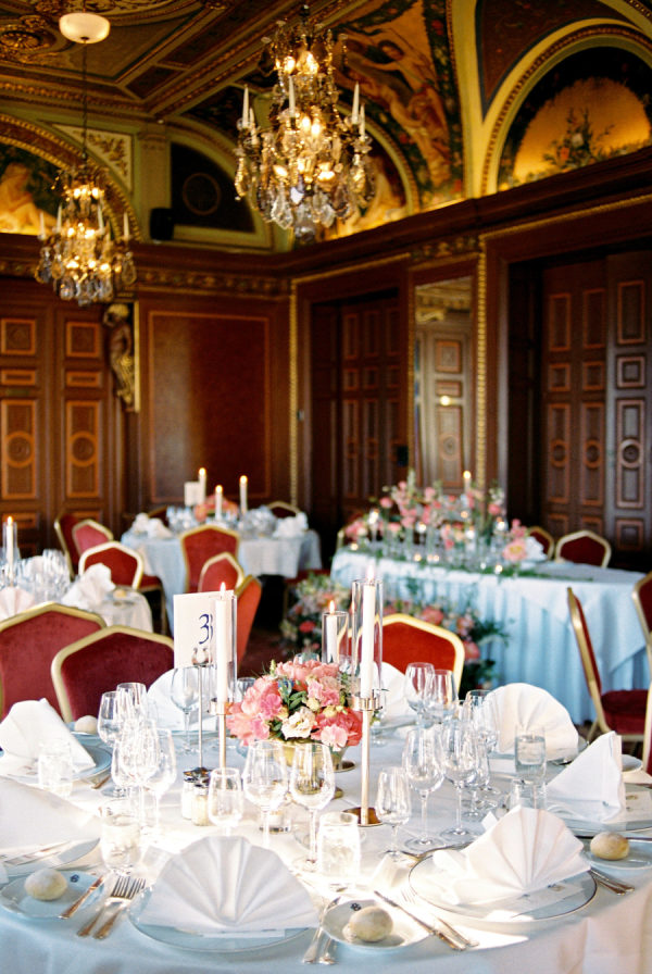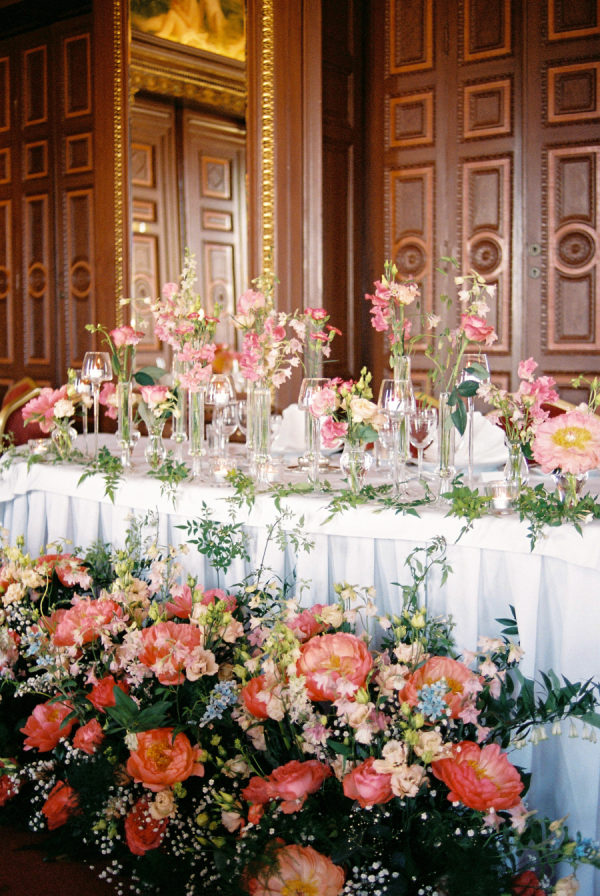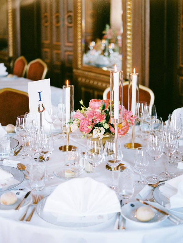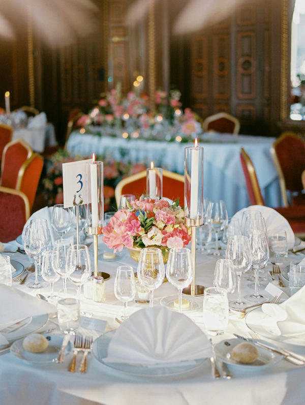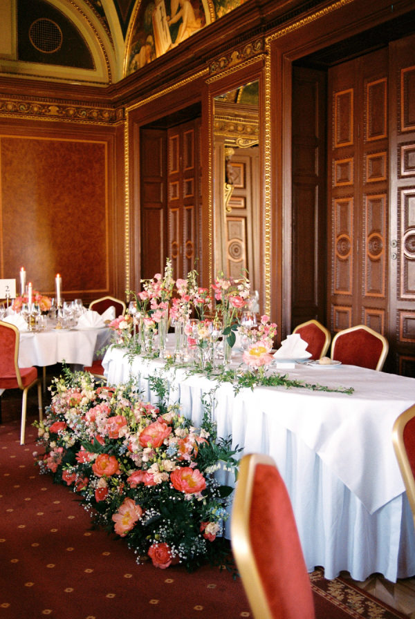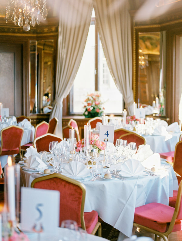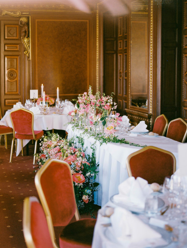 [field title=”Florals & Decor”]The florals were designed with Anna’s love of red at the heart. Scarlet, coral, and blush blooms were paired with gold vessels and tall, glowing candles. Against the ornate wood-paneled walls and frescoed ceilings of the Grand Hôtel, the flowers became both vibrant and regal, striking the perfect balance between opulence and intimacy.[/field]